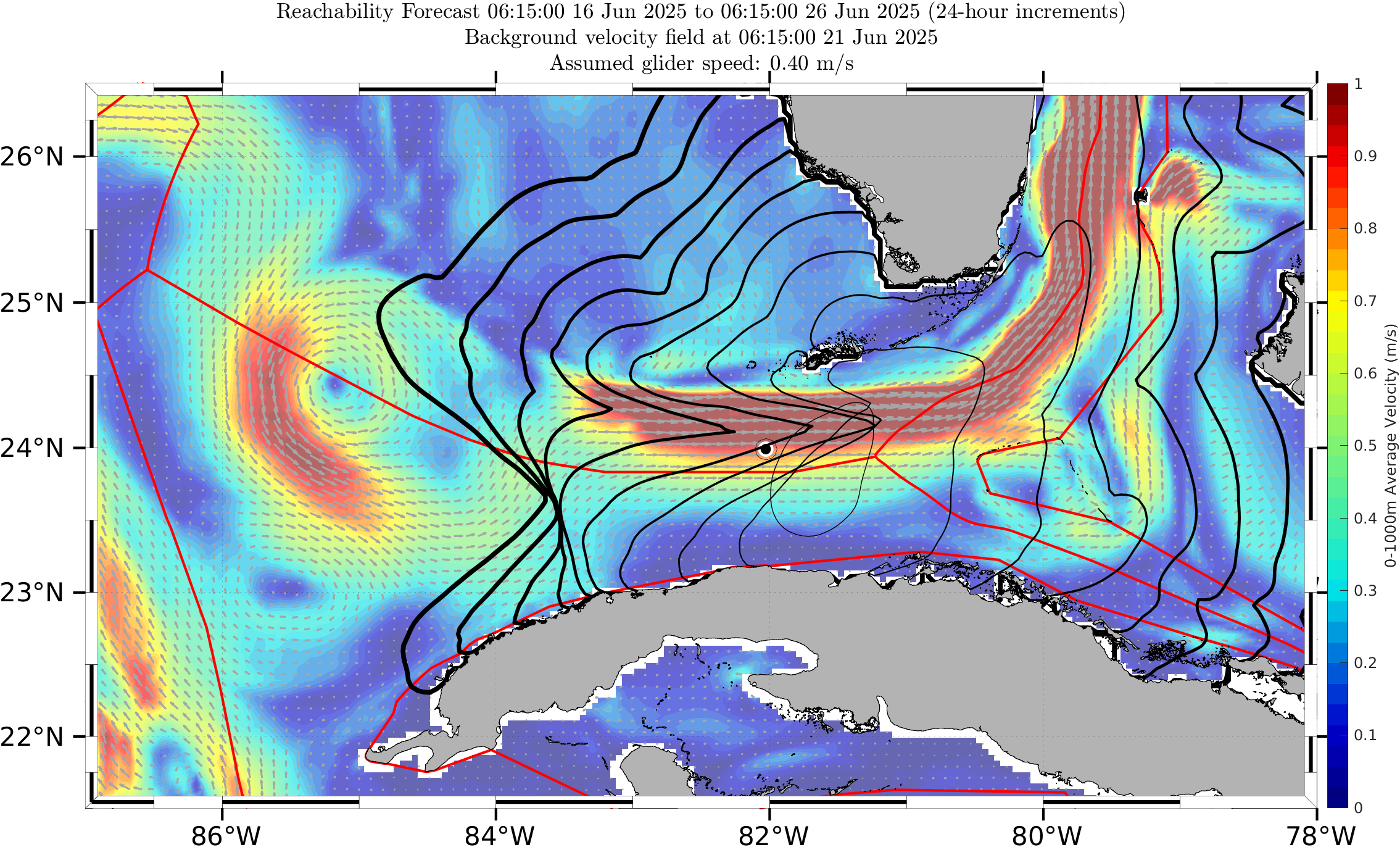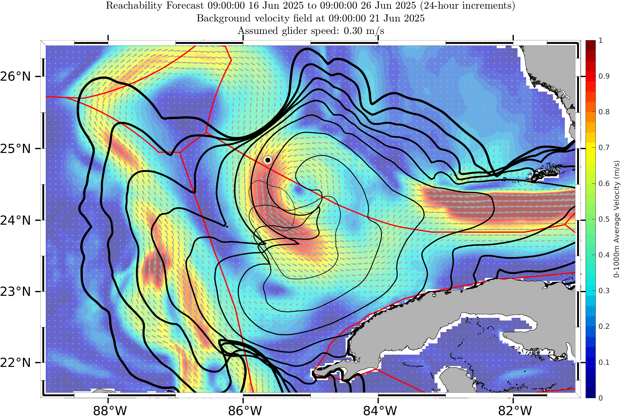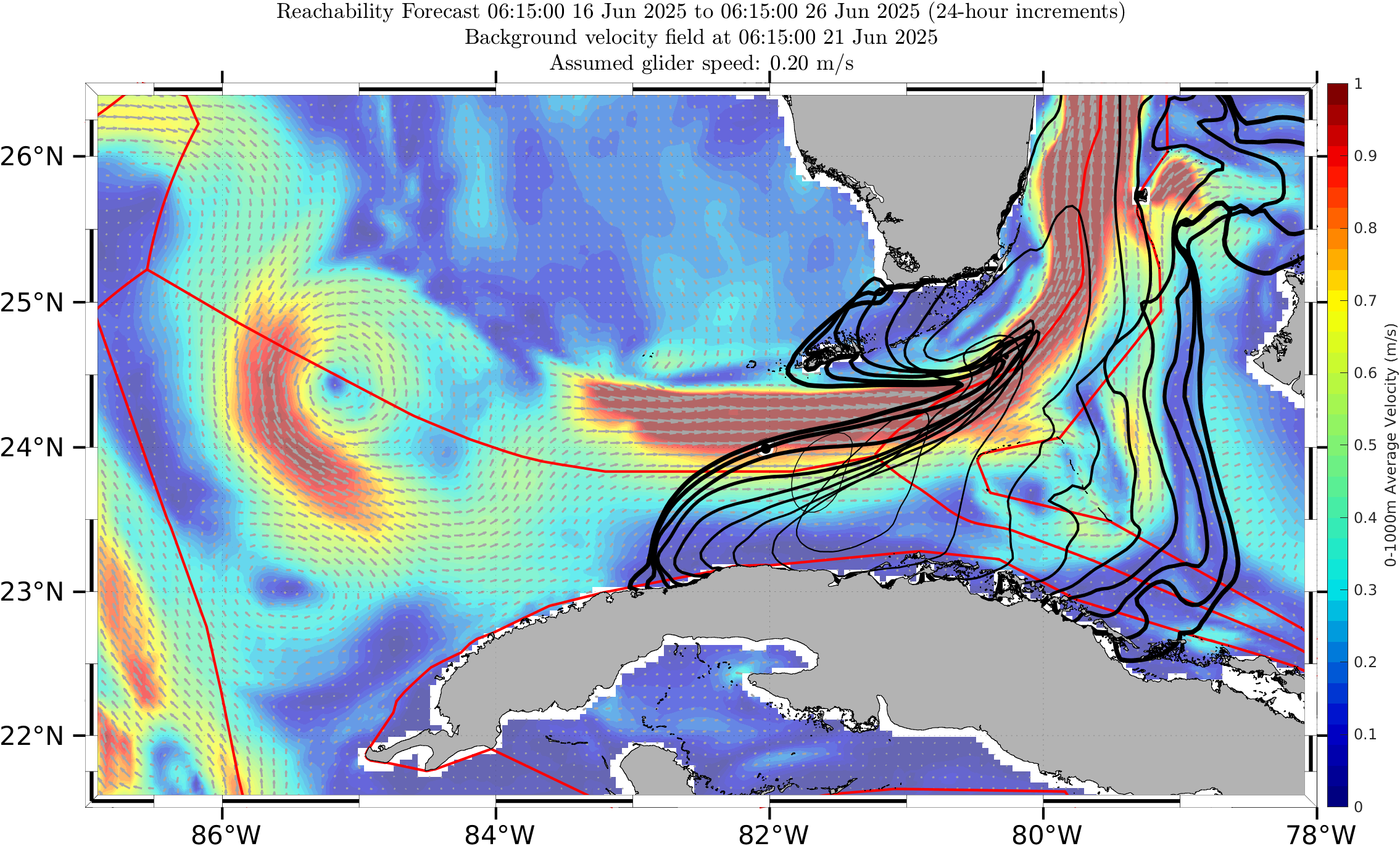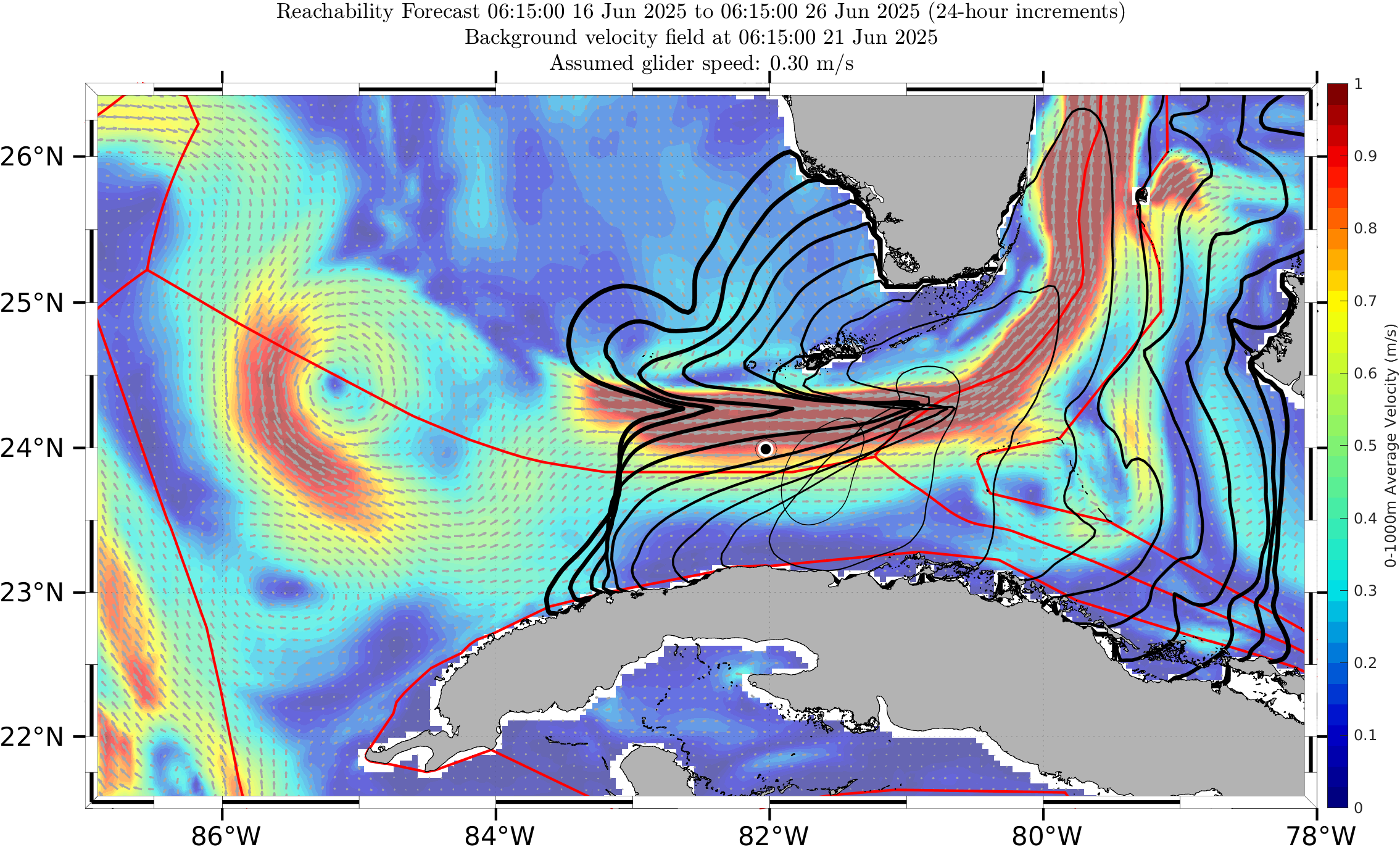 The black contours shown are reachability front forecasts, at 24 hour intervals (0hr to 240hr forecasts, with increasing line thickness for later times). The reachability front is the boundary of the largest set (the reachable set) that the glider can reach within that duration. It is computed by numerically solving our exact governing PDE for this time-optimal reachability front.