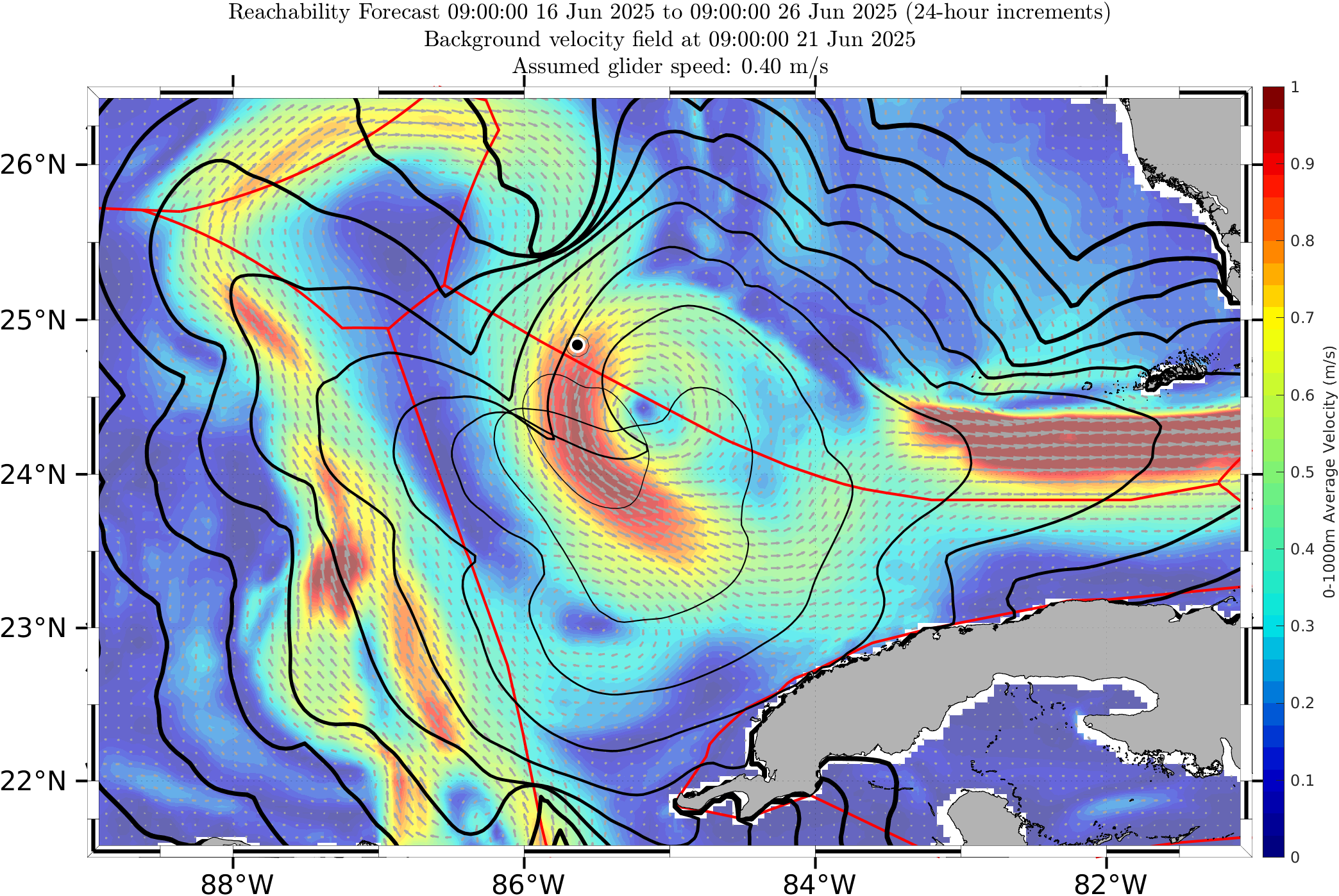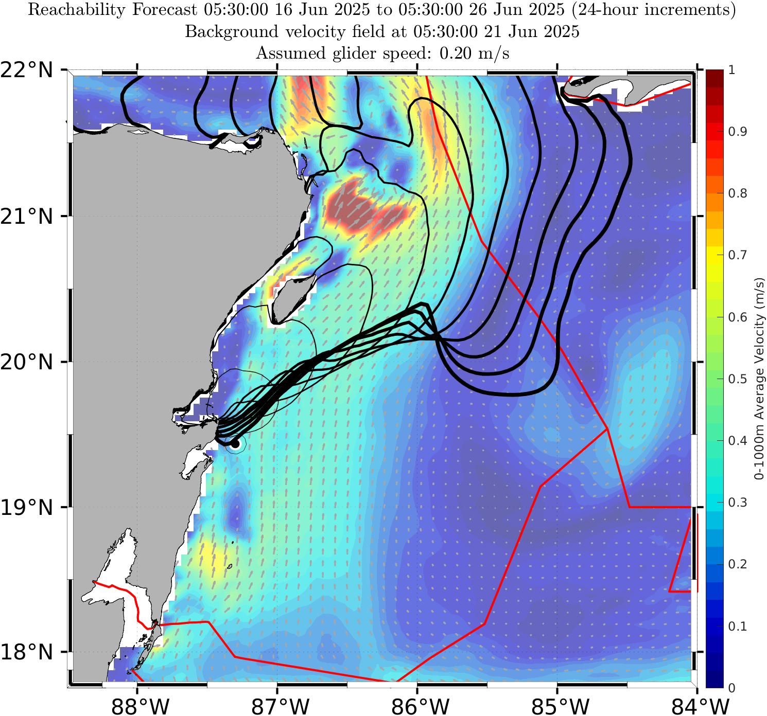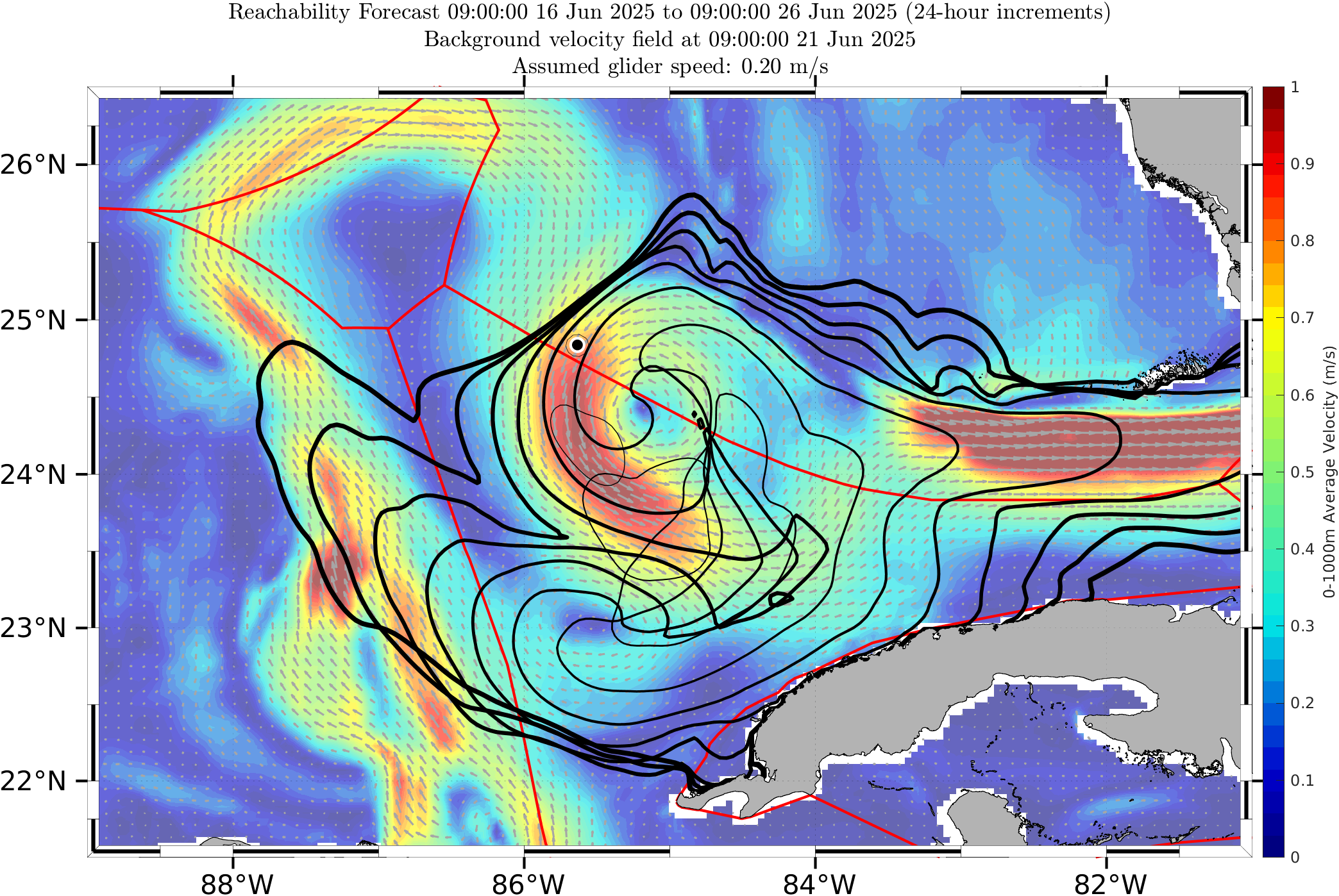 The black contours shown are reachability front forecasts, at 24 hour intervals (0hr to 240hr forecasts, with increasing line thickness for later times). The reachability front is the boundary of the largest set (the reachable set) that the glider can reach within that duration. It is computed by numerically solving our exact governing PDE for this time-optimal reachability front.