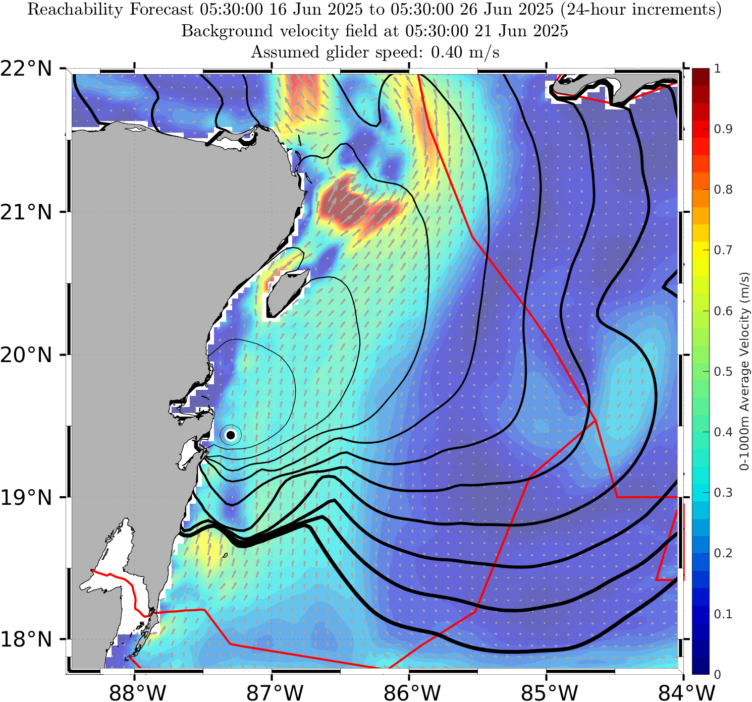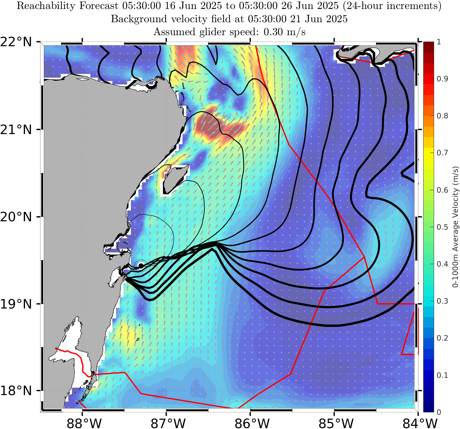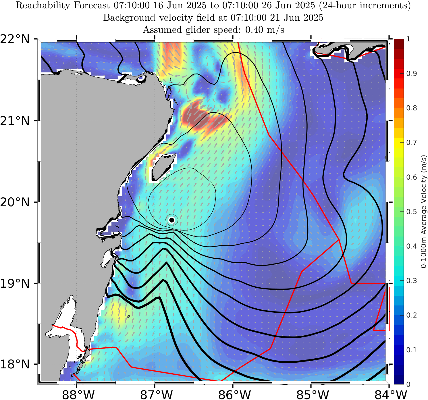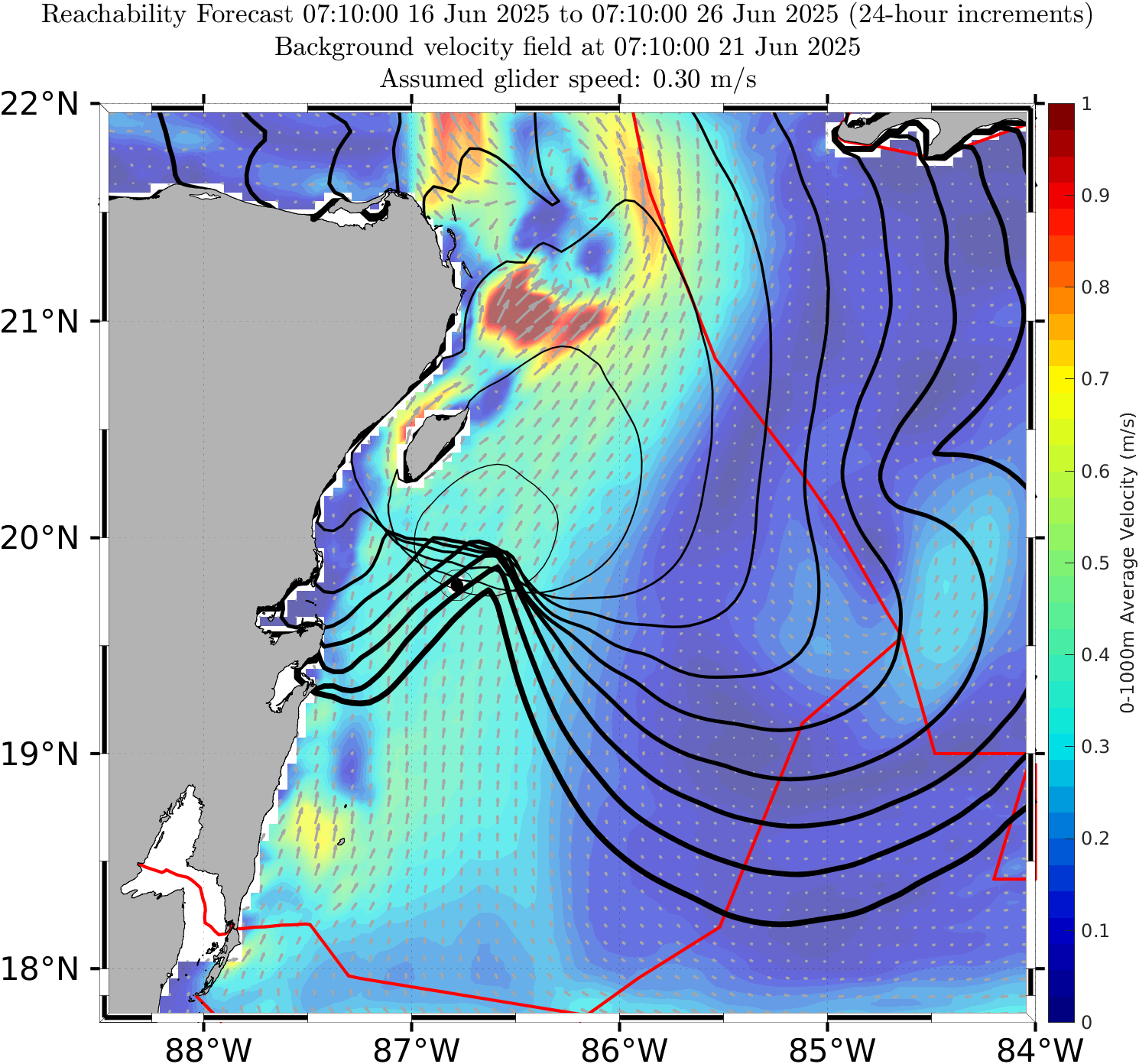 The black contours shown are reachability front forecasts, at 24 hour intervals (0hr to 240hr forecasts, with increasing line thickness for later times). The reachability front is the boundary of the largest set (the reachable set) that the glider can reach within that duration. It is computed by numerically solving our exact governing PDE for this time-optimal reachability front.