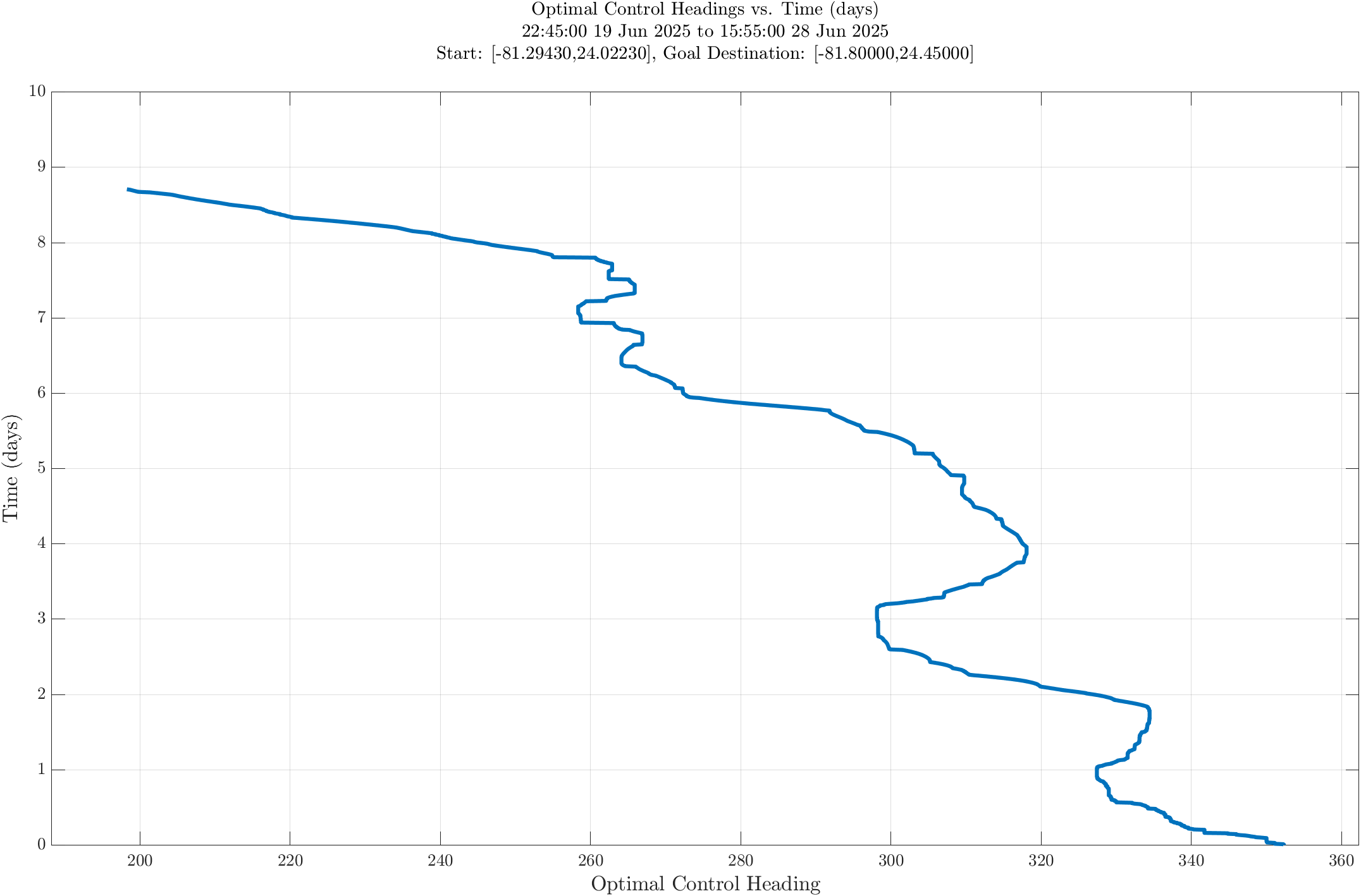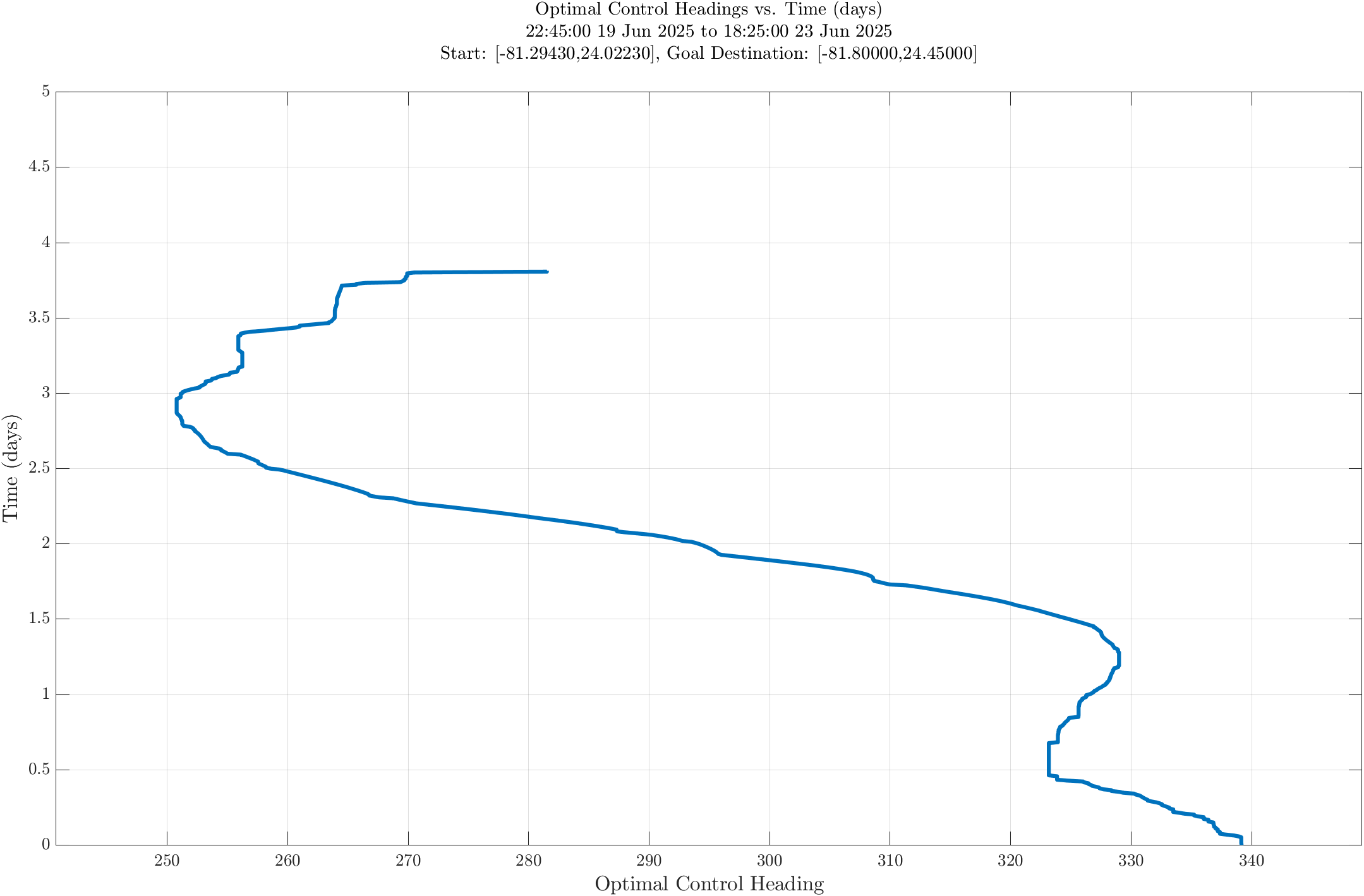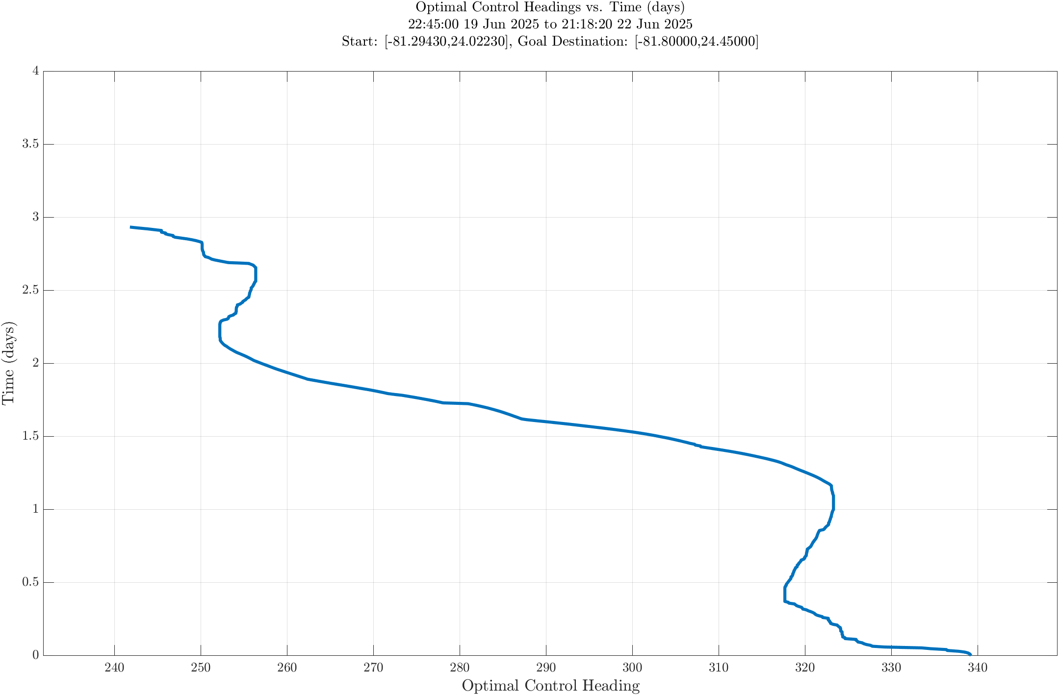 In the third panel, the optimal heading angle (degrees, measured clockwise from true north) vs. time is shown.