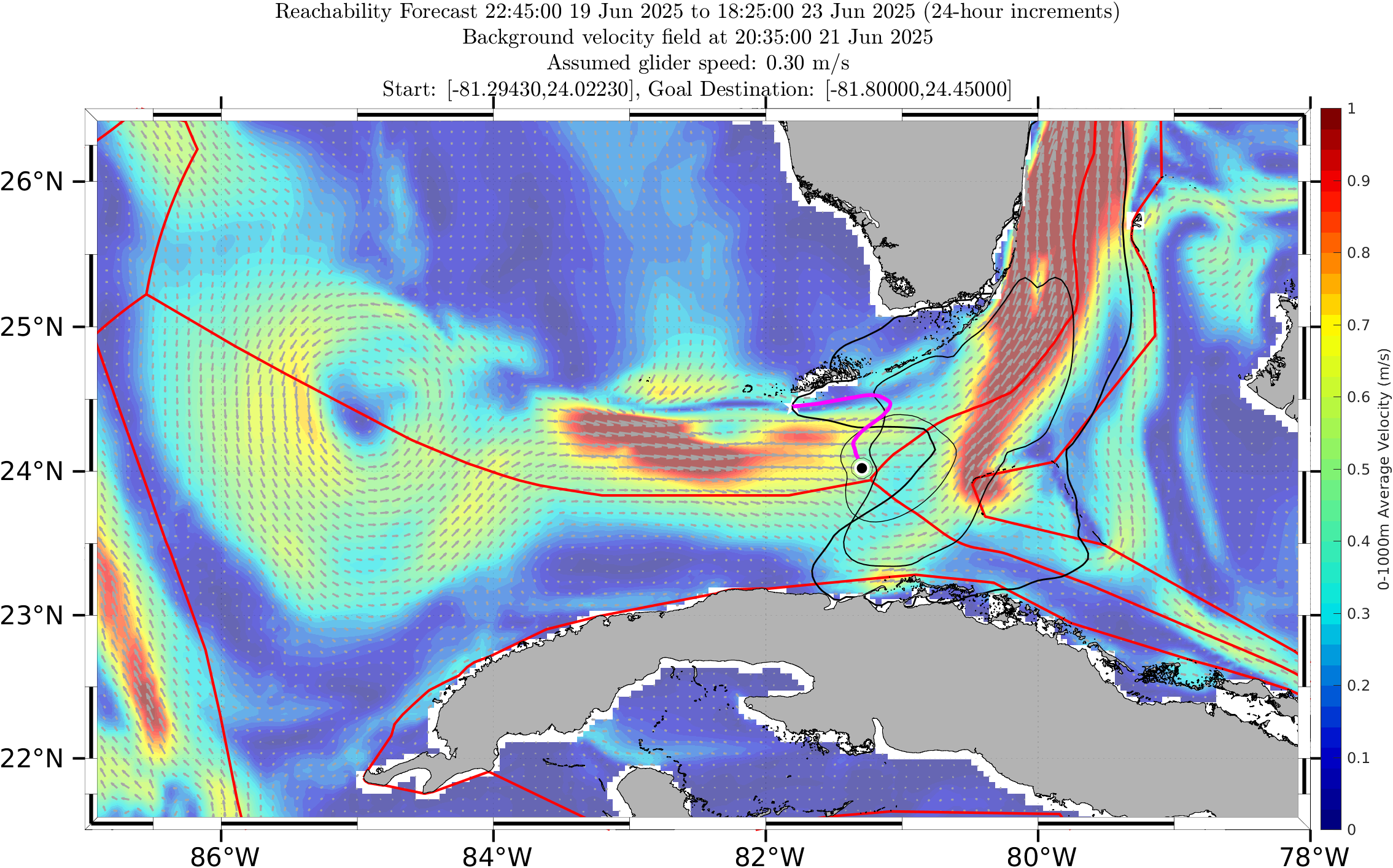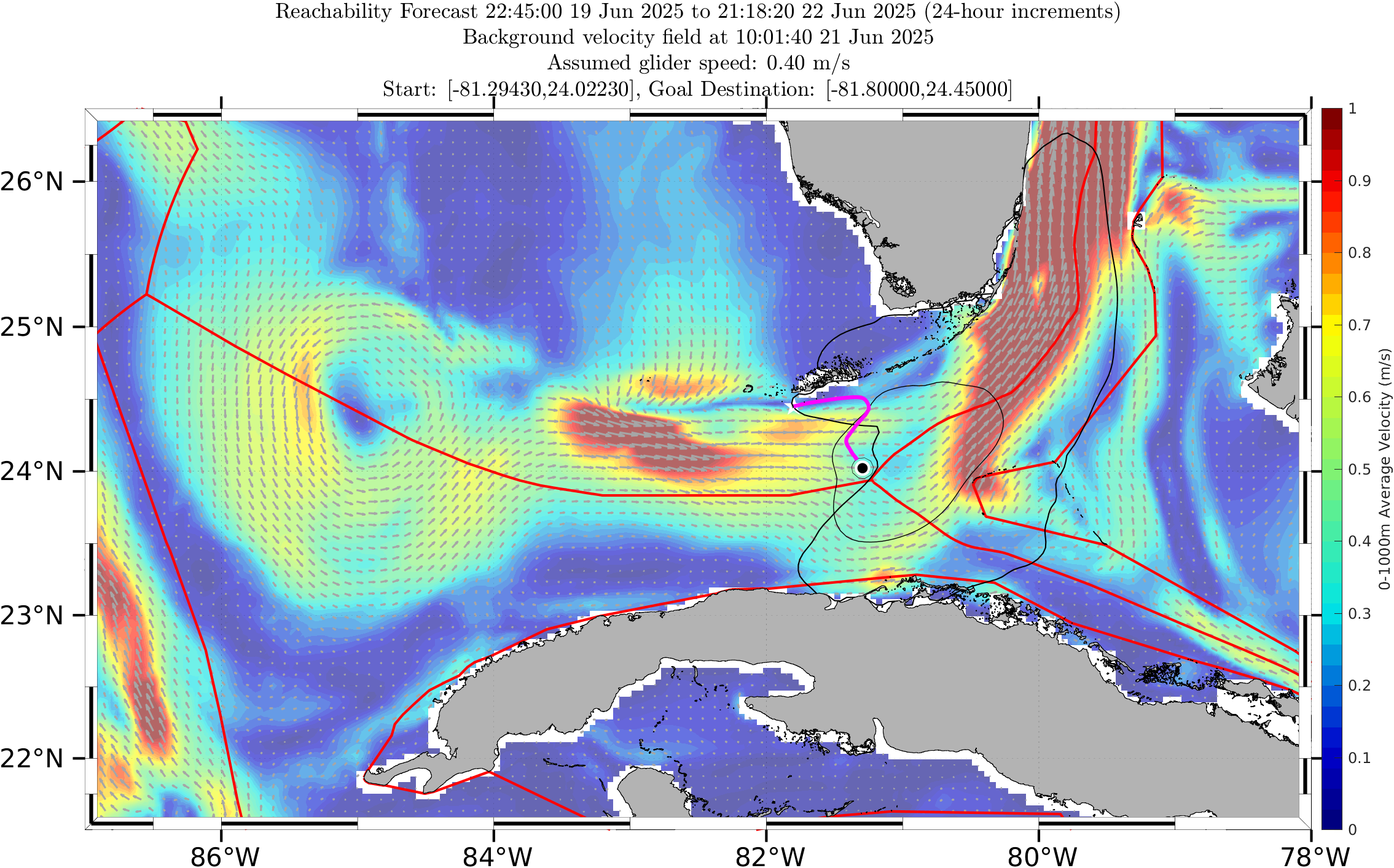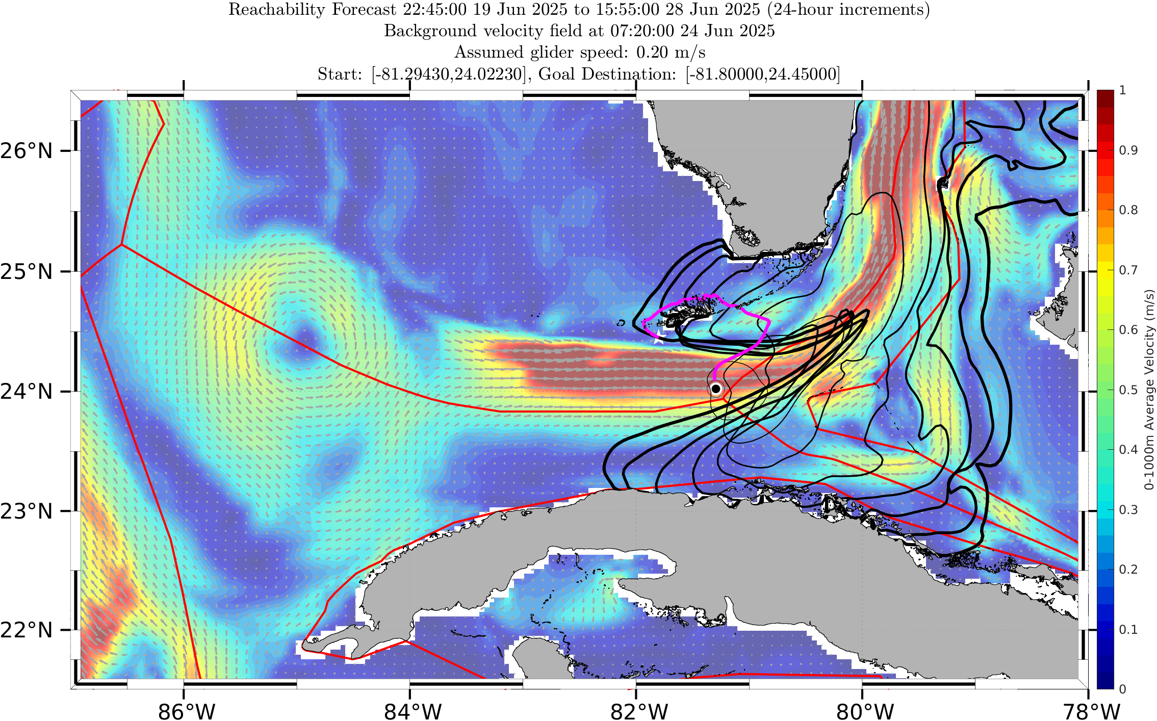 In the first panel, the black contours shown are reachability front forecasts, at 24 hour intervals (with increasing line thickness for later times). The reachability front is the boundary of the largest set (the reachable set) that the glider can reach within that duration. It is computed by numerically solving our exact governing PDE for this time-optimal reachability front. The time-optimal path from the starting postion to the desired recovery position is shown by the purple curve.