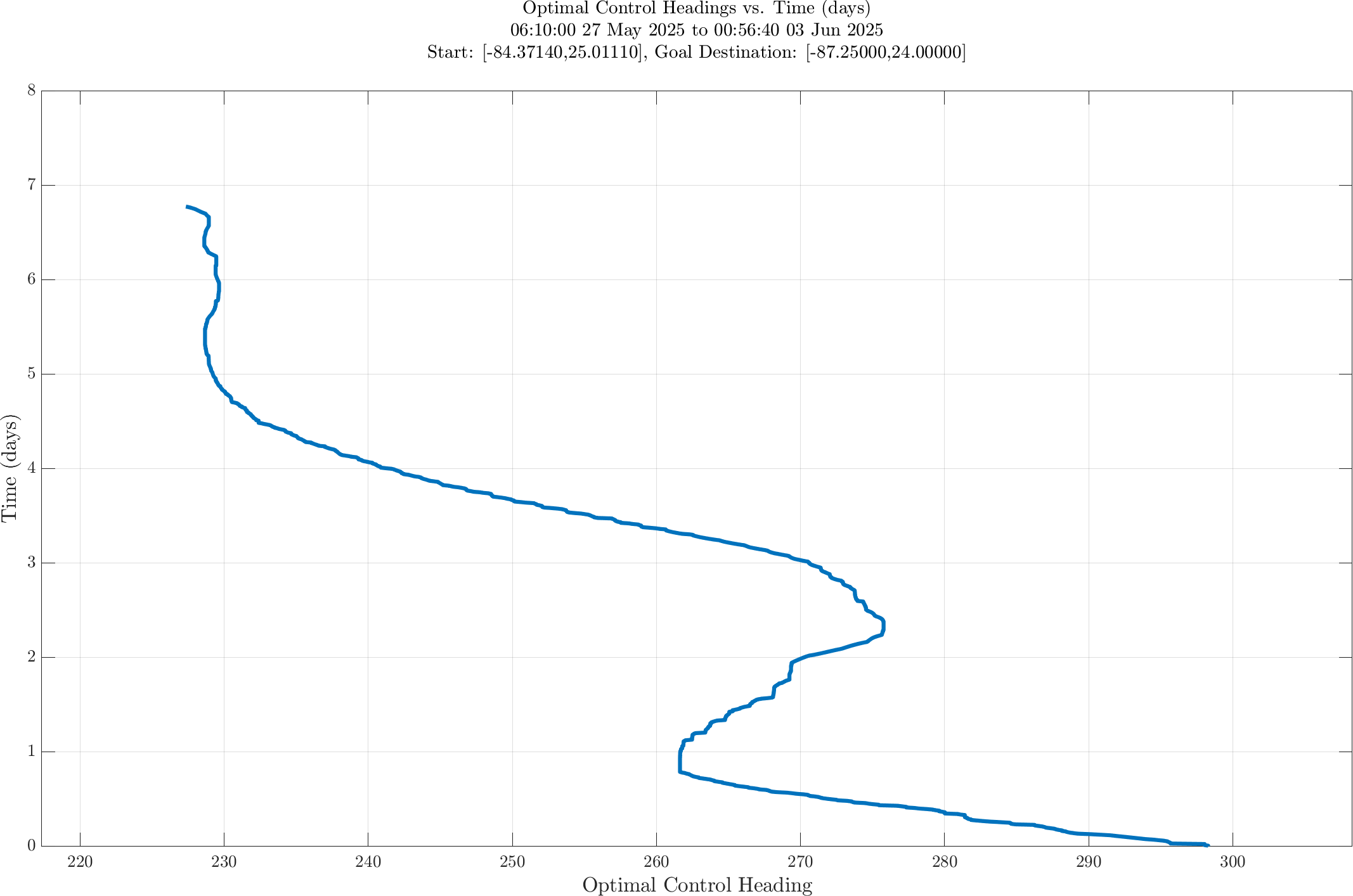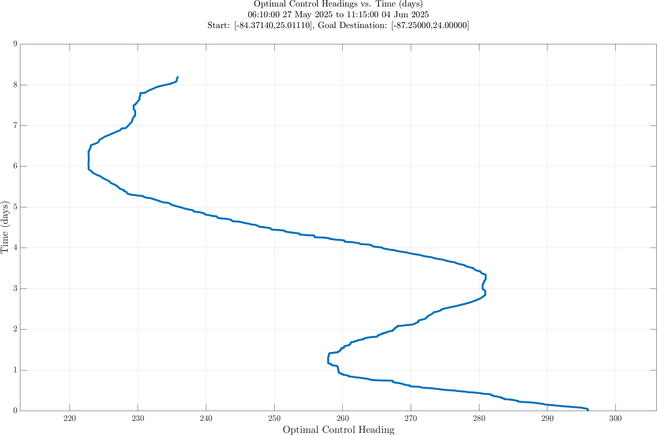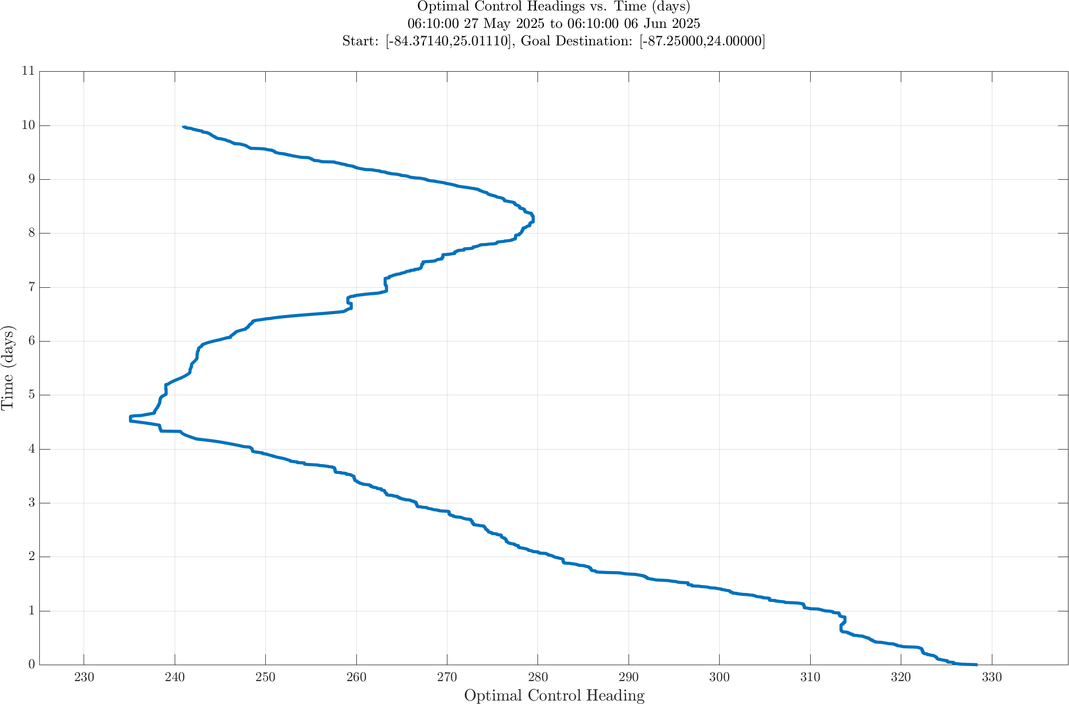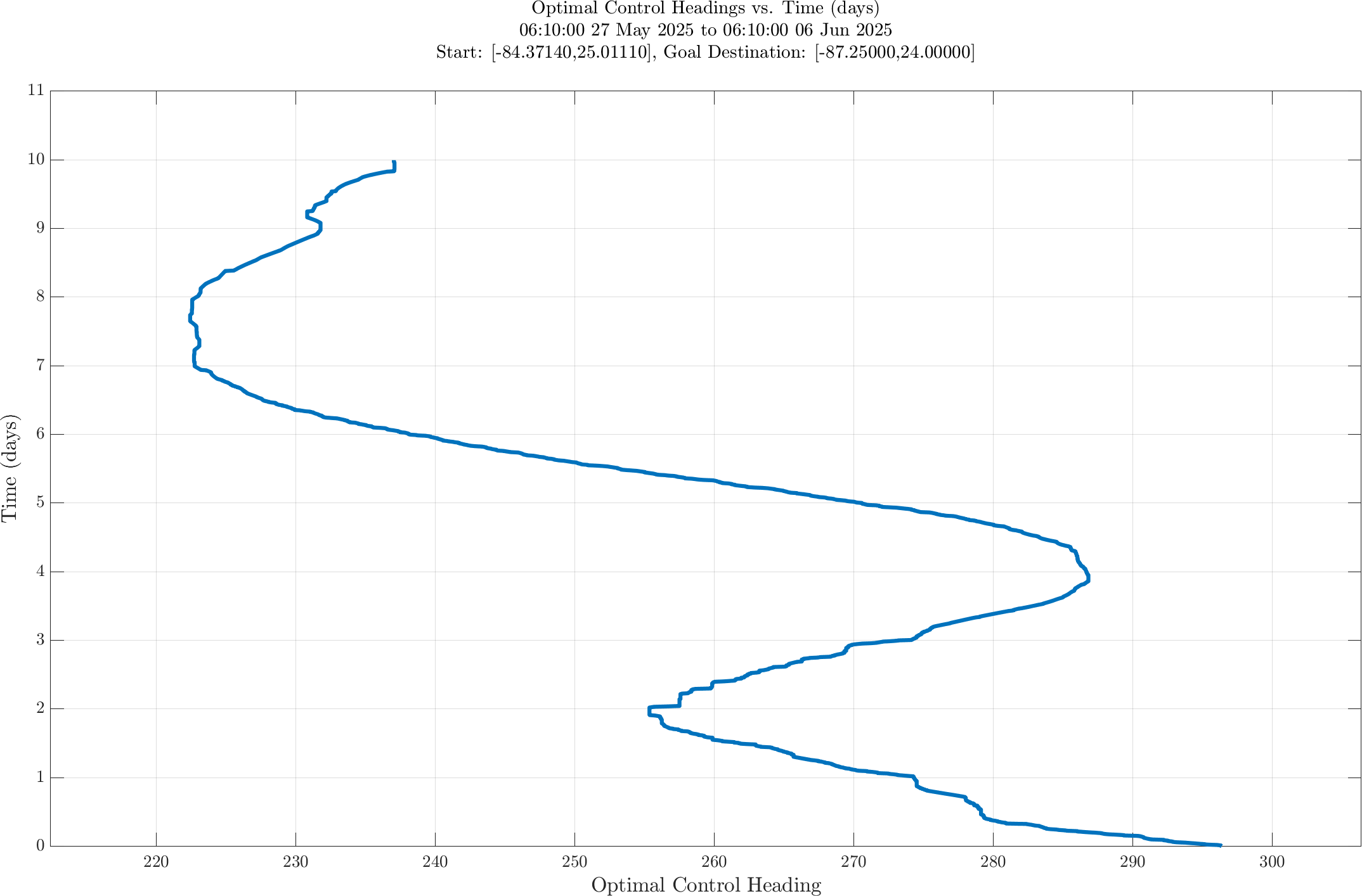 In the third panel, the optimal heading angle (degrees, measured clockwise from true north) vs. time is shown.