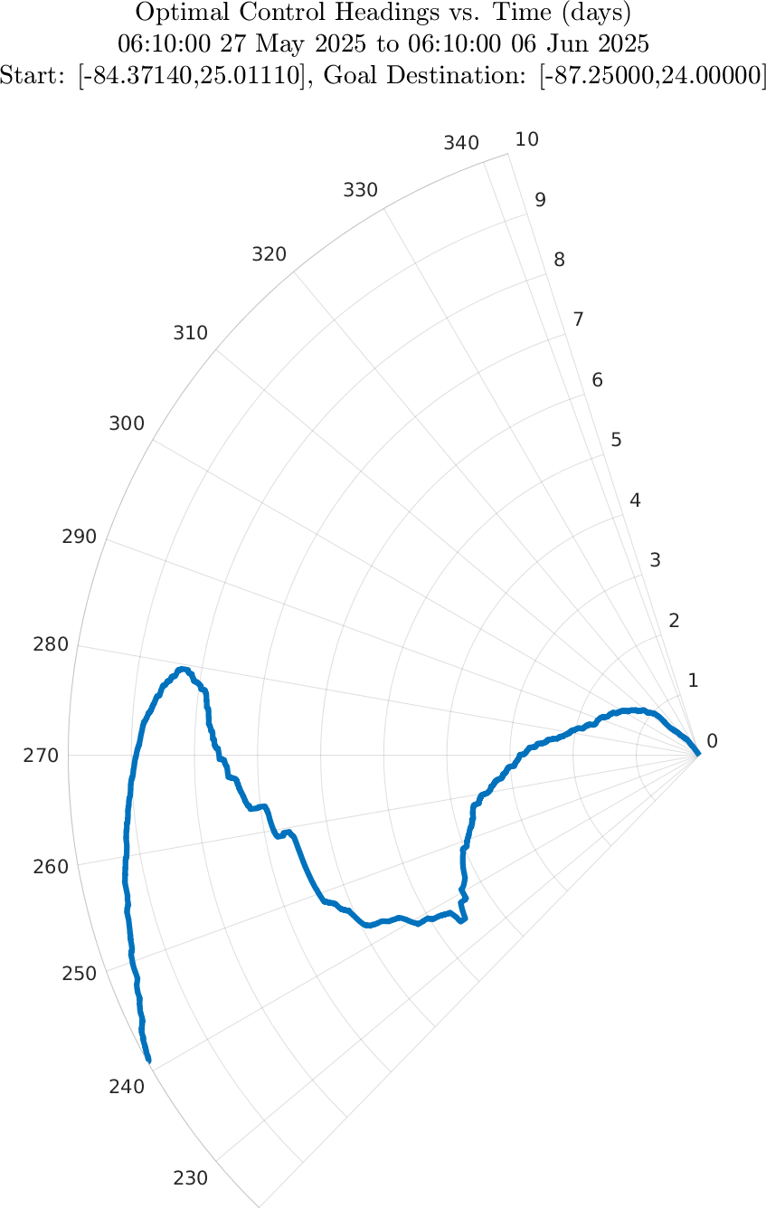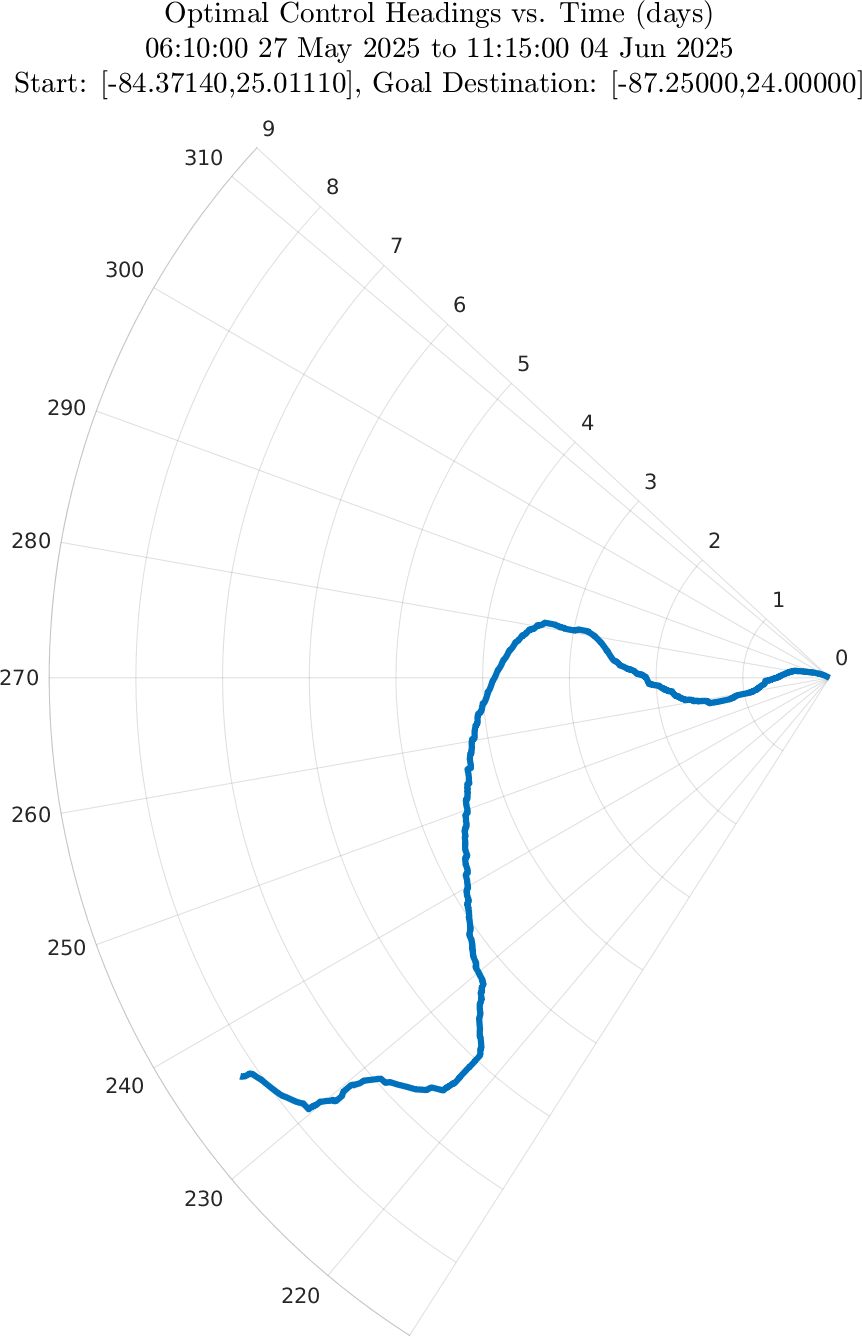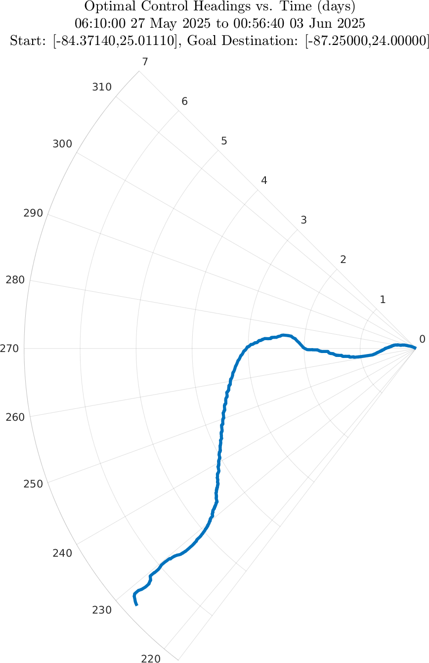 The fourth panel also shows the optimal heading angle with time, as a polar plot with time on the r-axis.