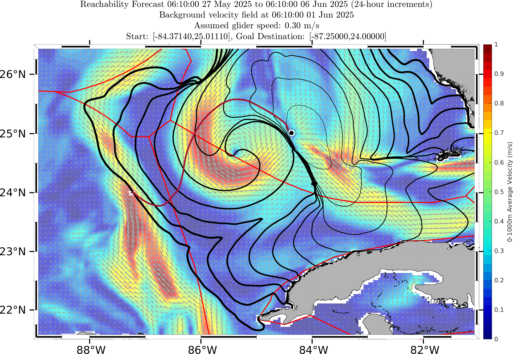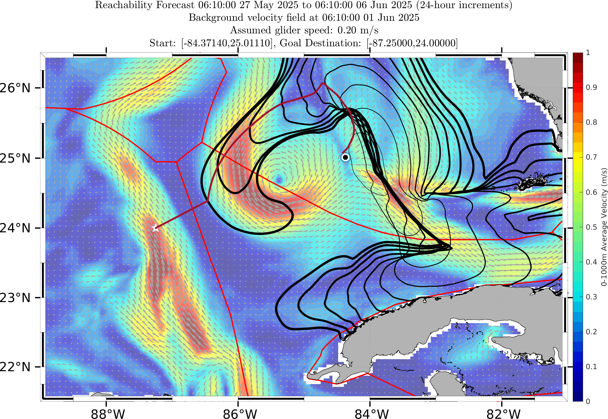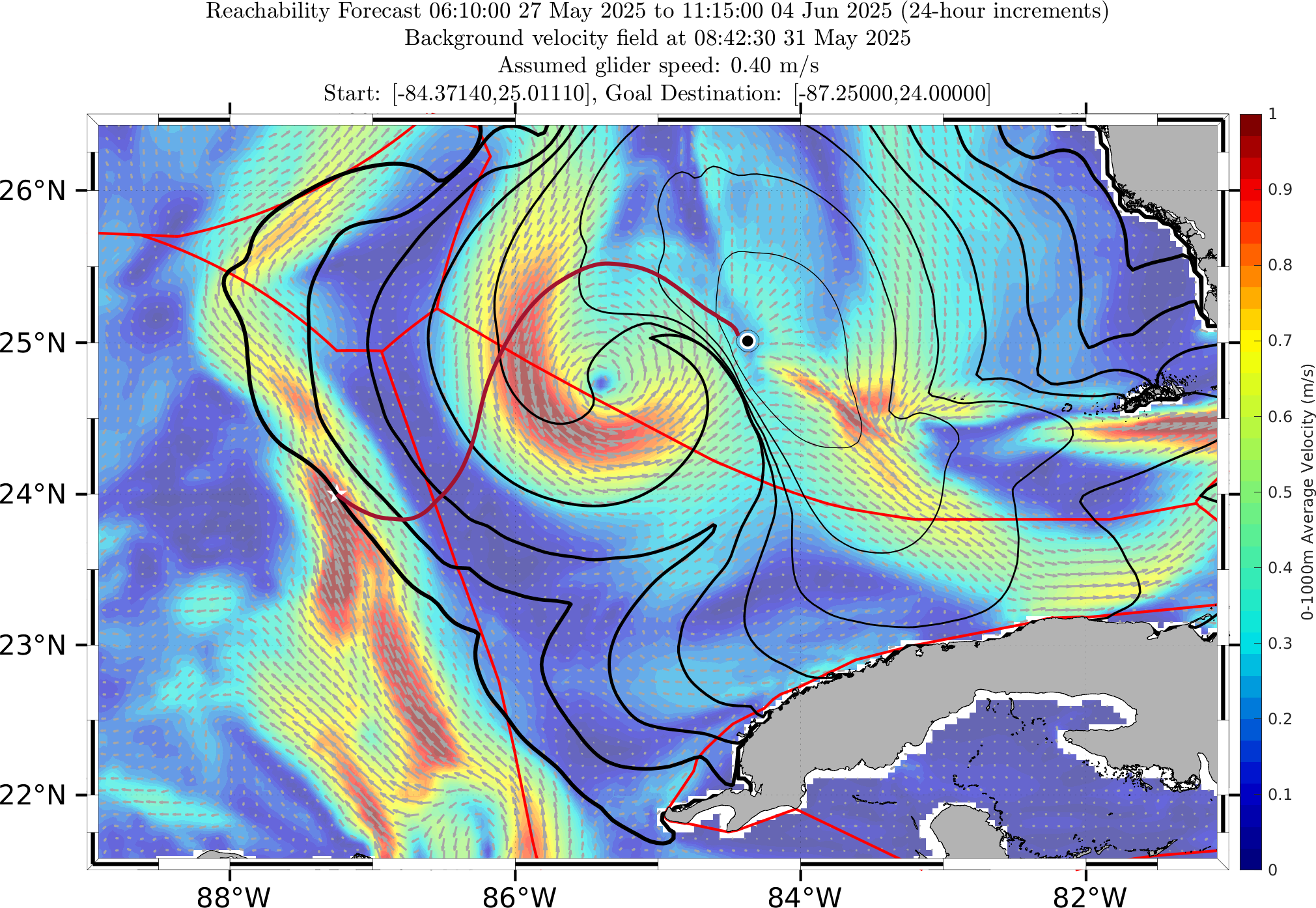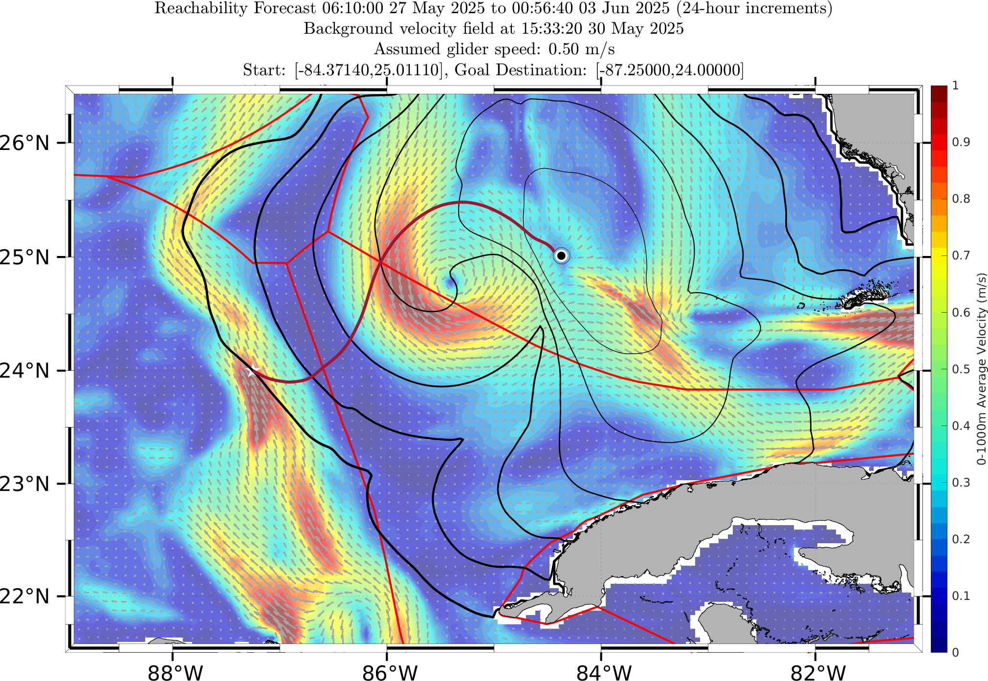 In this forecast, we consider glider RU38's actual starting location of 25.0111°N, 84.3714°W on 27 May 0610Z. The final target point for the time-optimal path forecast is the western branch of the LC provided by the MSEAS ocean forecast on Jun 06 0Z.