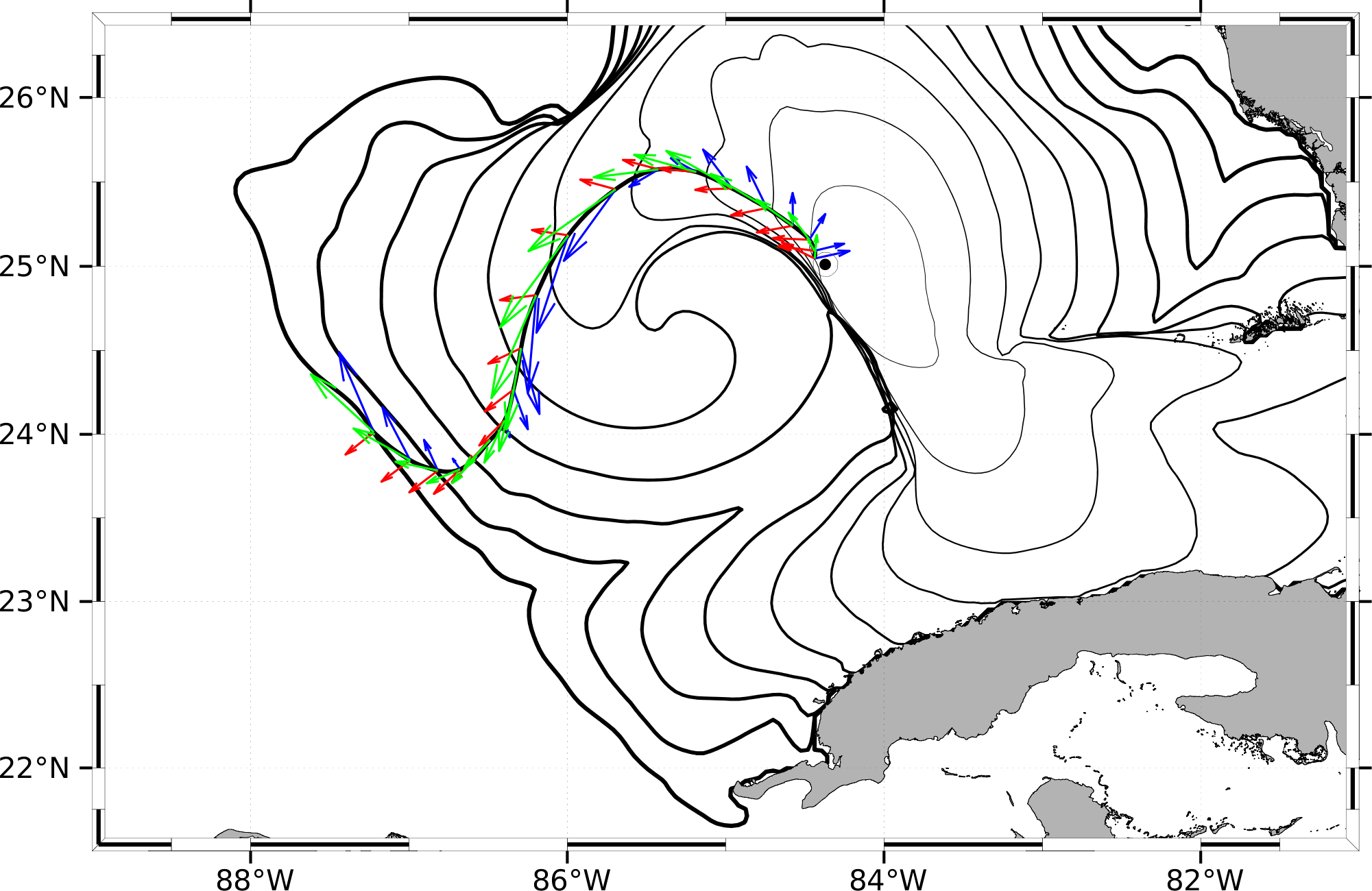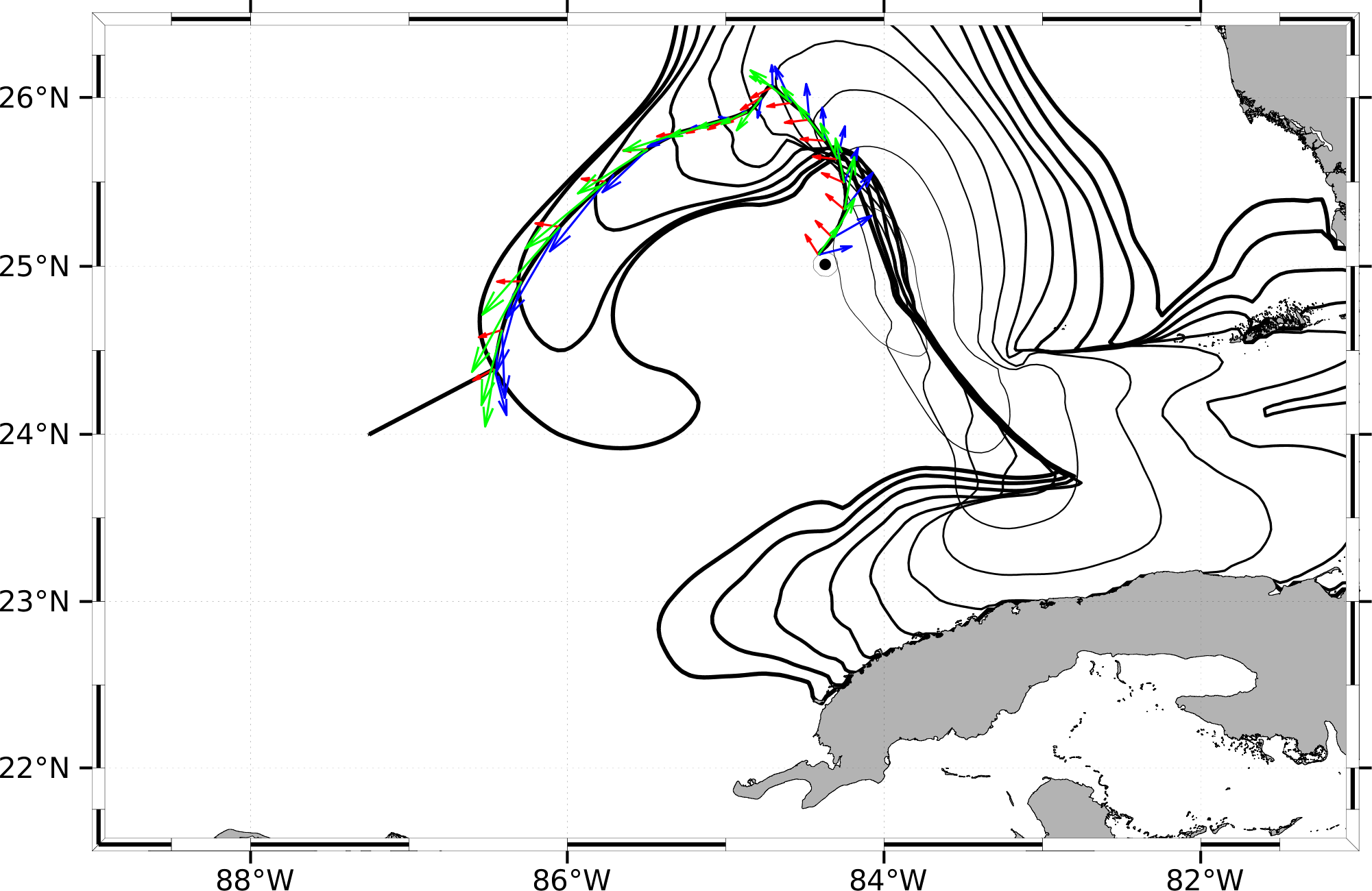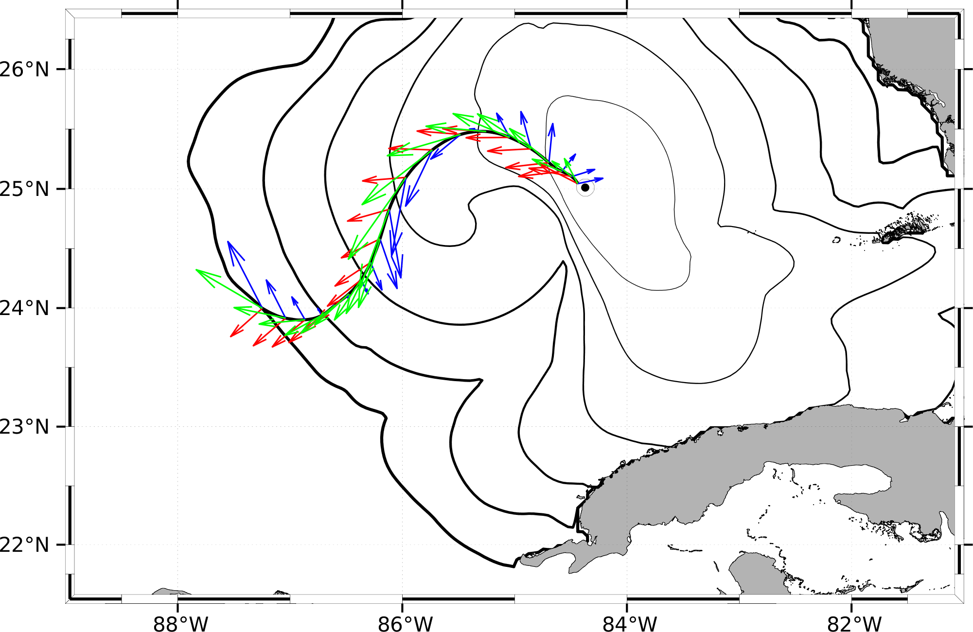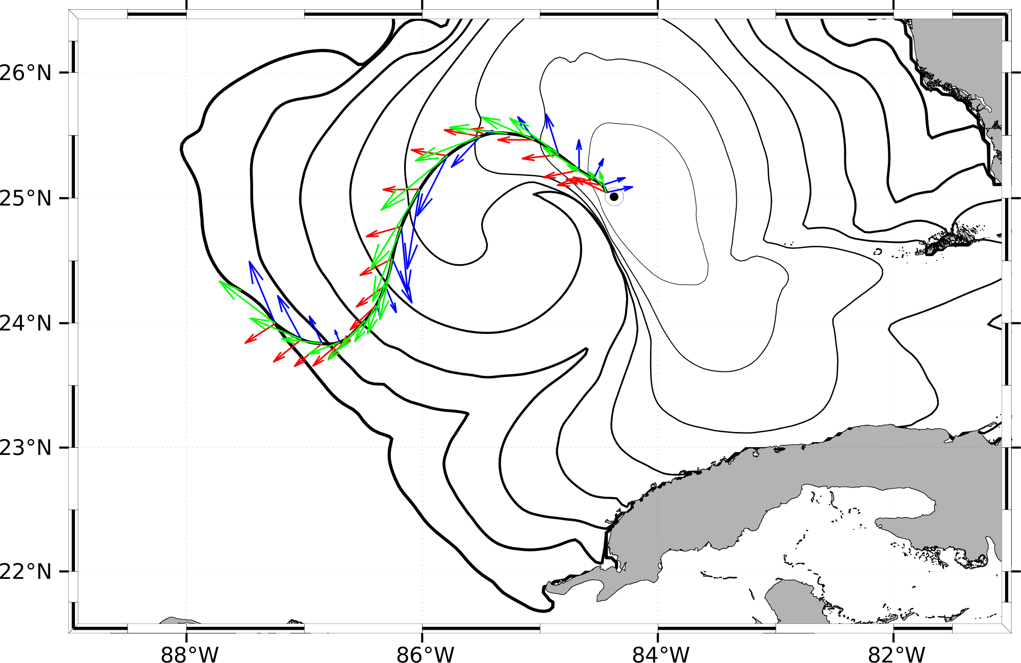 In this forecast, we consider glider RU38's actual starting location of 25.0111°N, 84.3714°W on 27 May 0610Z. The final target point for the time-optimal path forecast is the western branch of the LC provided by the MSEAS ocean forecast on Jun 06 0Z.