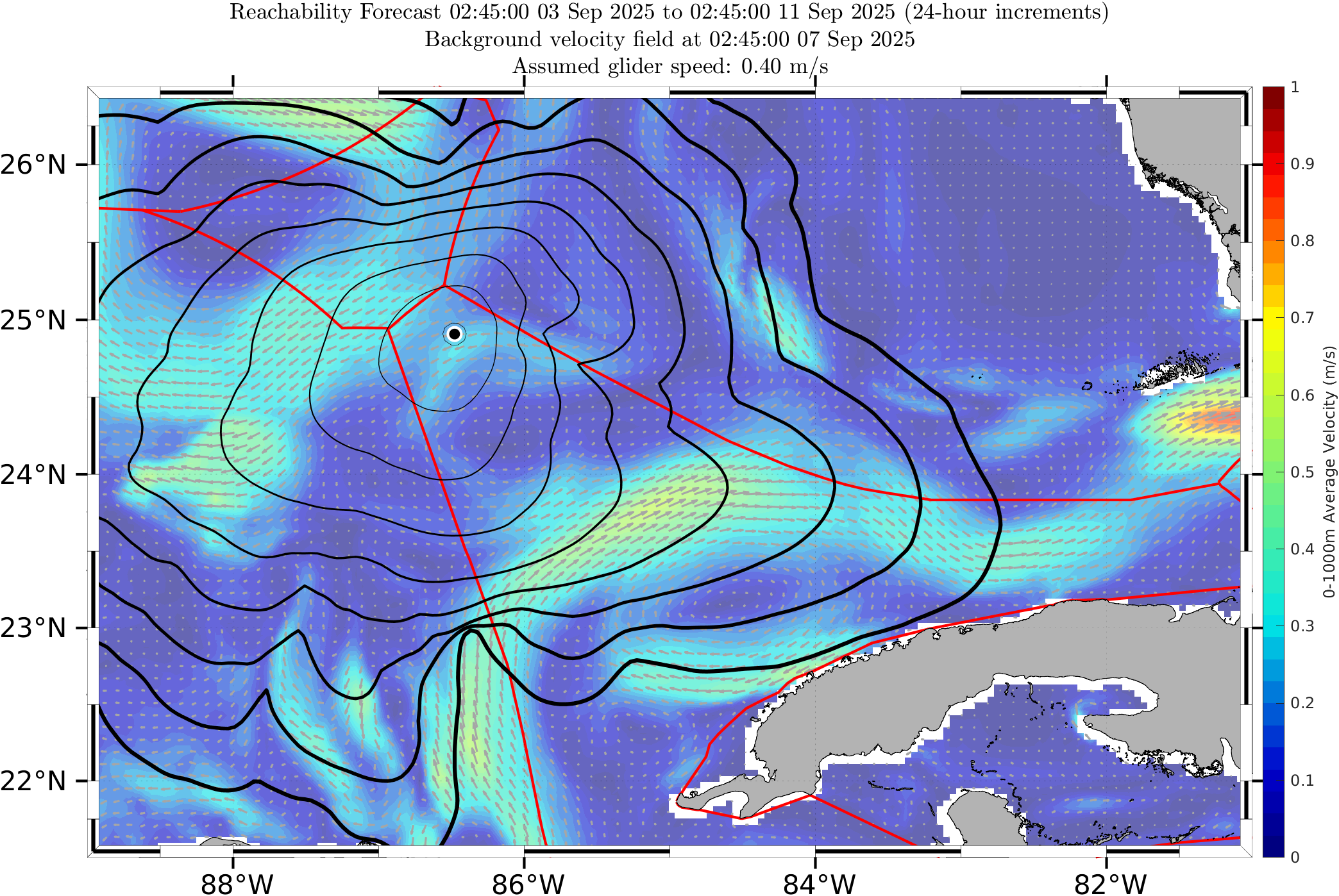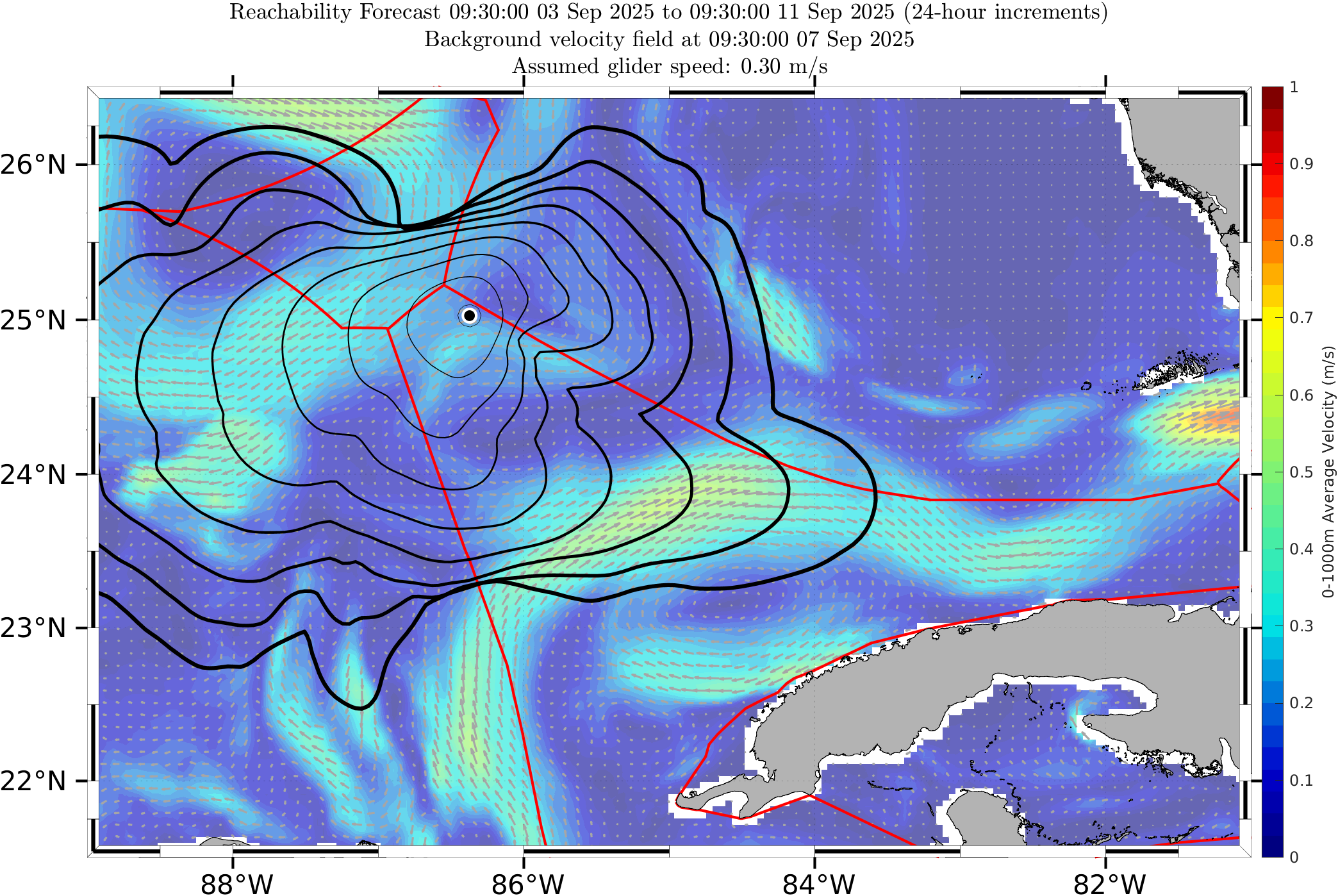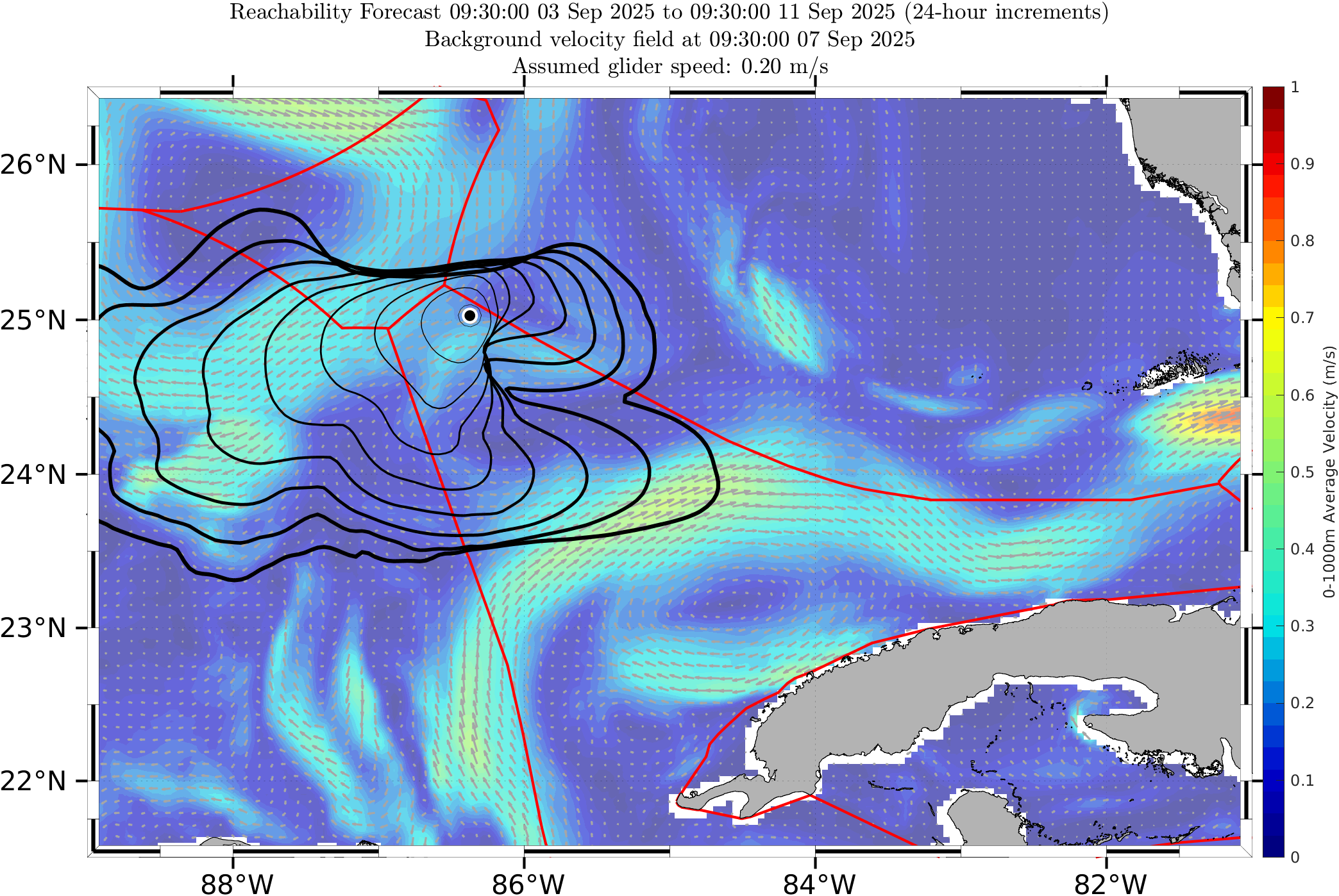 The black contours shown are reachability front forecasts, at 24 hour intervals (0hr to 192hr forecasts, with increasing line thickness for later times). The reachability front is the boundary of the largest set (the reachable set) that the glider can reach within that duration. It is computed by numerically solving our exact governing PDE for this time-optimal reachability front.