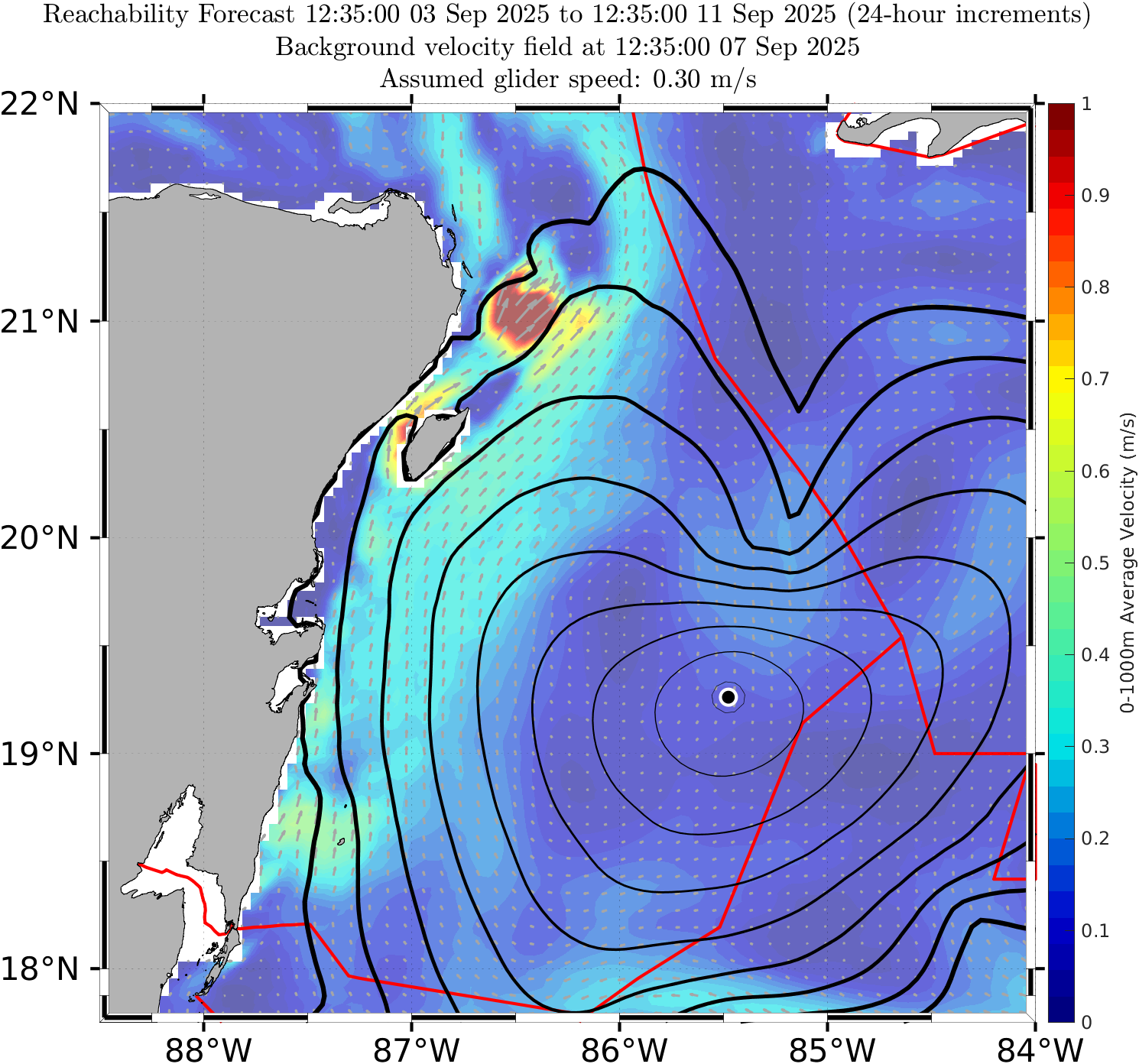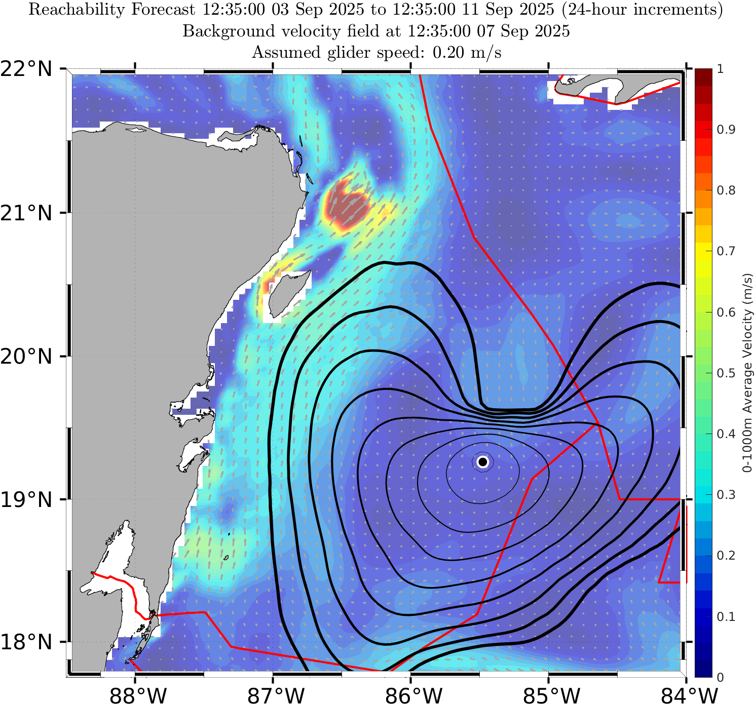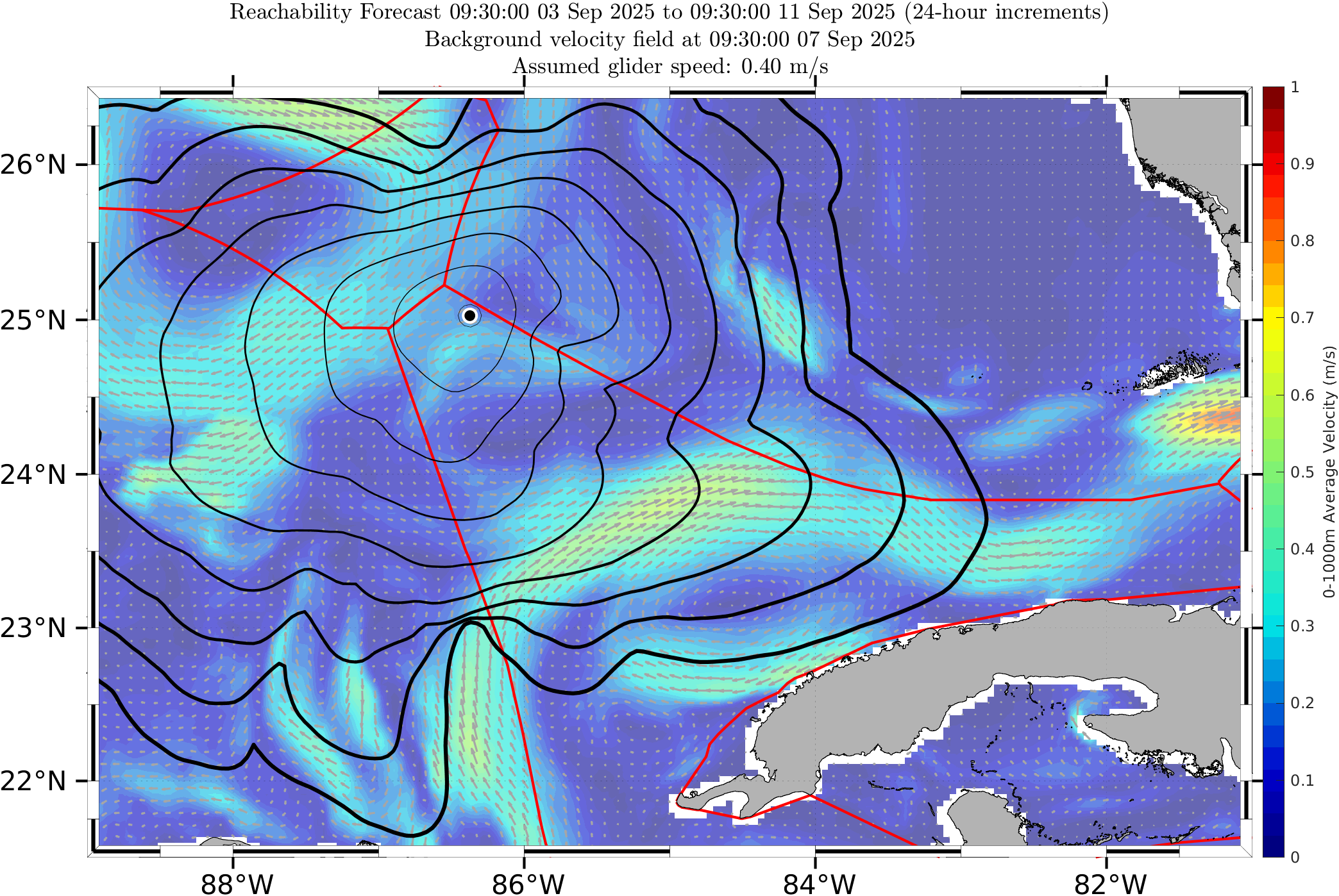 The black contours shown are reachability front forecasts, at 24 hour intervals (0hr to 192hr forecasts, with increasing line thickness for later times). The reachability front is the boundary of the largest set (the reachable set) that the glider can reach within that duration. It is computed by numerically solving our exact governing PDE for this time-optimal reachability front.