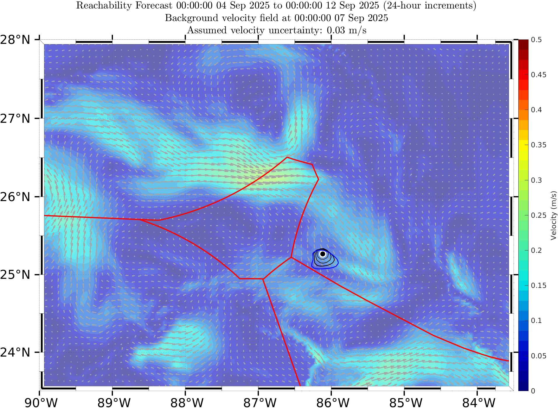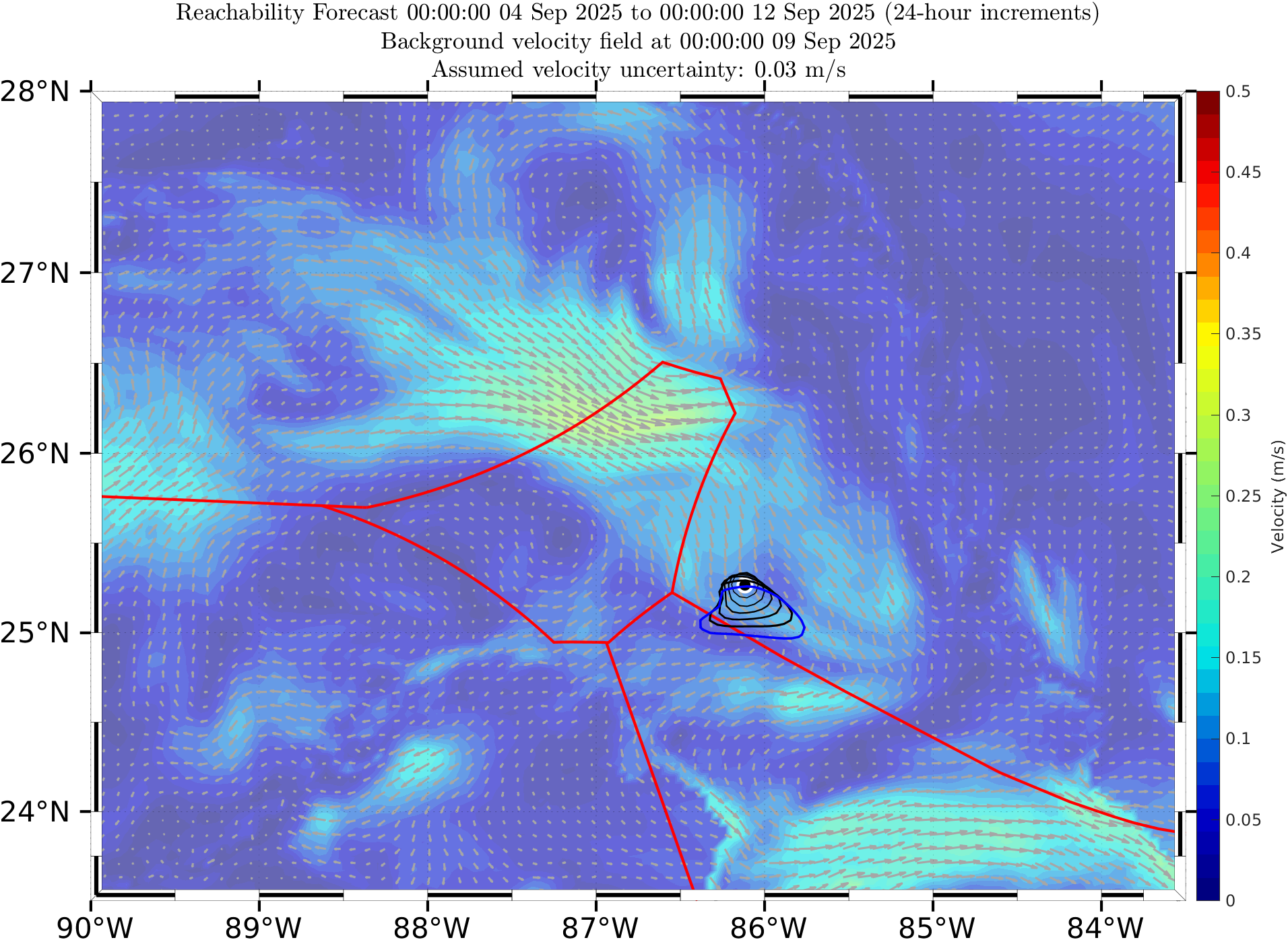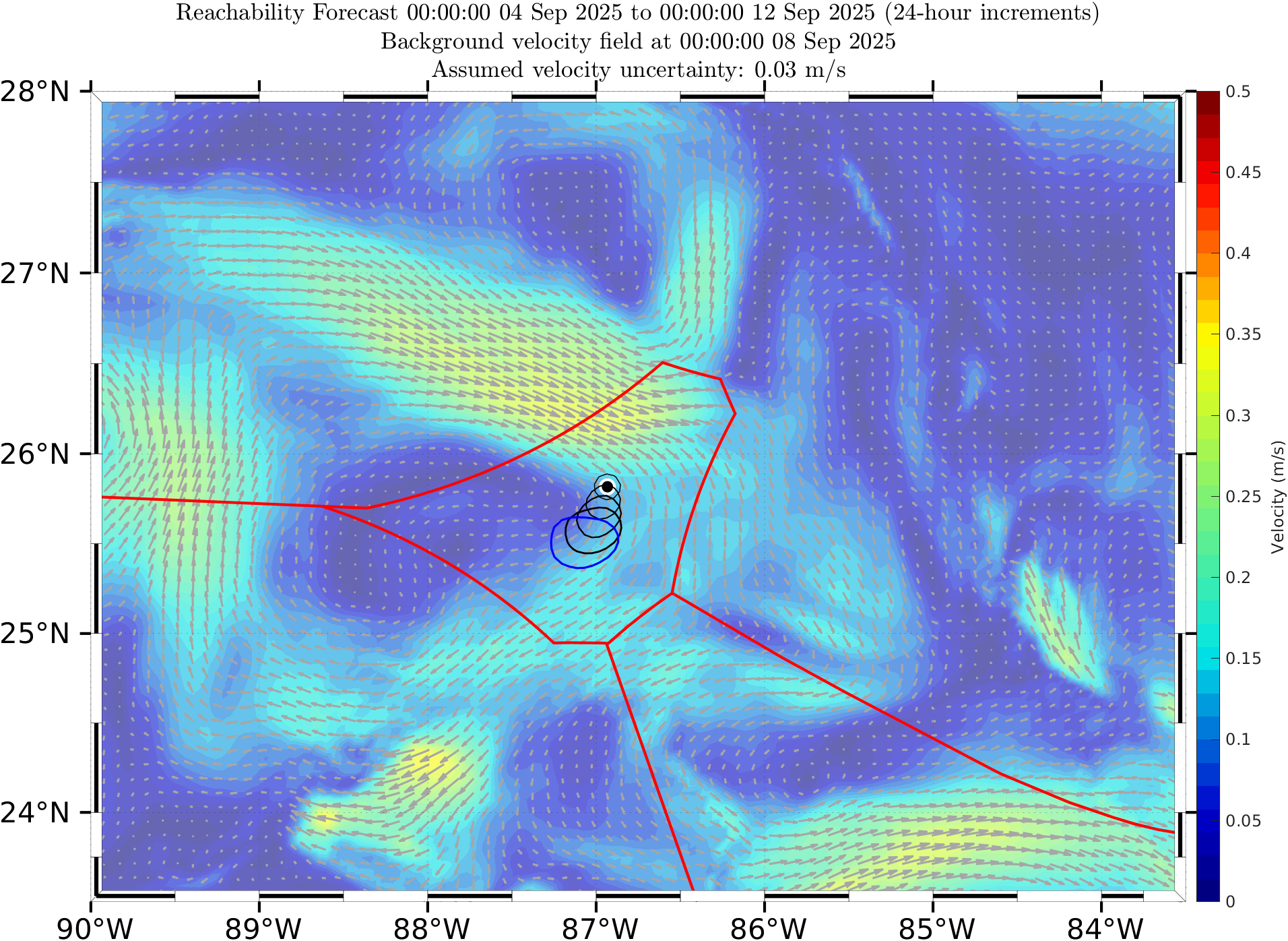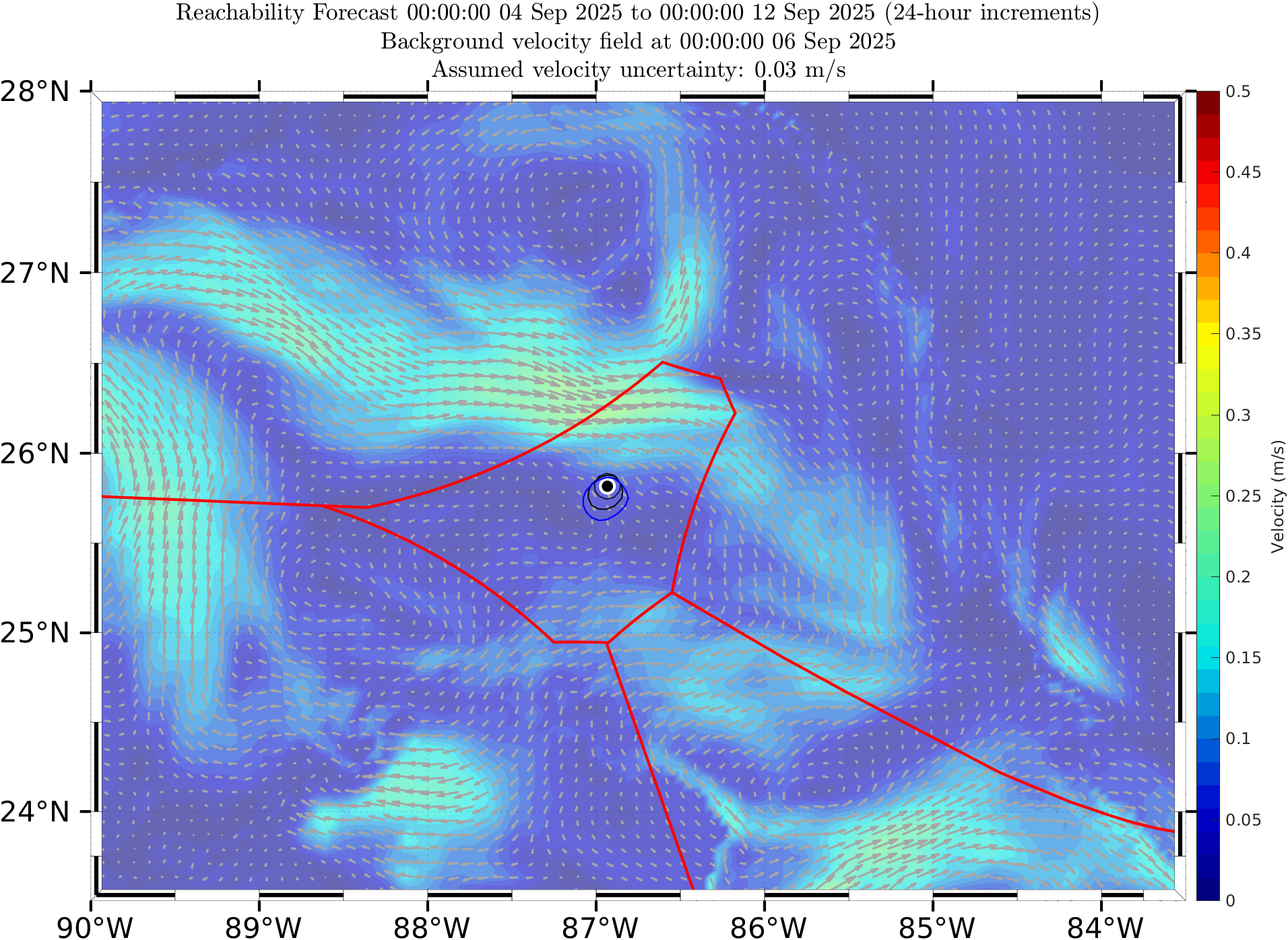 Starting points are located where the floats are anticipated to be at 0Z on 04 Sep 0000Z. All runs assume 3 cm/s velocity unc., and run for 8 days.