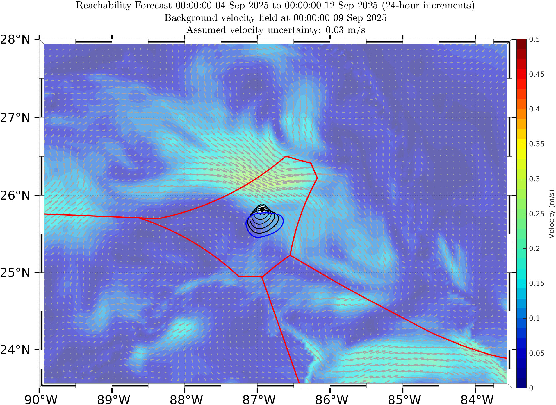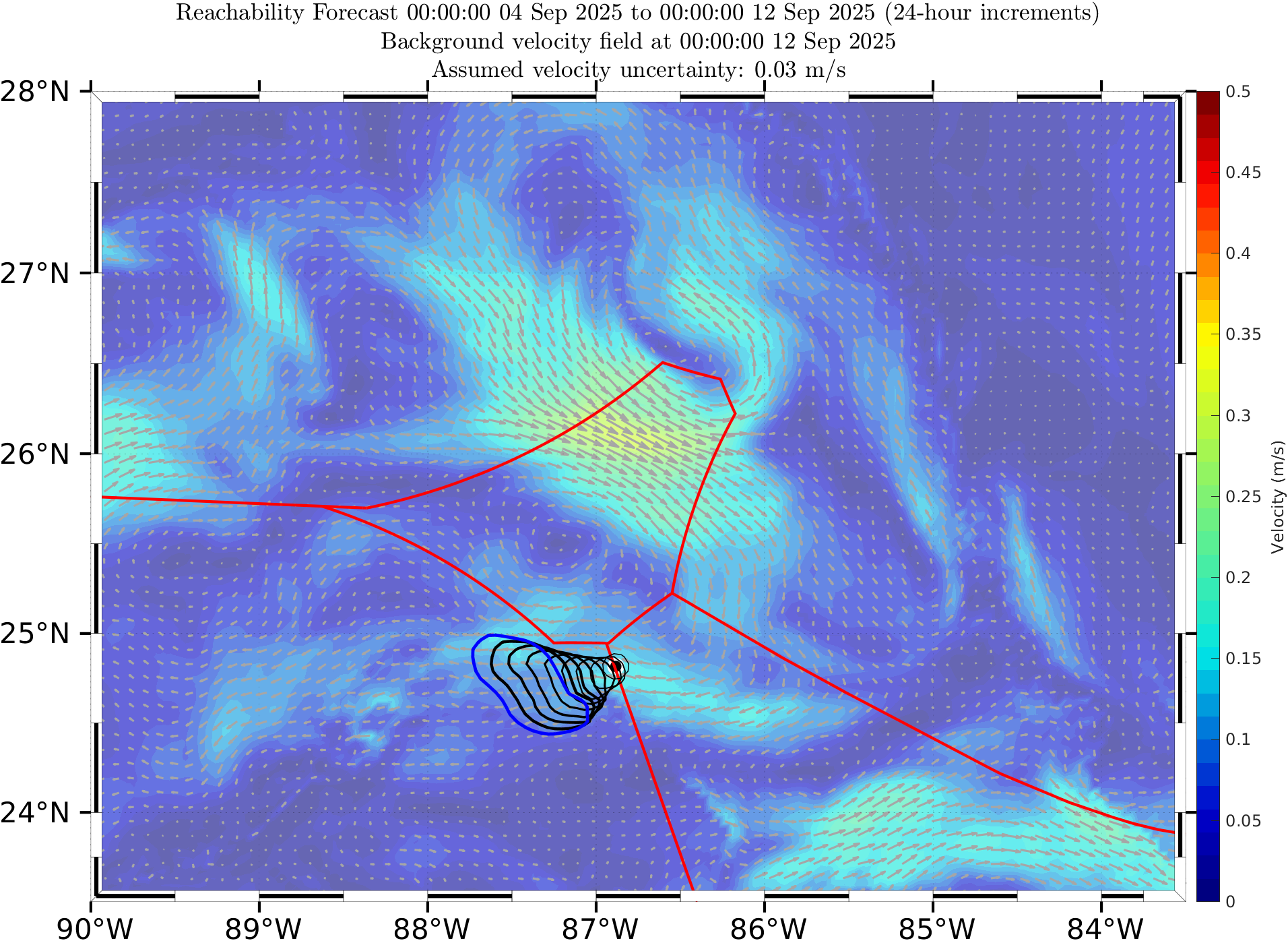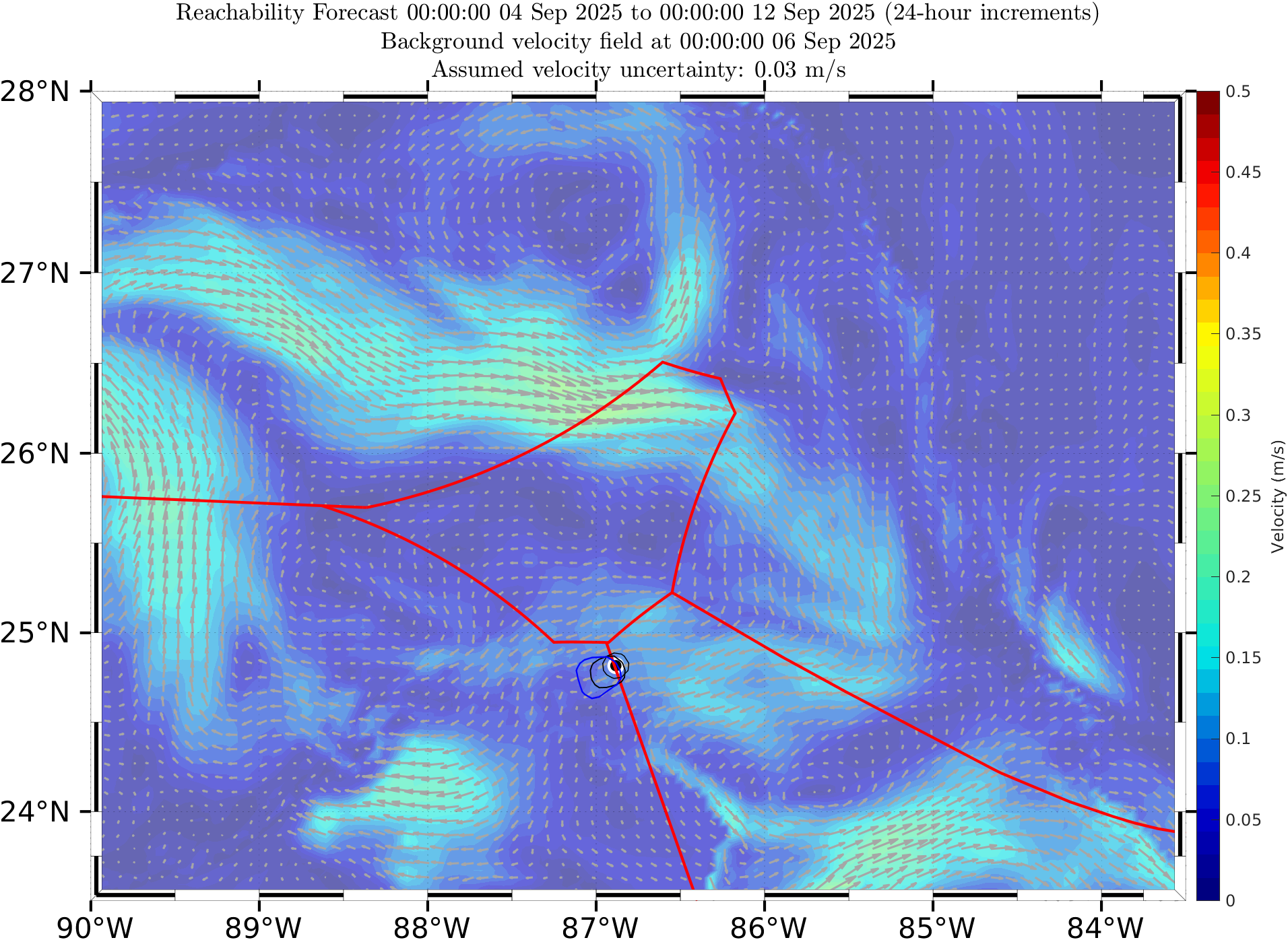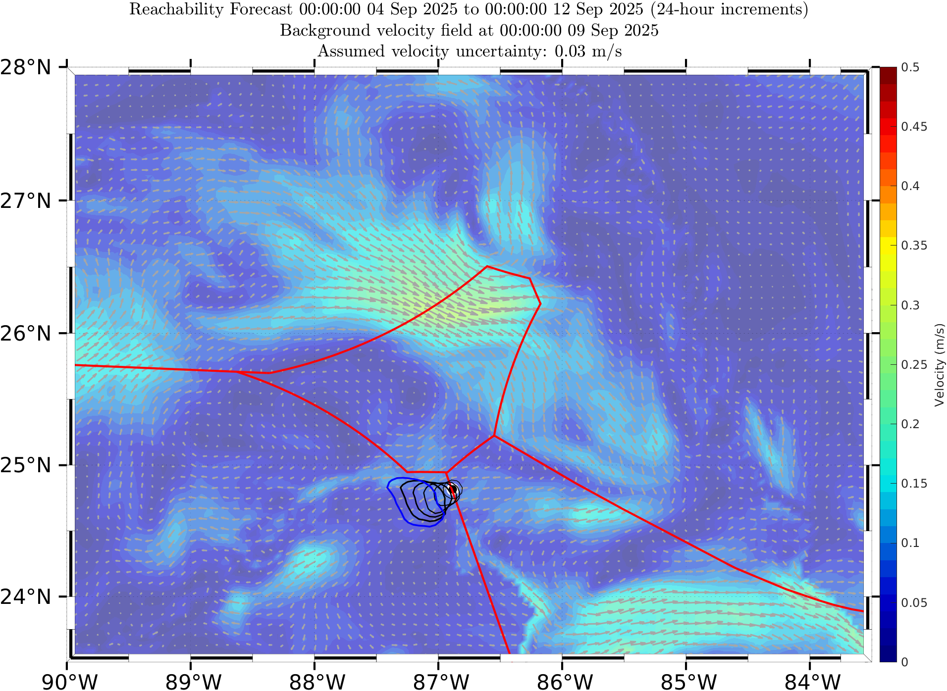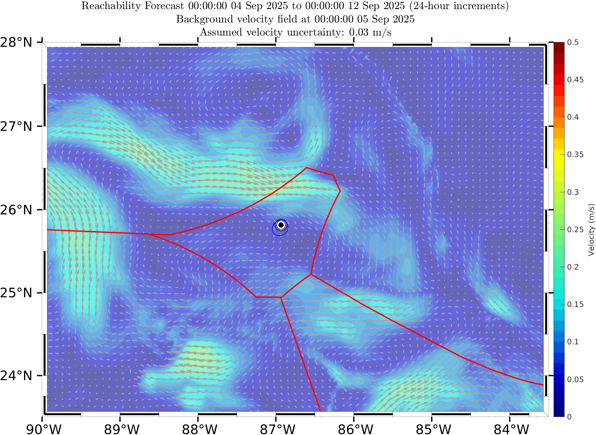 Starting points are located where the floats are anticipated to be at 0Z on 04 Sep 0000Z. All runs assume 3 cm/s velocity unc., and run for 8 days.