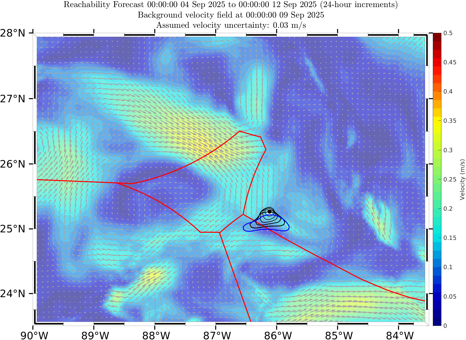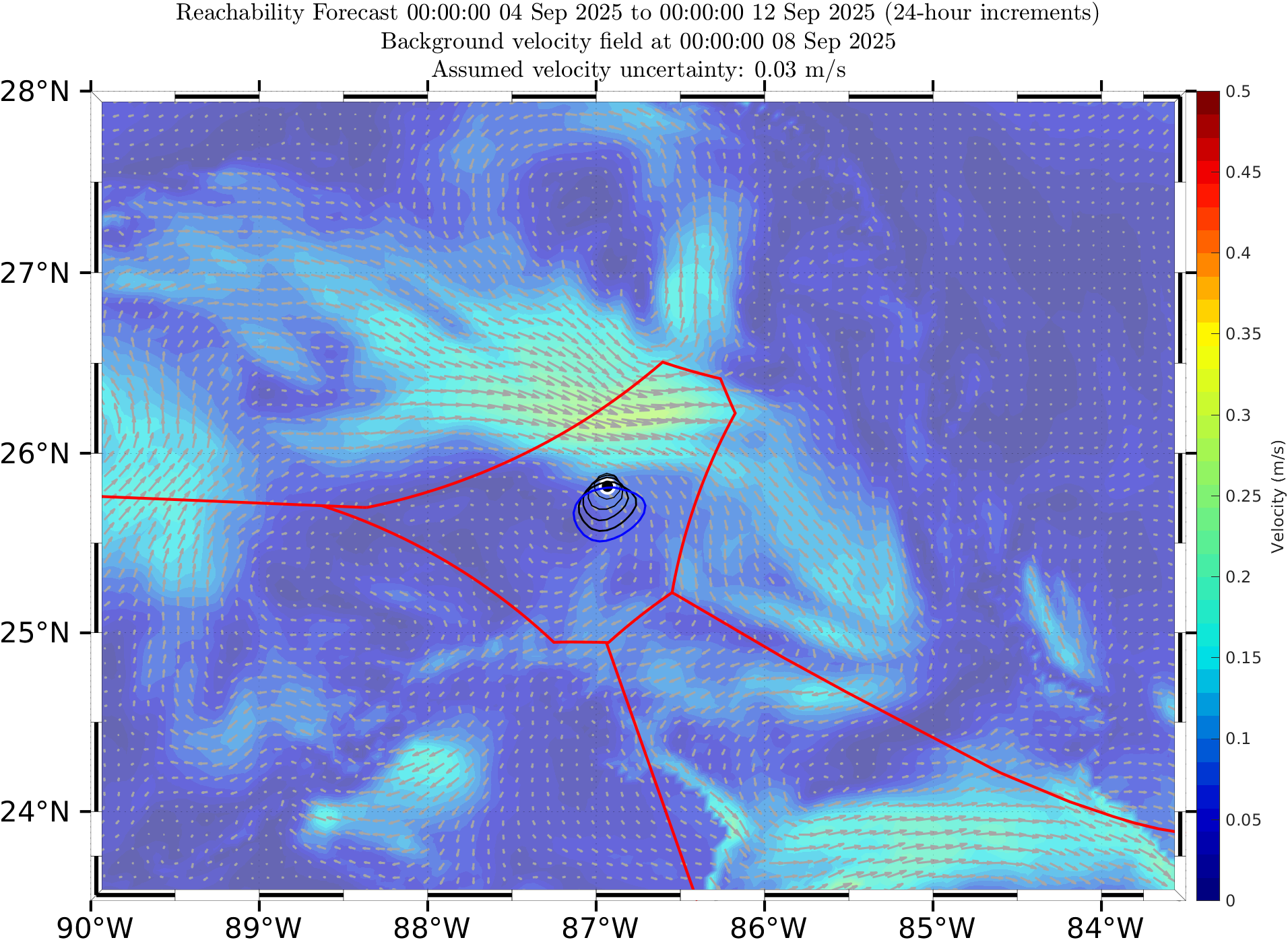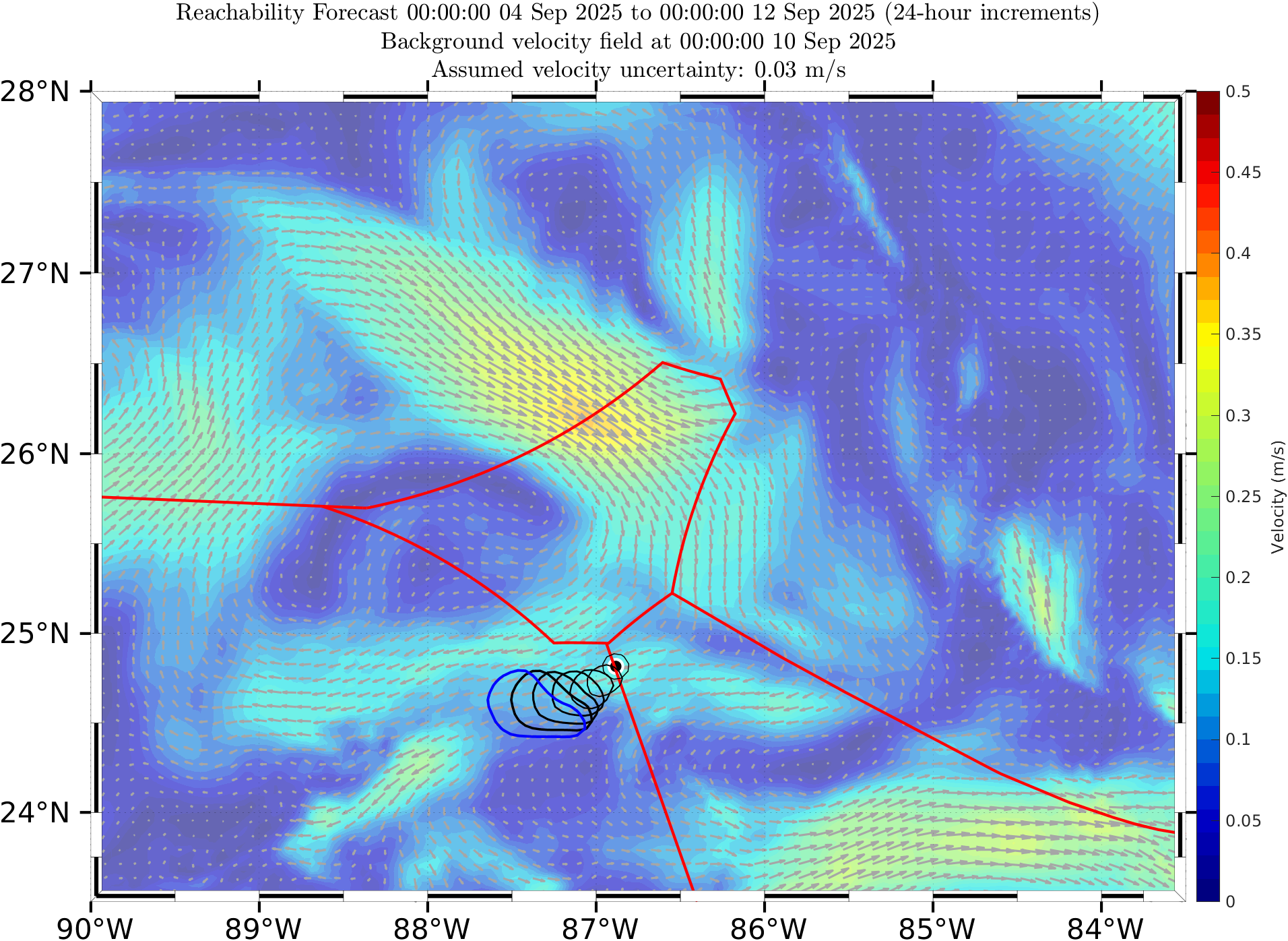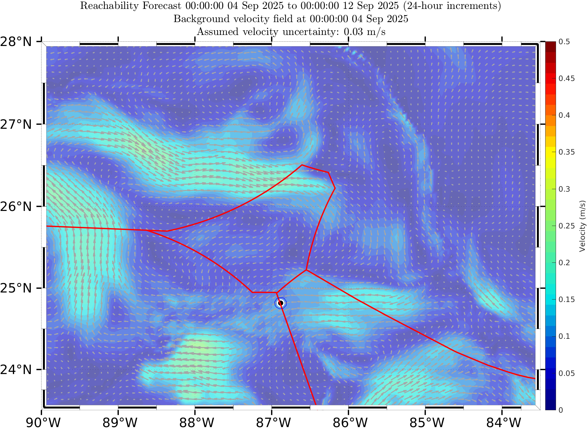 Starting points are located where the floats are anticipated to be at 0Z on 04 Sep 0000Z. All runs assume 3 cm/s velocity unc., and run for 8 days.