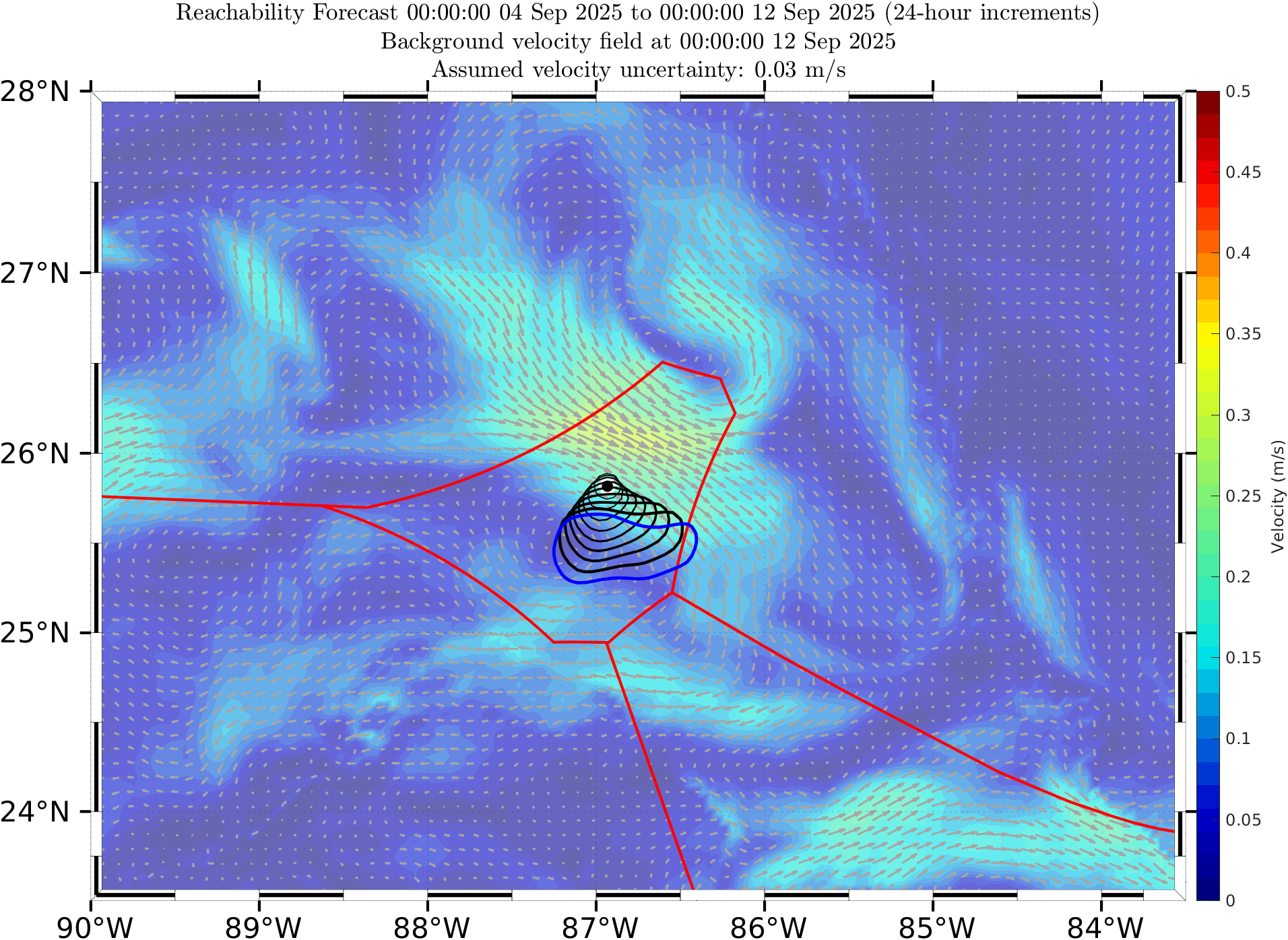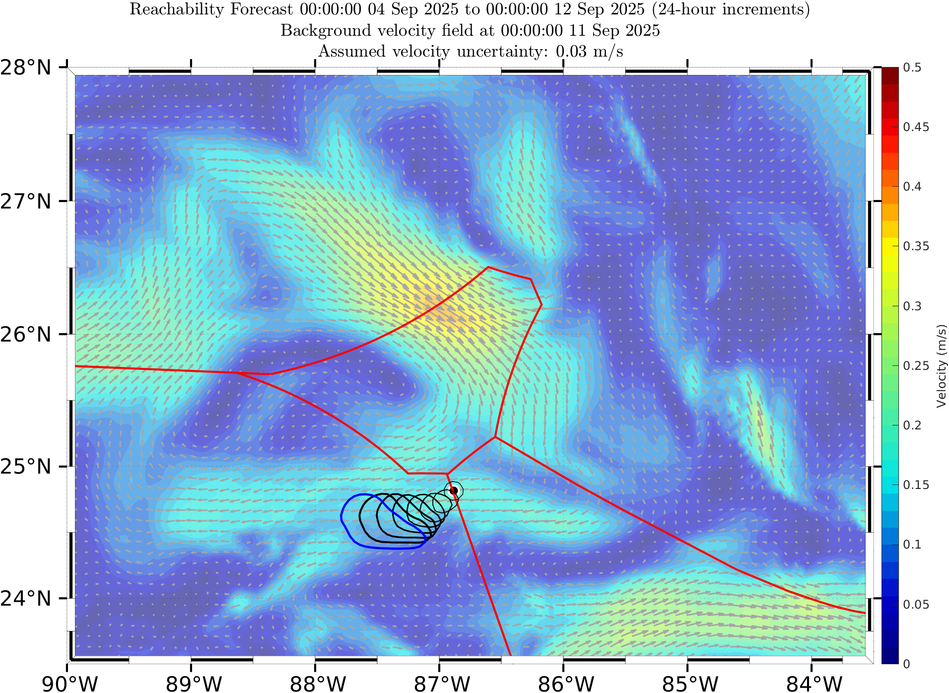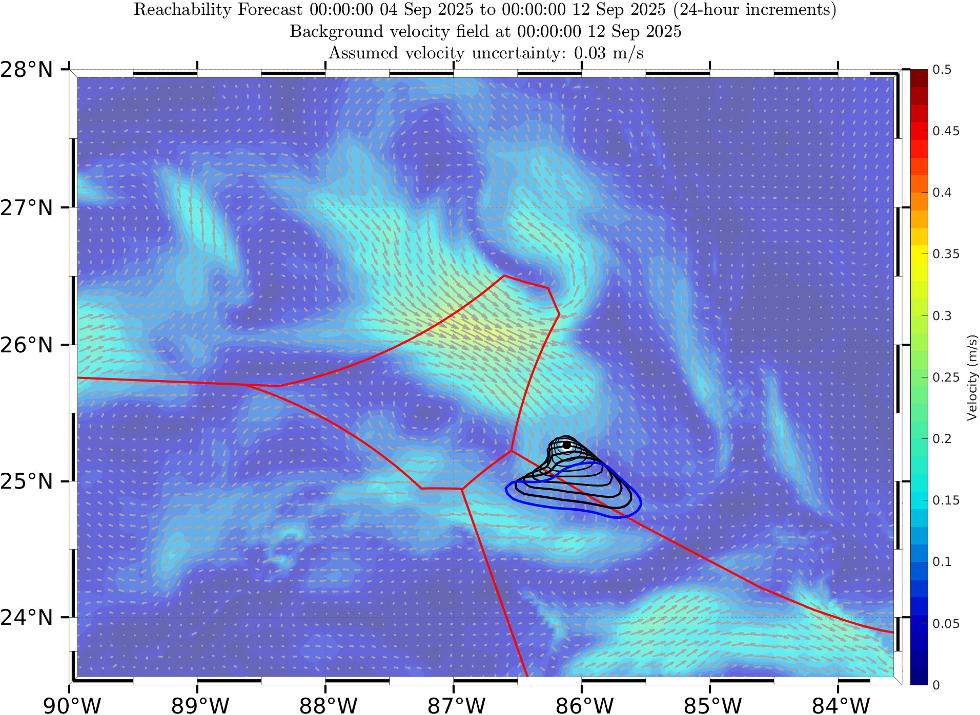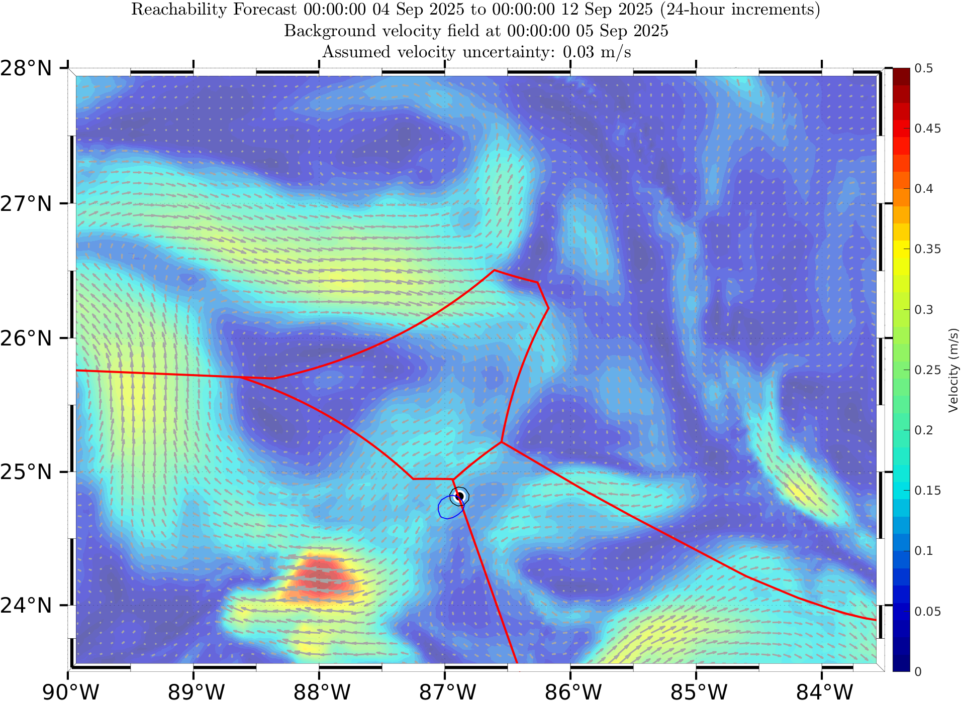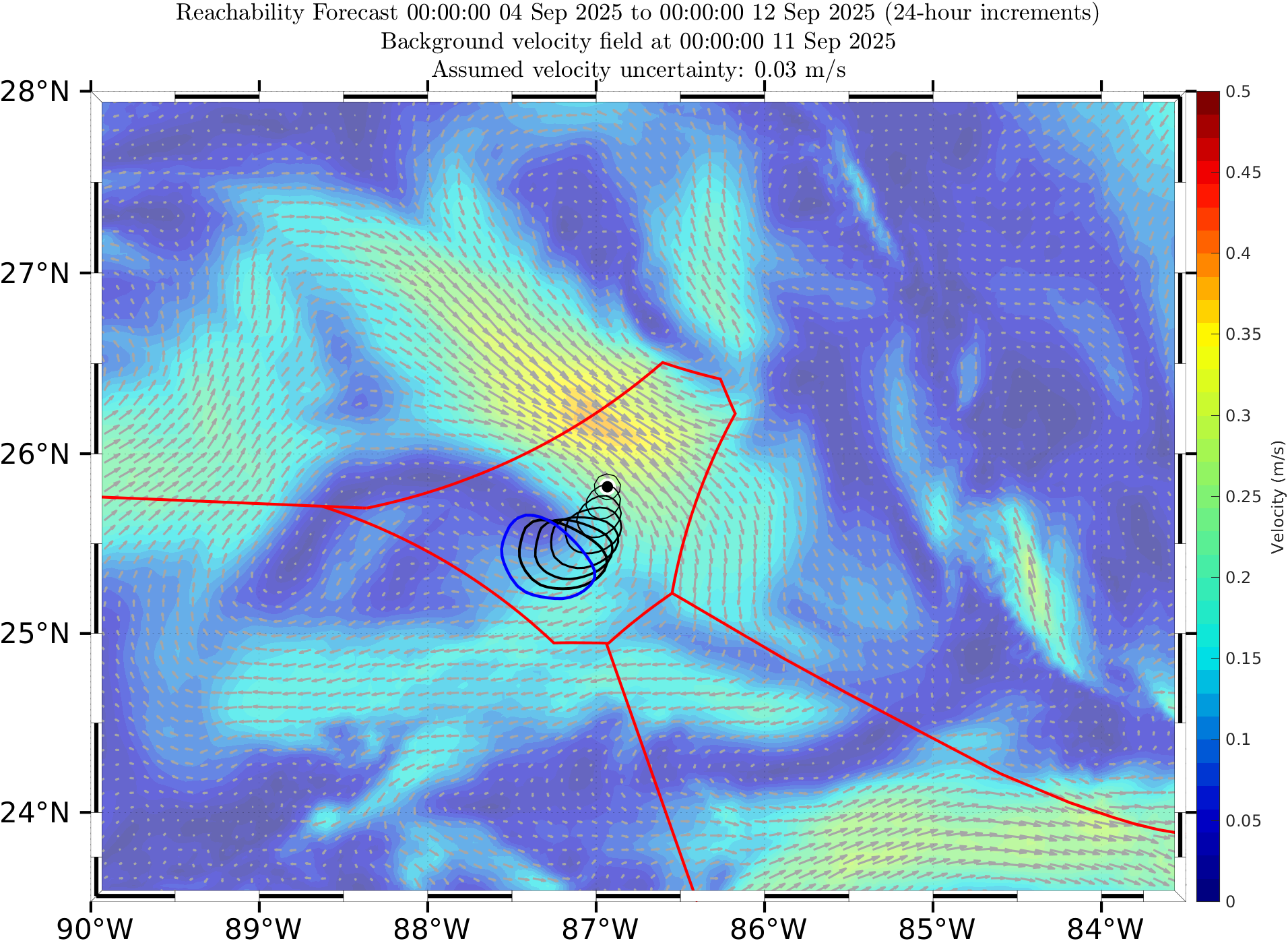 Starting points are located where the floats are anticipated to be at 0Z on 04 Sep 0000Z. All runs assume 3 cm/s velocity unc., and run for 8 days.