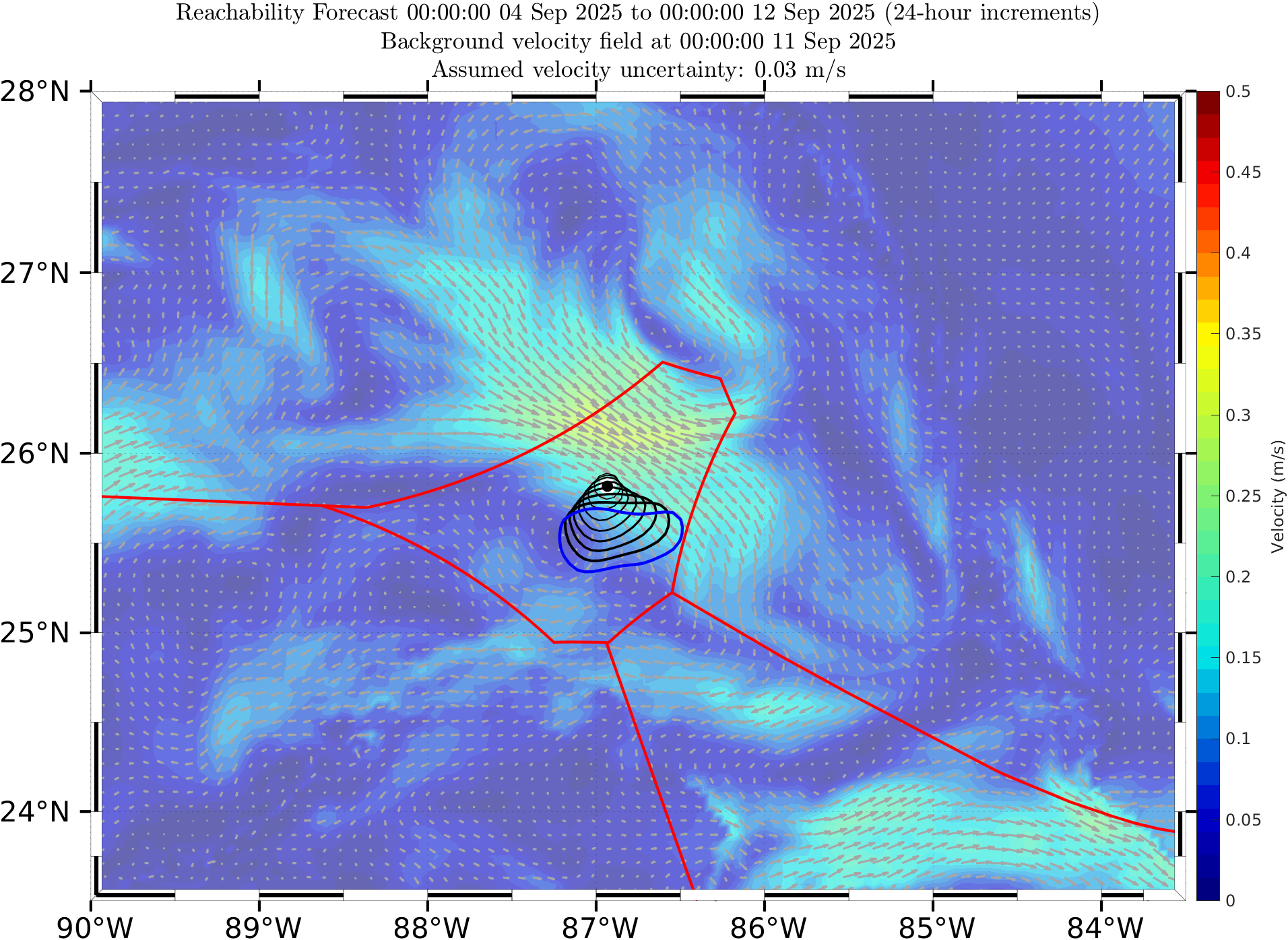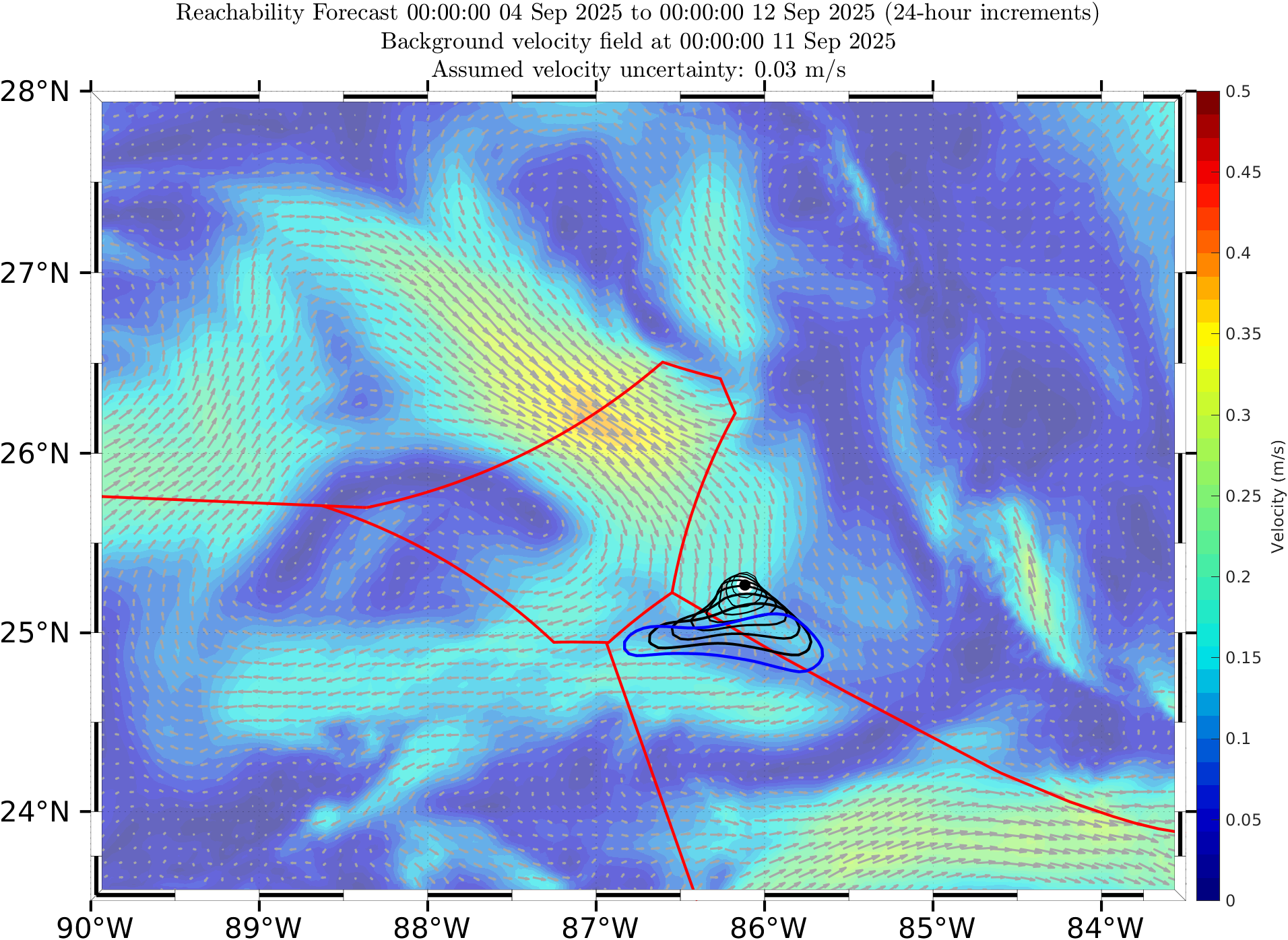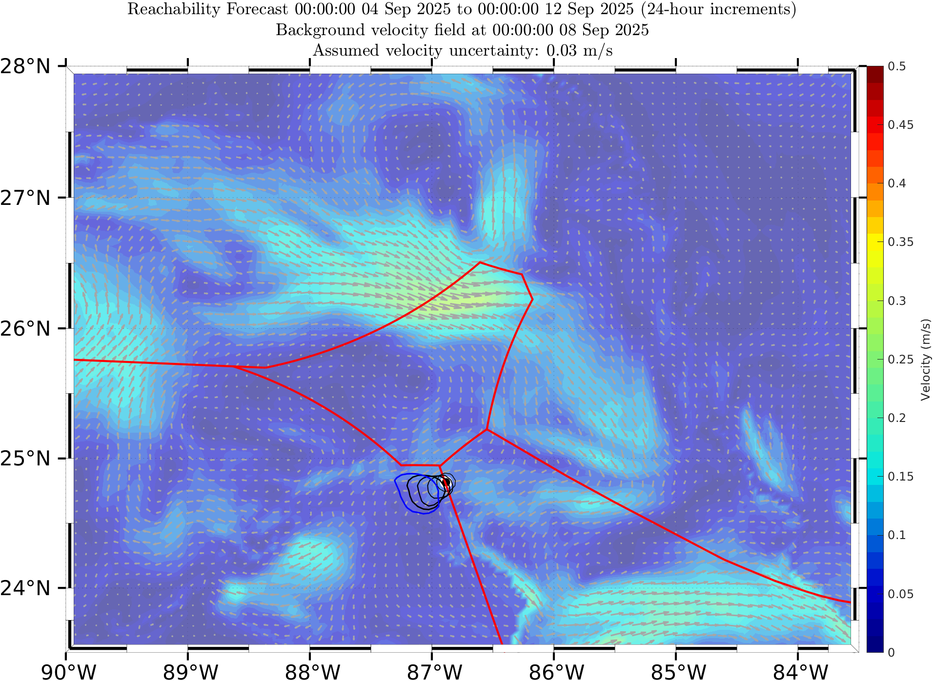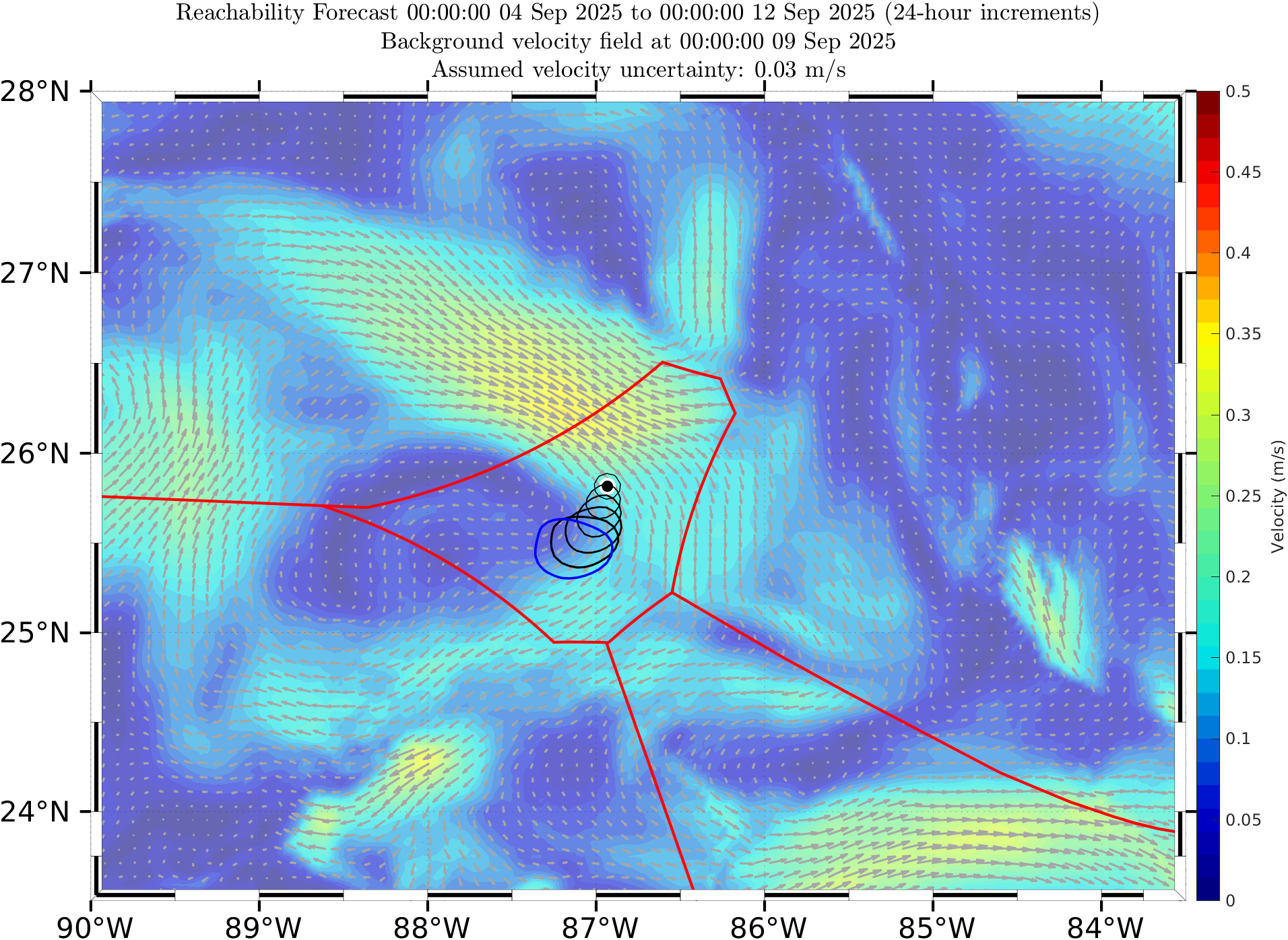 Starting points are located where the floats are anticipated to be at 0Z on 04 Sep 0000Z. All runs assume 3 cm/s velocity unc., and run for 8 days.