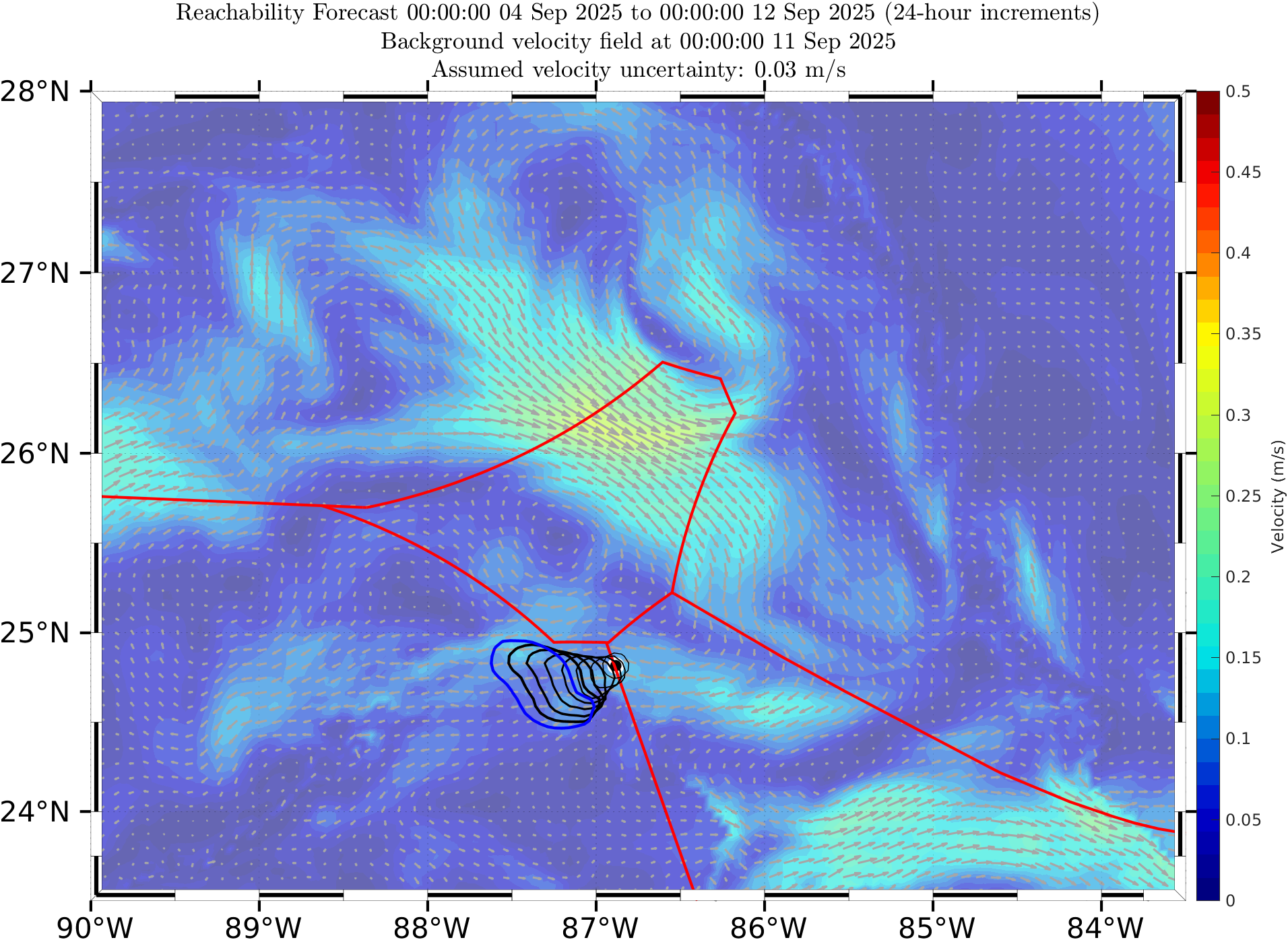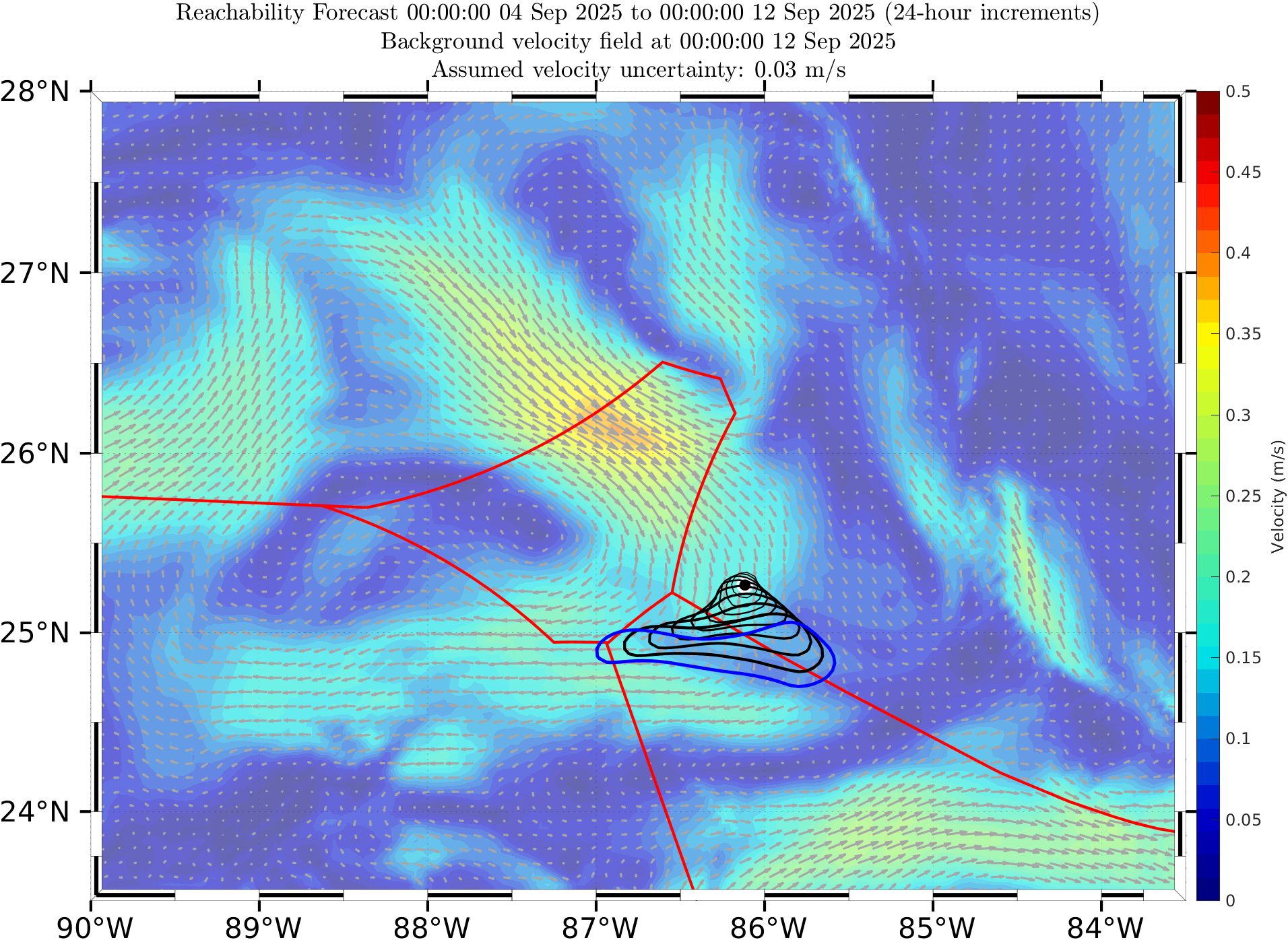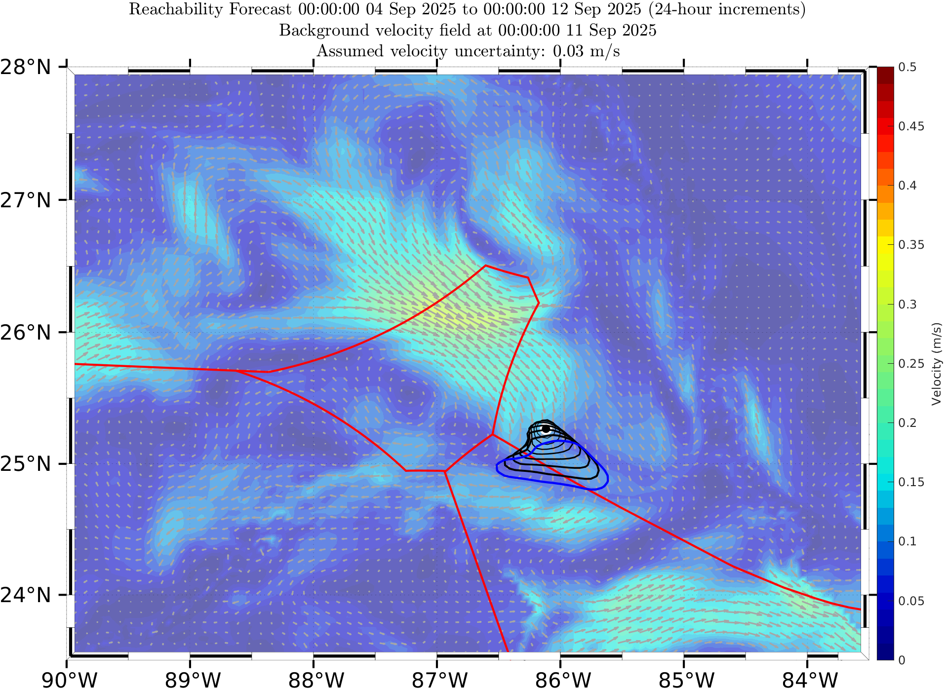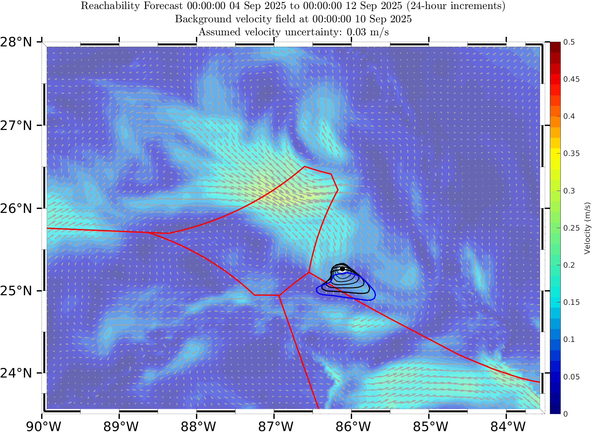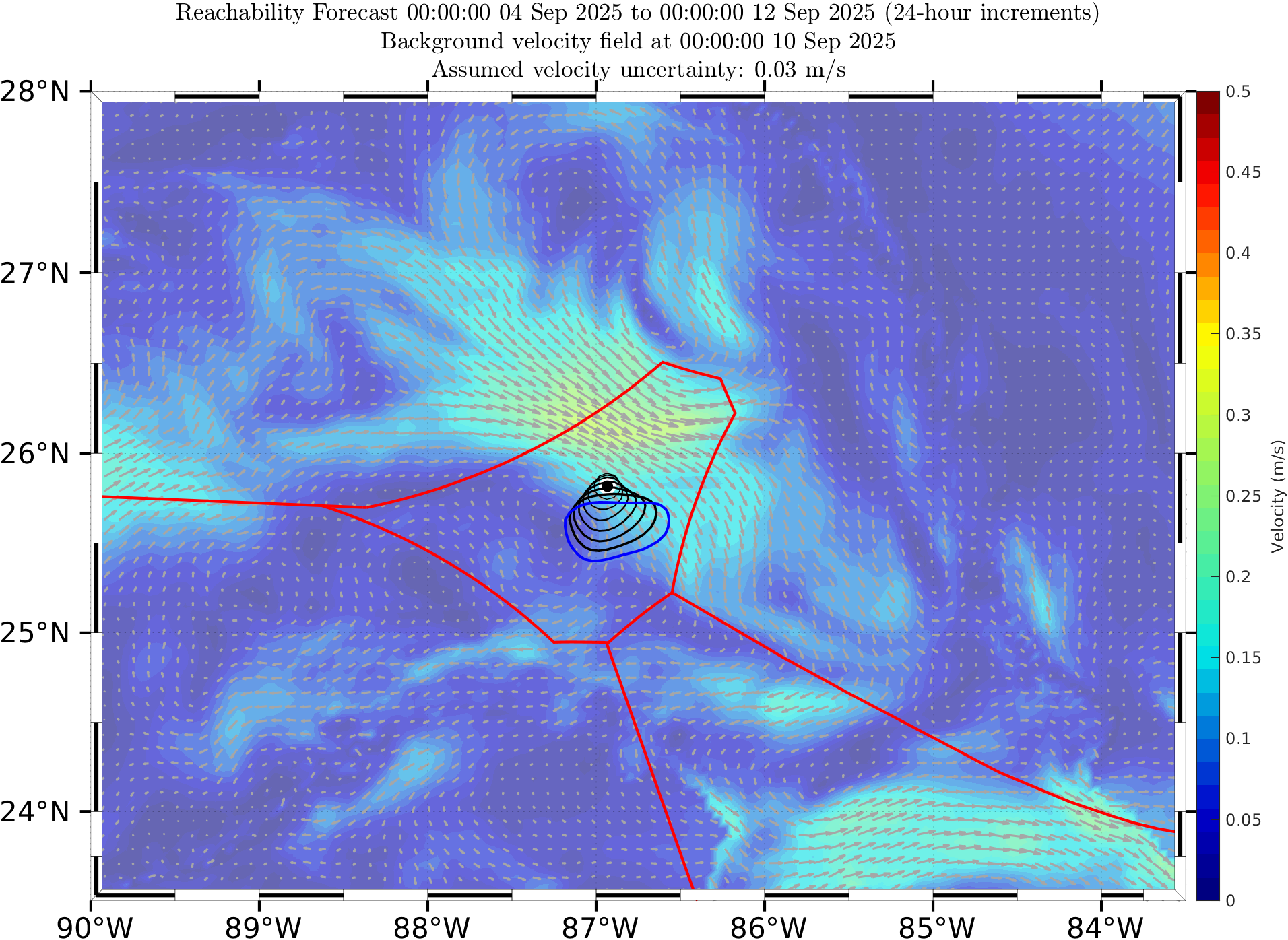 Starting points are located where the floats are anticipated to be at 0Z on 04 Sep 0000Z. All runs assume 3 cm/s velocity unc., and run for 8 days.