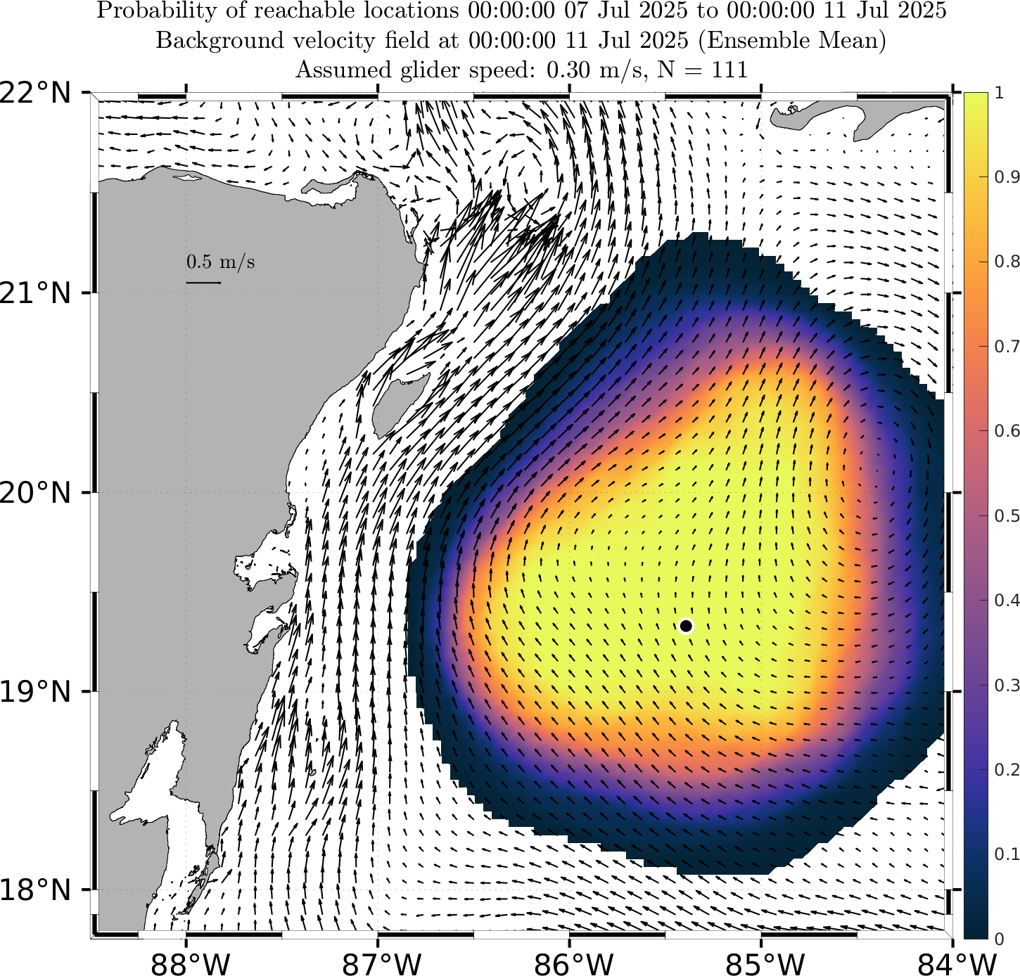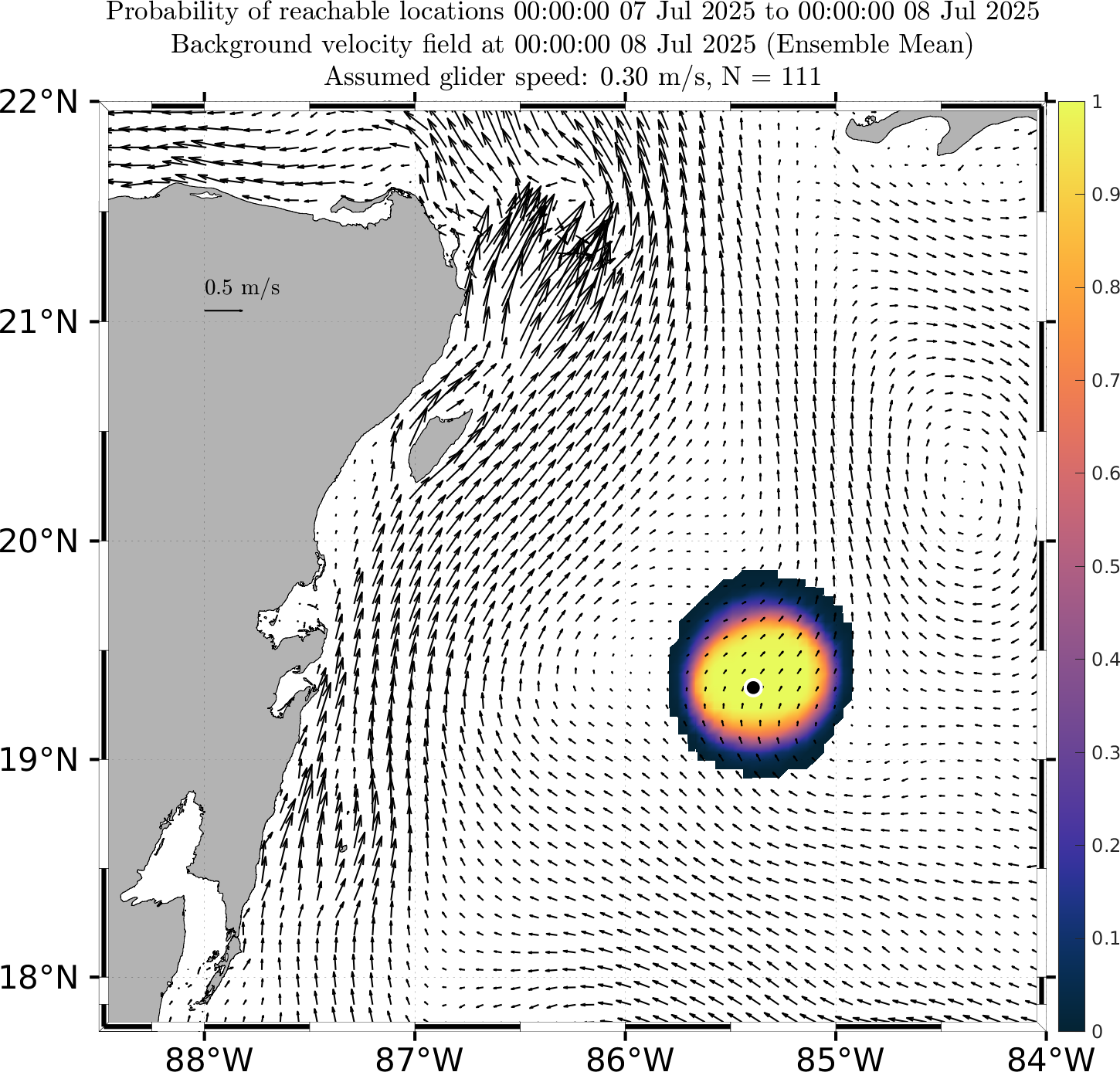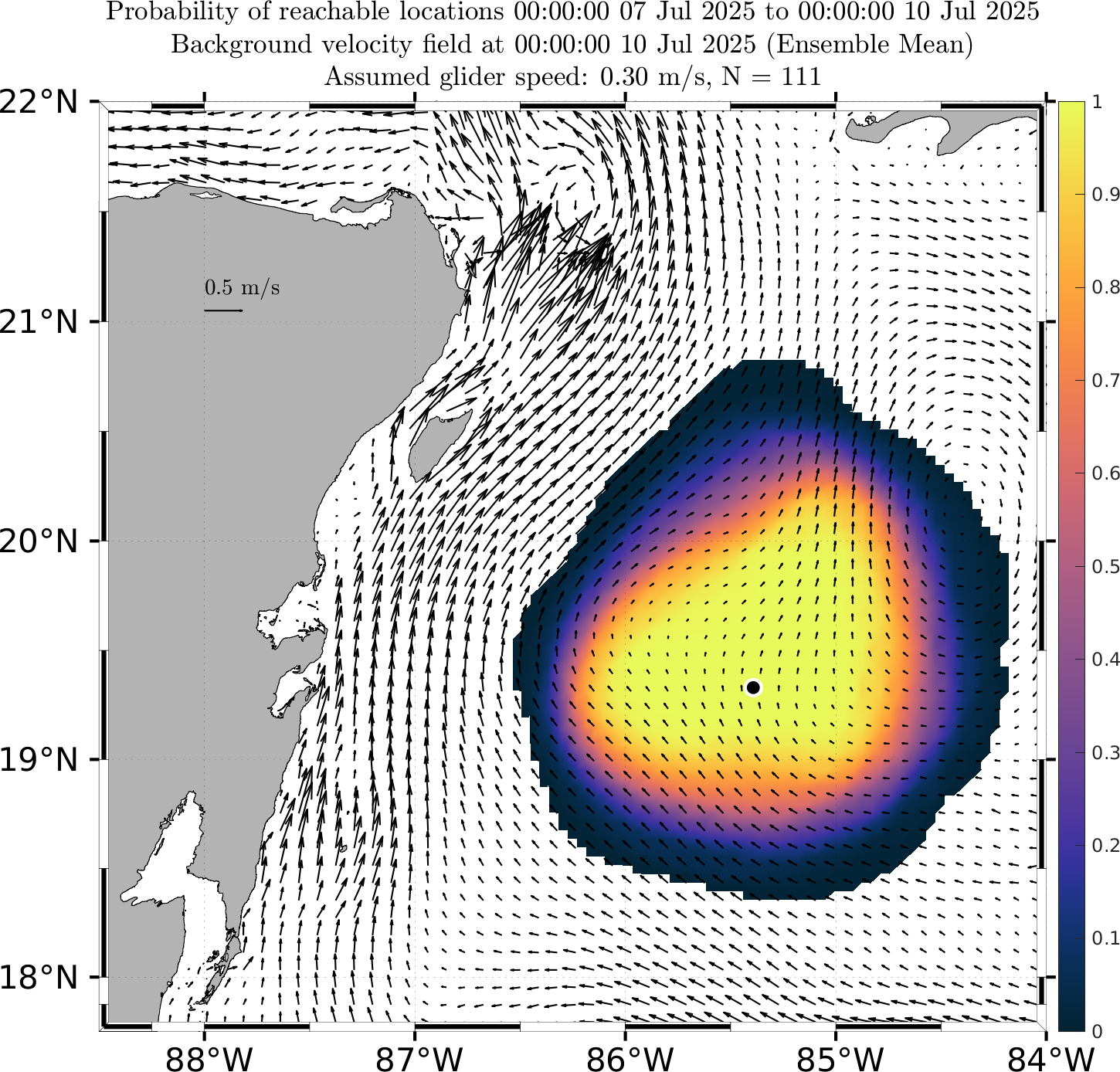 These probabilistic reachable maps are forecasts of the probability that a glider can reach a certain location at future times, given the uncertainty in the future ocean currents as forecast by our multi-model downscaled MSEAS ESSE ensemble forecasts.