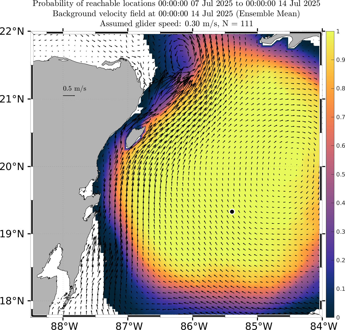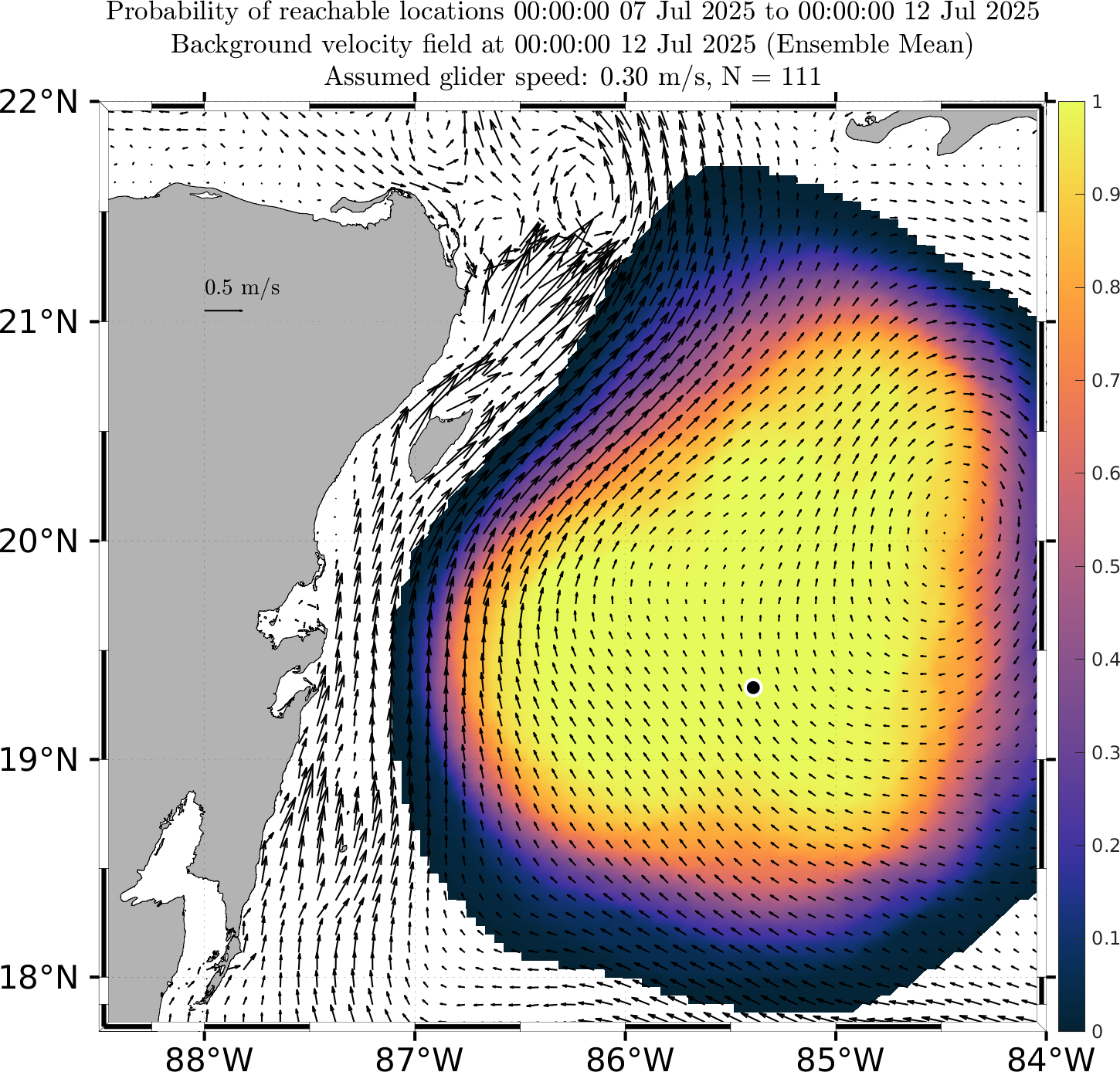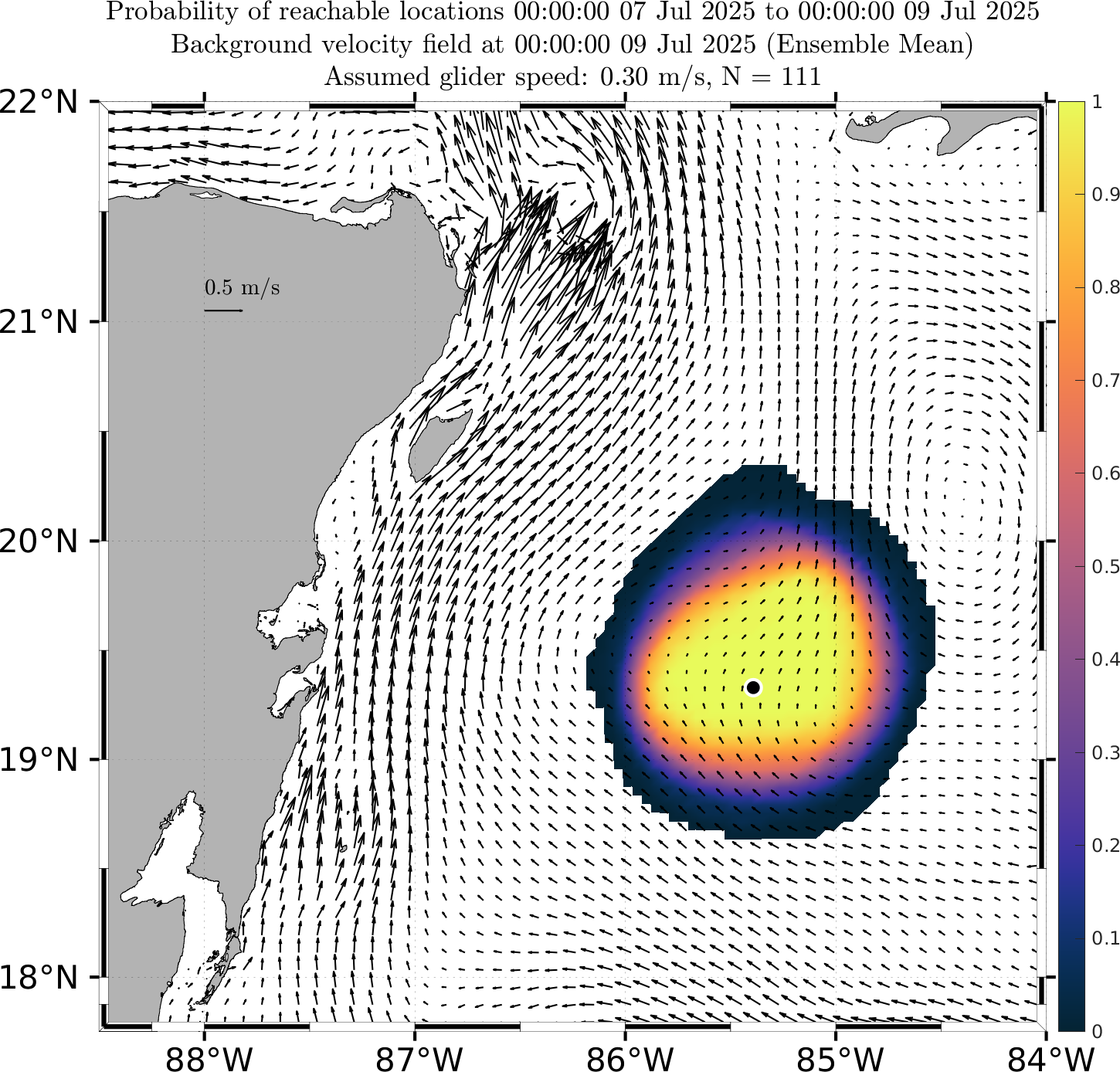 These probabilistic reachable maps are forecasts of the probability that a glider can reach a certain location at future times, given the uncertainty in the future ocean currents as forecast by our multi-model downscaled MSEAS ESSE ensemble forecasts.