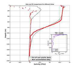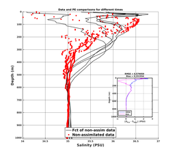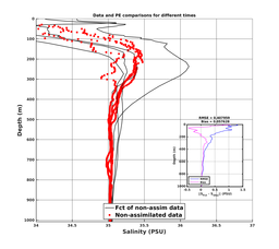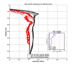 Comparisons of MSEAS-PE model forecasts to data at data locations. Black lines denote MSEAS-PE forecasts of the unused (i.e., independent) data; Gray lines denote MSEAS-PE forecasts of the used data (e.g., assimilated, if enabled for the run); Red dots denote unused (i.e., independent) data; and Green dots denote used data.