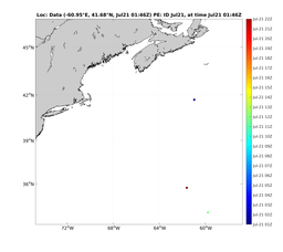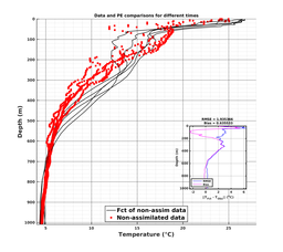 Comparisons of MSEAS-PE model forecasts to data at data locations. Black lines denote MSEAS-PE forecasts of the unused (i.e., independent) data; Gray lines denote MSEAS-PE forecasts of the used data (e.g., assimilated, if enabled for the run); Red dots denote unused (i.e., independent) data; and Green dots denote used data.