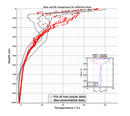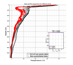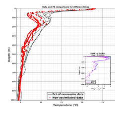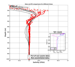 Comparisons of MSEAS-PE model forecasts to data at data locations. Black lines denote MSEAS-PE forecasts of the unused (i.e., independent) data; Gray lines denote MSEAS-PE forecasts of the used data (e.g., assimilated, if enabled for the run); Red dots denote unused (i.e., independent) data; and Green dots denote used data.