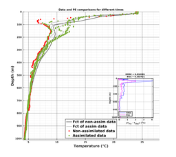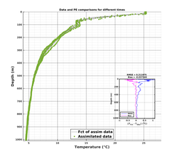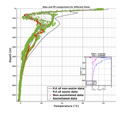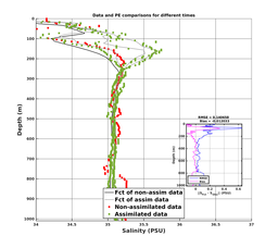 Comparisons of MSEAS-PE model forecasts to data at data locations. Black lines denote MSEAS-PE forecasts of the unused (i.e., independent) data; Gray lines denote MSEAS-PE forecasts of the used data (e.g., assimilated, if enabled for the run); Red dots denote unused (i.e., independent) data; and Green dots denote used data.