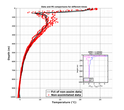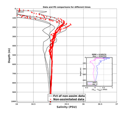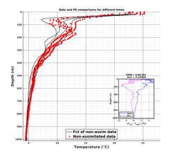 Comparisons of MSEAS-PE model forecasts to data at data locations. Black lines denote MSEAS-PE forecasts of the unused (i.e., independent) data; Gray lines denote MSEAS-PE forecasts of the used data (e.g., assimilated, if enabled for the run); Red dots denote unused (i.e., independent) data; and Green dots denote used data.