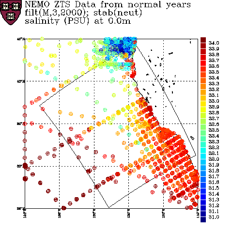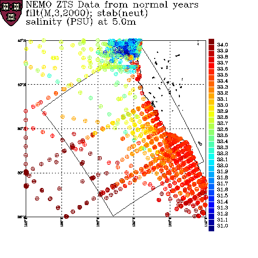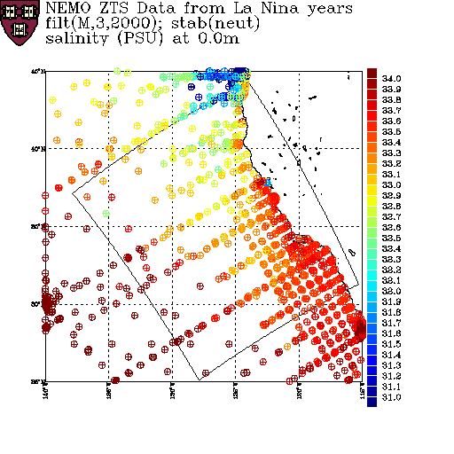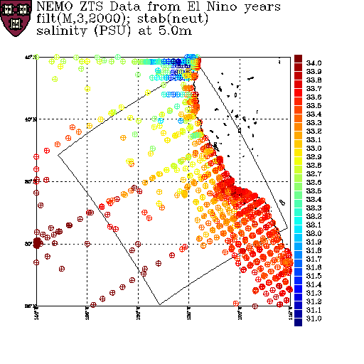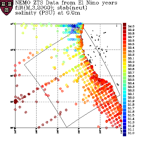 As a prelude to creating a climatology, summer data from the NEMO dataset is segregated according to whether the data is from an El Niño, a La Niña or a normal year. On this page, salinity data from these sets are displayed at various depths. The color scale is fixed for each depth, but varies with depth.
