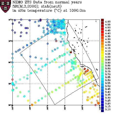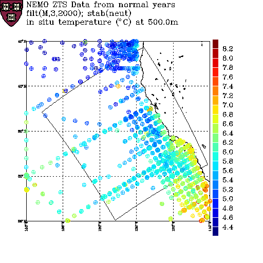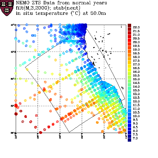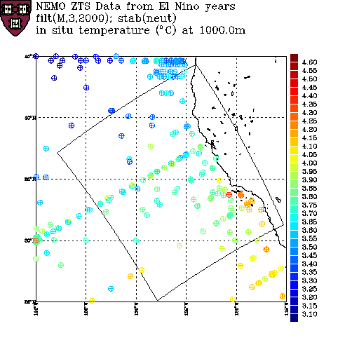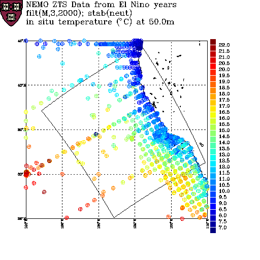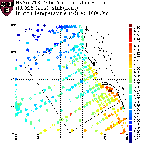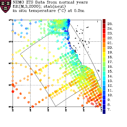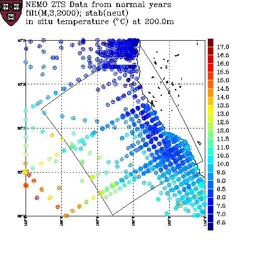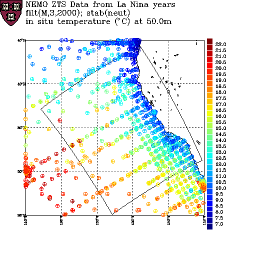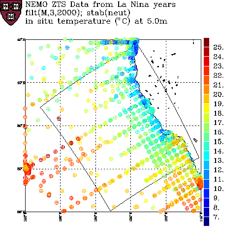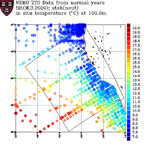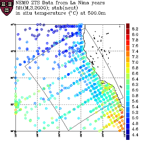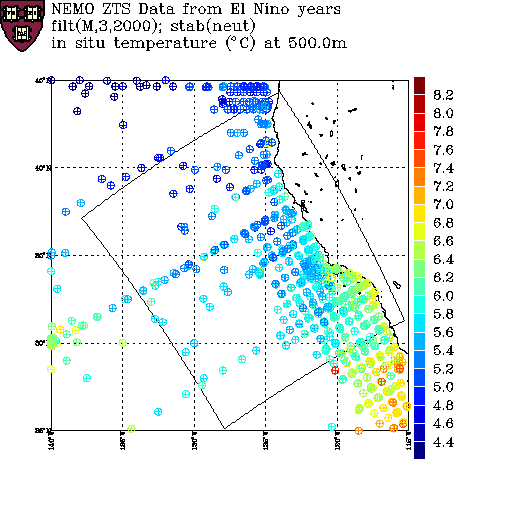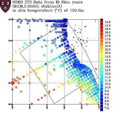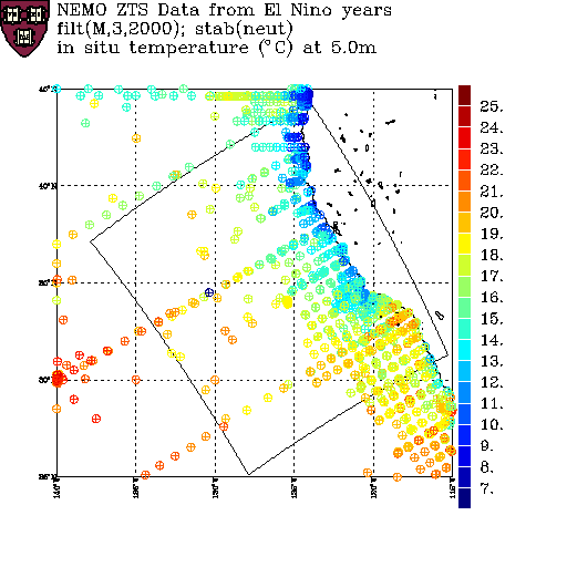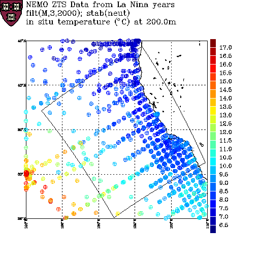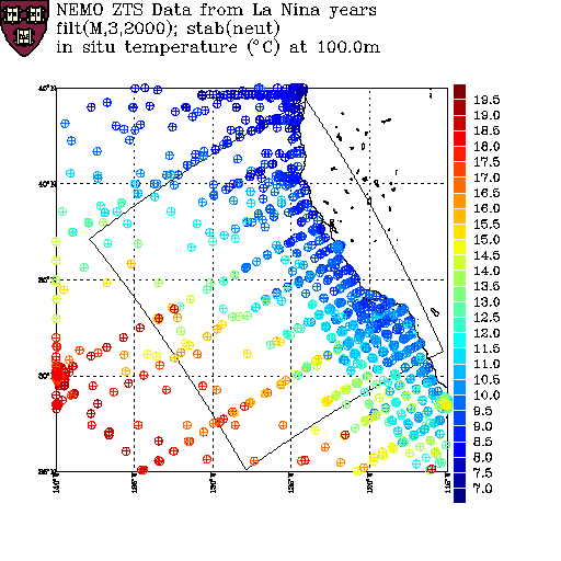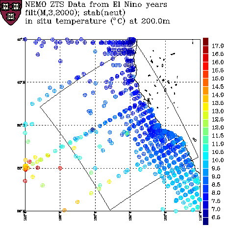 As a prelude to creating a climatology, summer data from the NEMO dataset is segregated according to whether the data is from an El Niño, a La Niña or a normal year. On this page, temperature data from these sets are displayed at various depths. The color scale is fixed for each depth, but varies with depth.