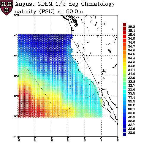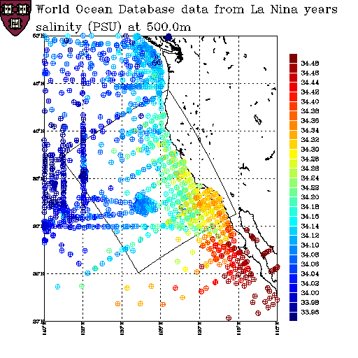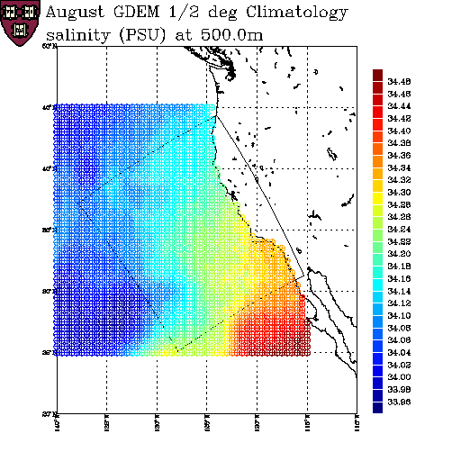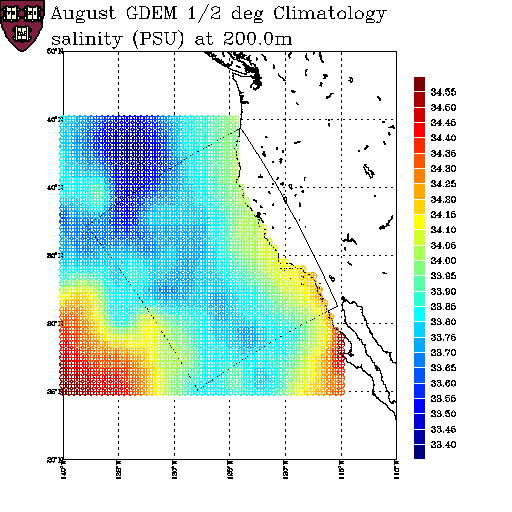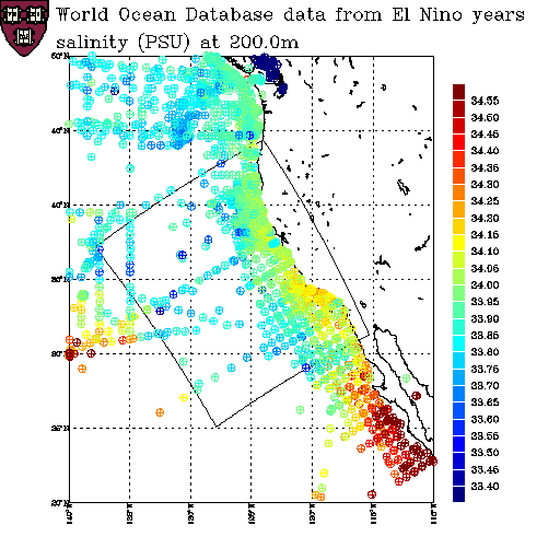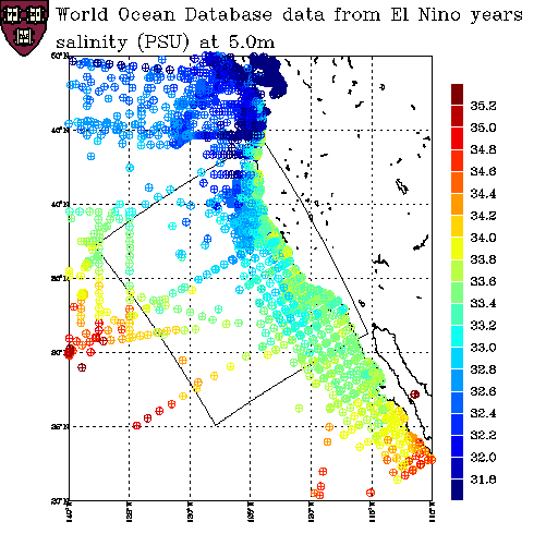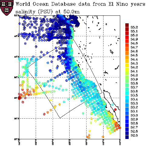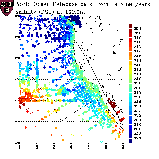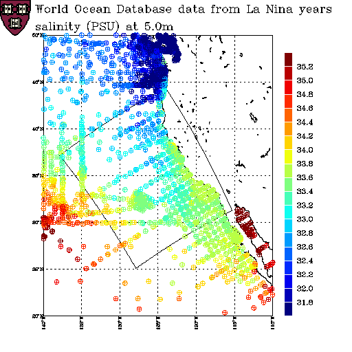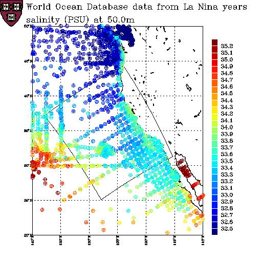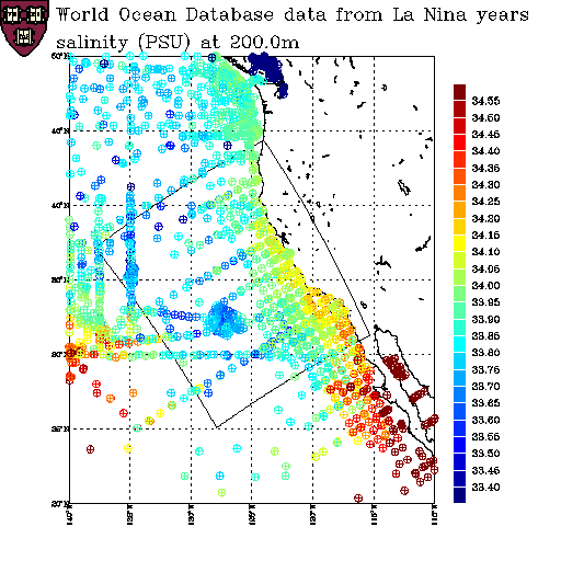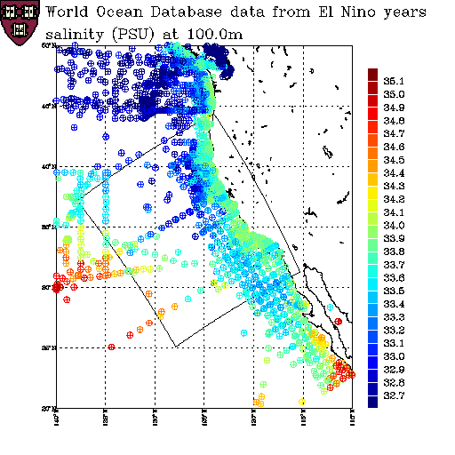 As a prelude to creating a climatology, summer data from the WOD dataset is segregated according to whether the data is from an El Niño, a La Niña or a normal year. On this page, salinity data from these sets are displayed at various depths. The color scale is fixed for each depth, but varies with depth. Also plotted are the GDEM august salinities