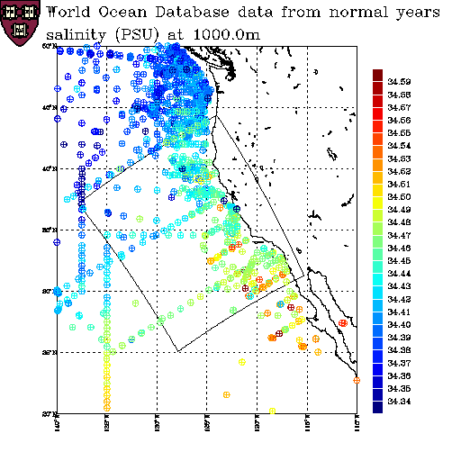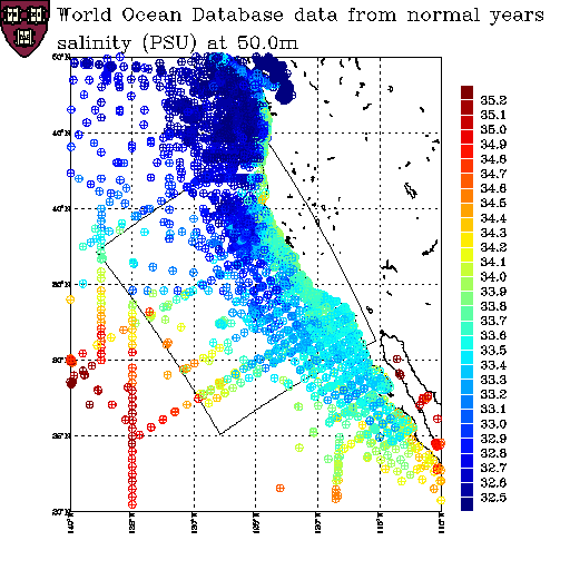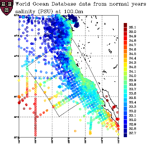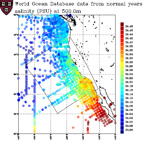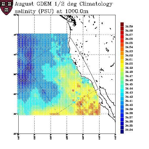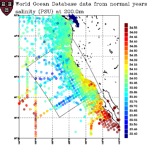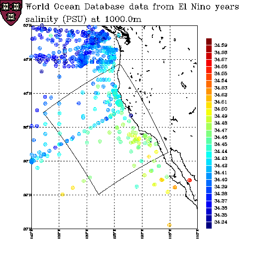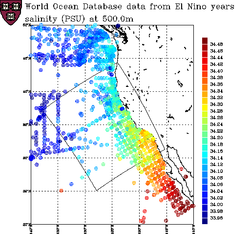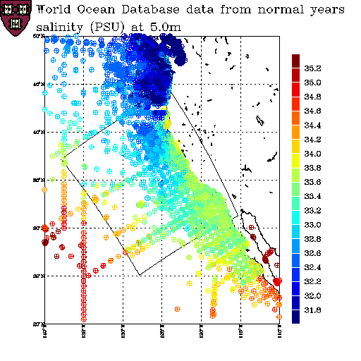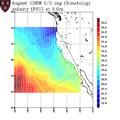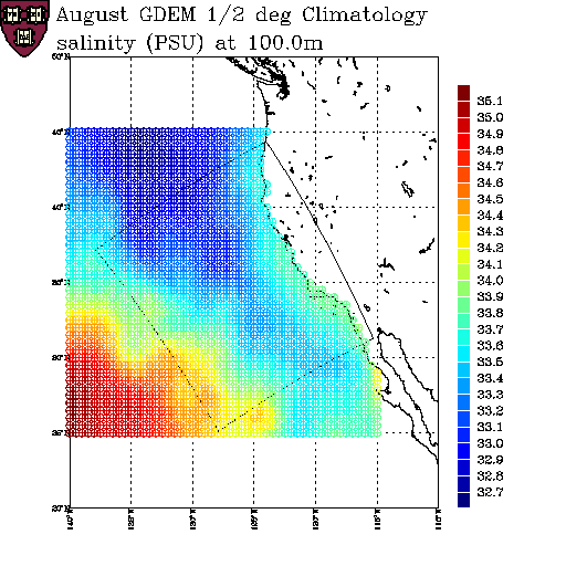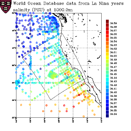 As a prelude to creating a climatology, summer data from the WOD dataset is segregated according to whether the data is from an El Niño, a La Niña or a normal year. On this page, salinity data from these sets are displayed at various depths. The color scale is fixed for each depth, but varies with depth. Also plotted are the GDEM august salinities