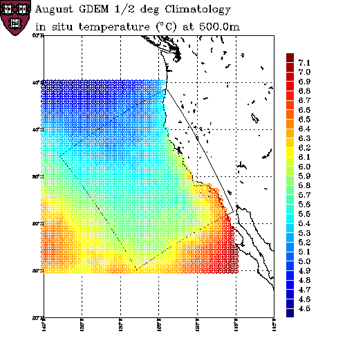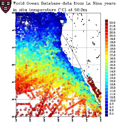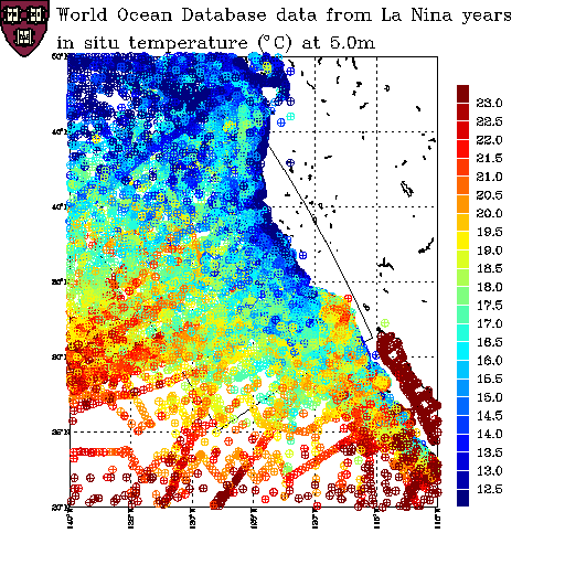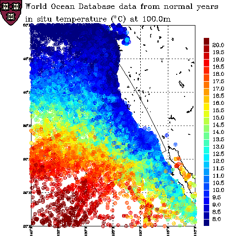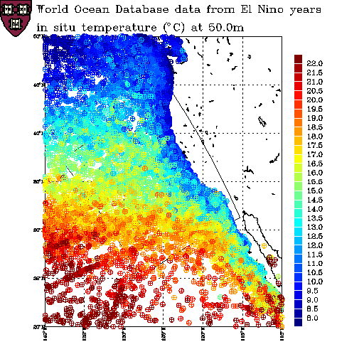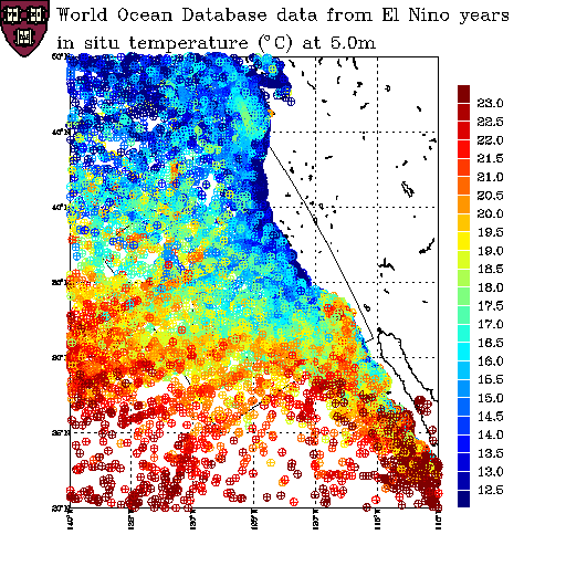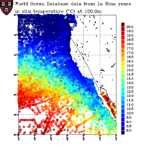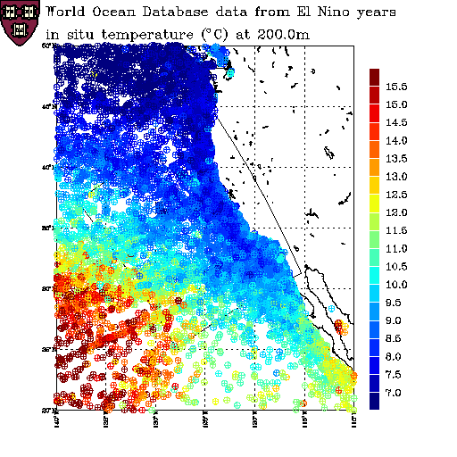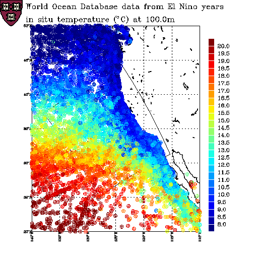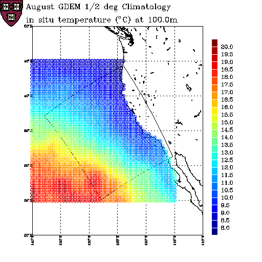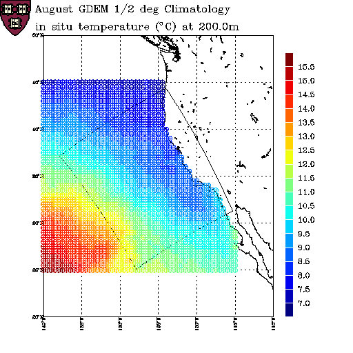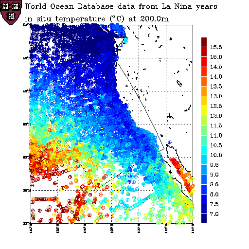 As a prelude to creating a climatology, summer data from the WOD dataset is segregated according to whether the data is from an El Niño, a La Niña or a normal year. On this page, temperature data from these sets are displayed at various depths. The color scale is fixed for each depth, but varies with depth. Also plotted are the GDEM august temperatures