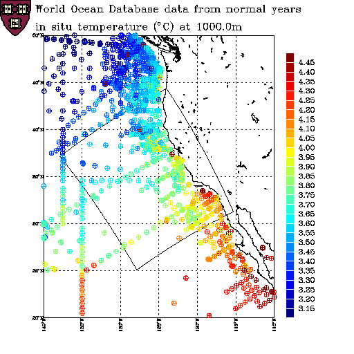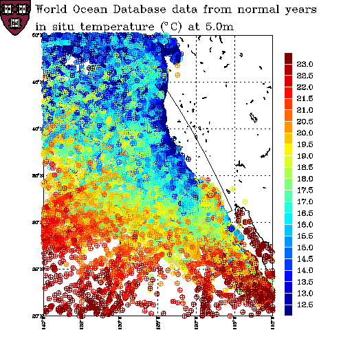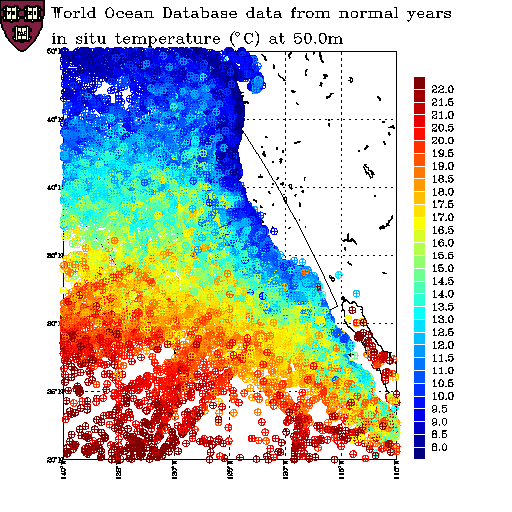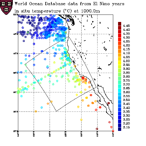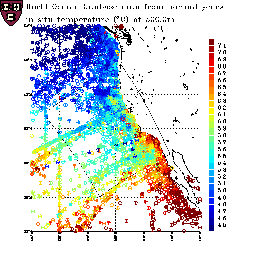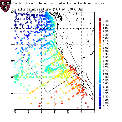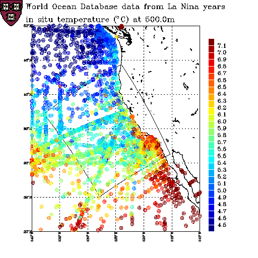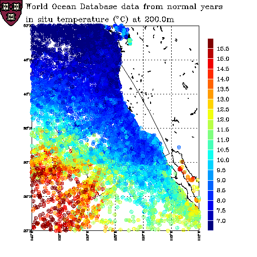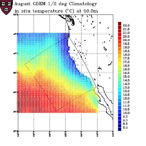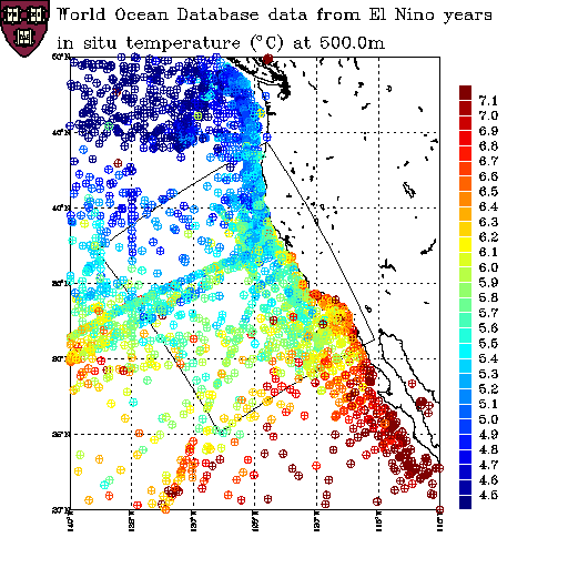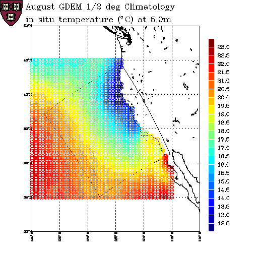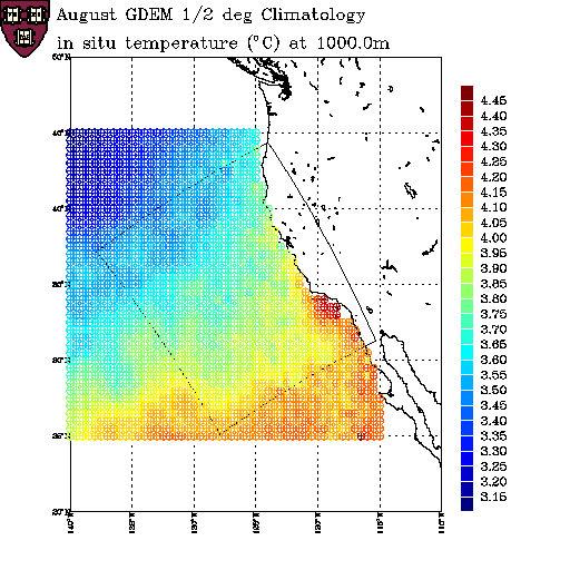As a prelude to creating a climatology, summer data from the WOD dataset is segregated according to whether the data is from an El Niño, a La Niña or a normal year. On this page, temperature data from these sets are displayed at various depths. The color scale is fixed for each depth, but varies with depth. Also plotted are the GDEM august temperatures