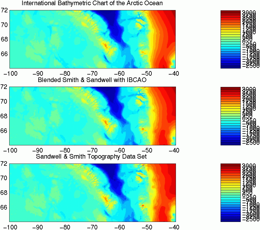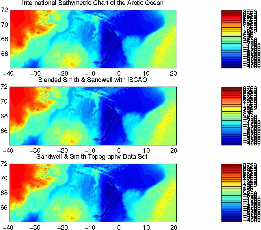 Below are comparisons of the IBCAO and Sandwell & Smith topographies in the regions where they overlap. Also included, in the middle panel is a blended topography which is a simple linear combination based on latitude. This blended topography for the North Atlantic can be obtained from here.