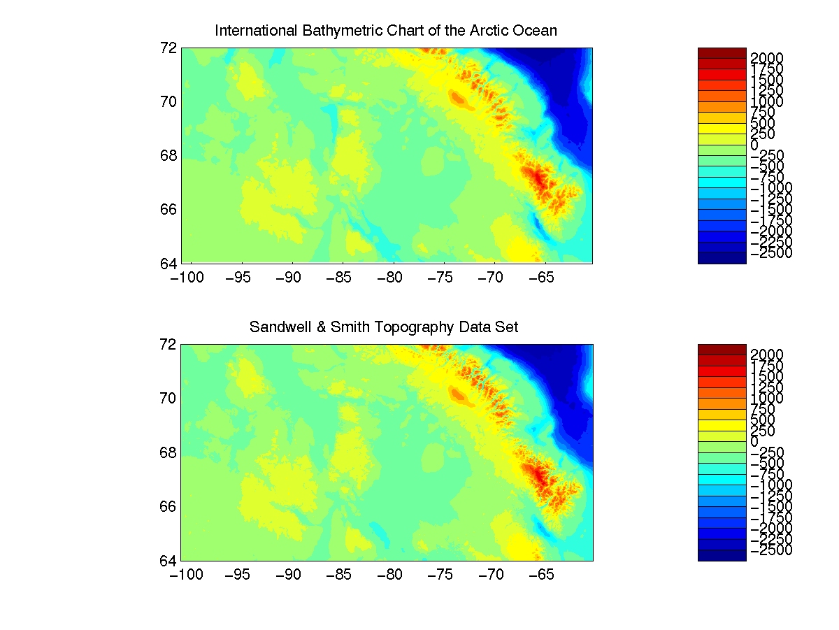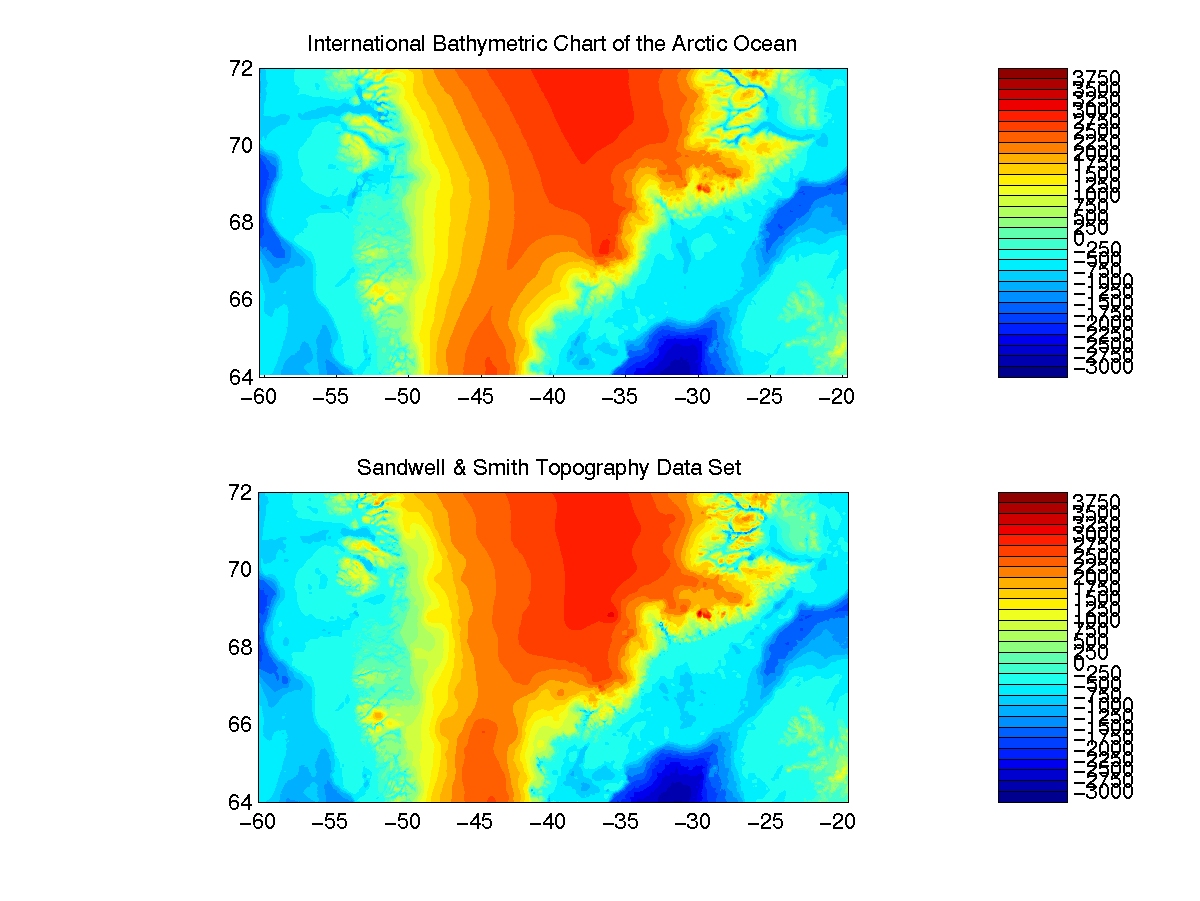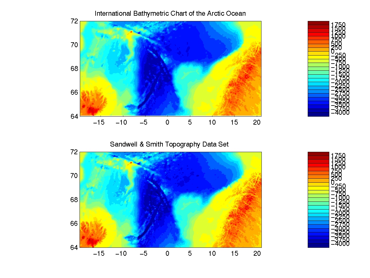 Below are comparisons of the IBCAO and Sandwell & Smith topographies in the regions where they overlap. Each small image is a link to a large comparison image for a given longitude range. The colors should be consistent within an image but differ from image to image. I haven't included difference comparisons, because the topographies are currently on slightly different grids.