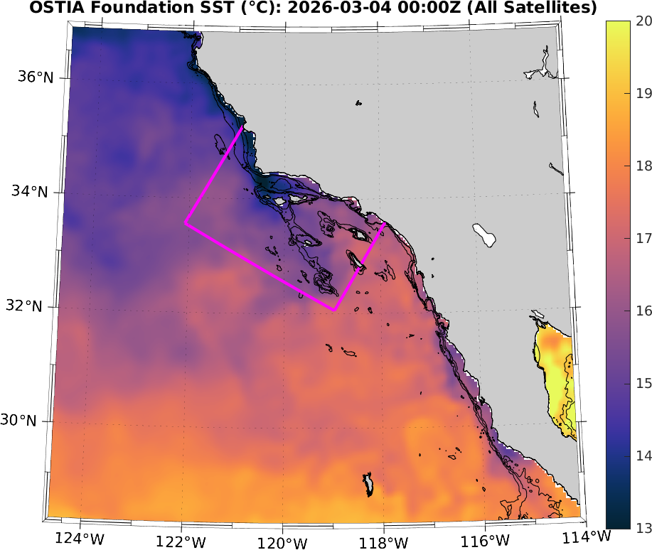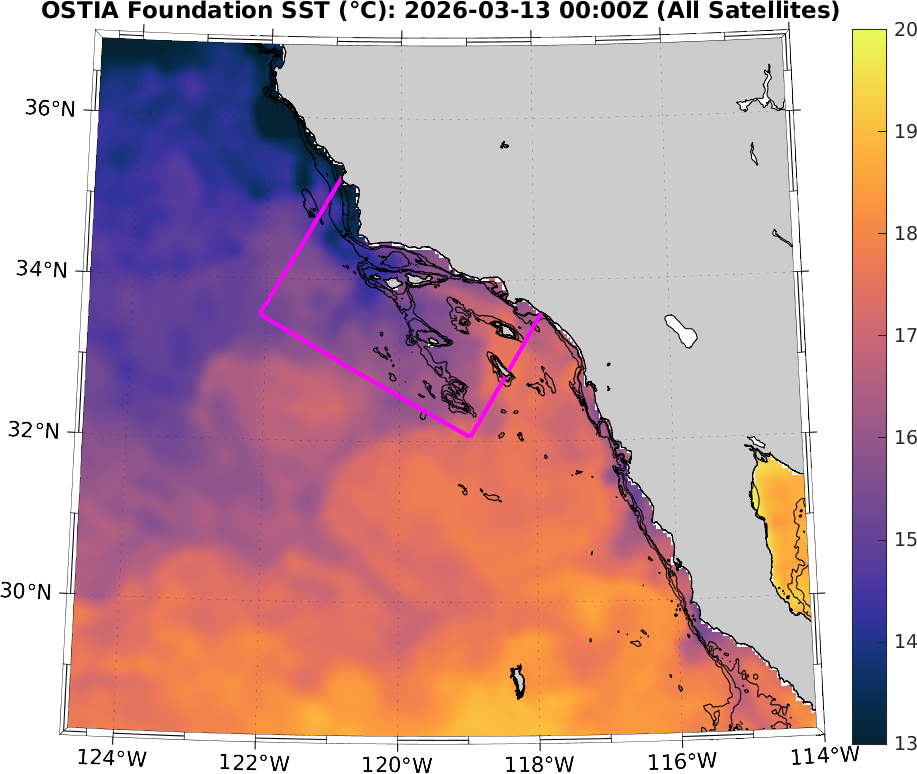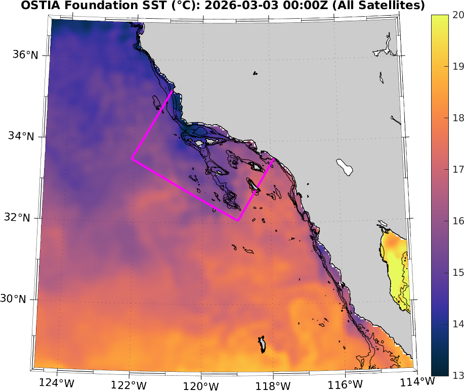MetOffice/CMEMS OSTIA SST Analysis (Daily 0.05°), Southern California–Baja California domain: March 2026